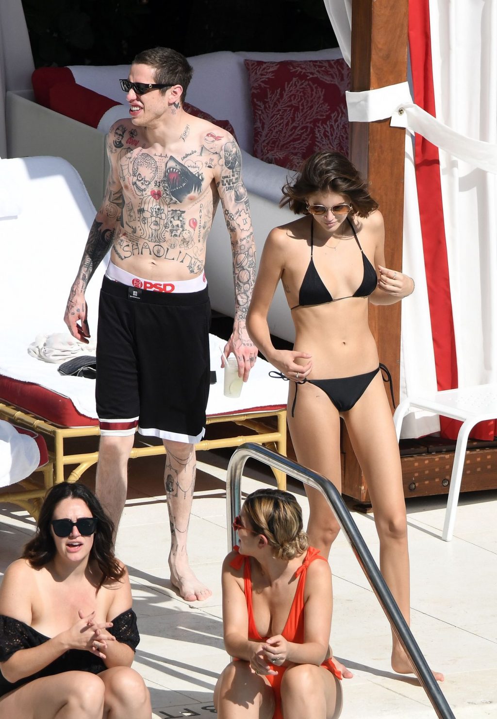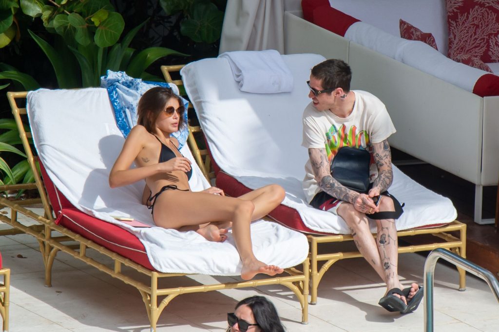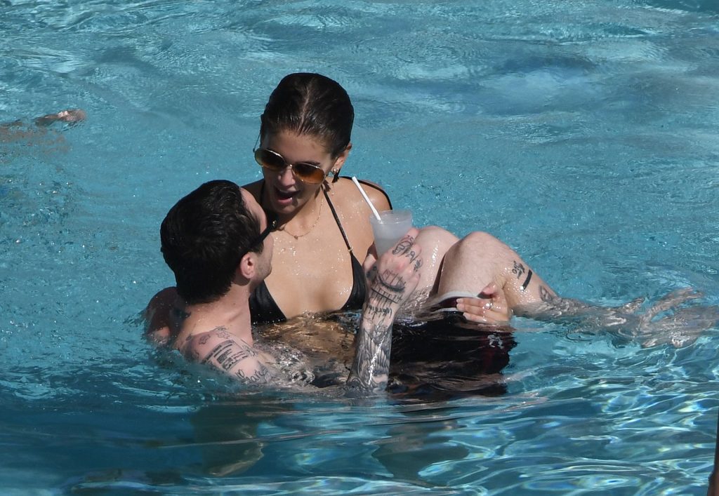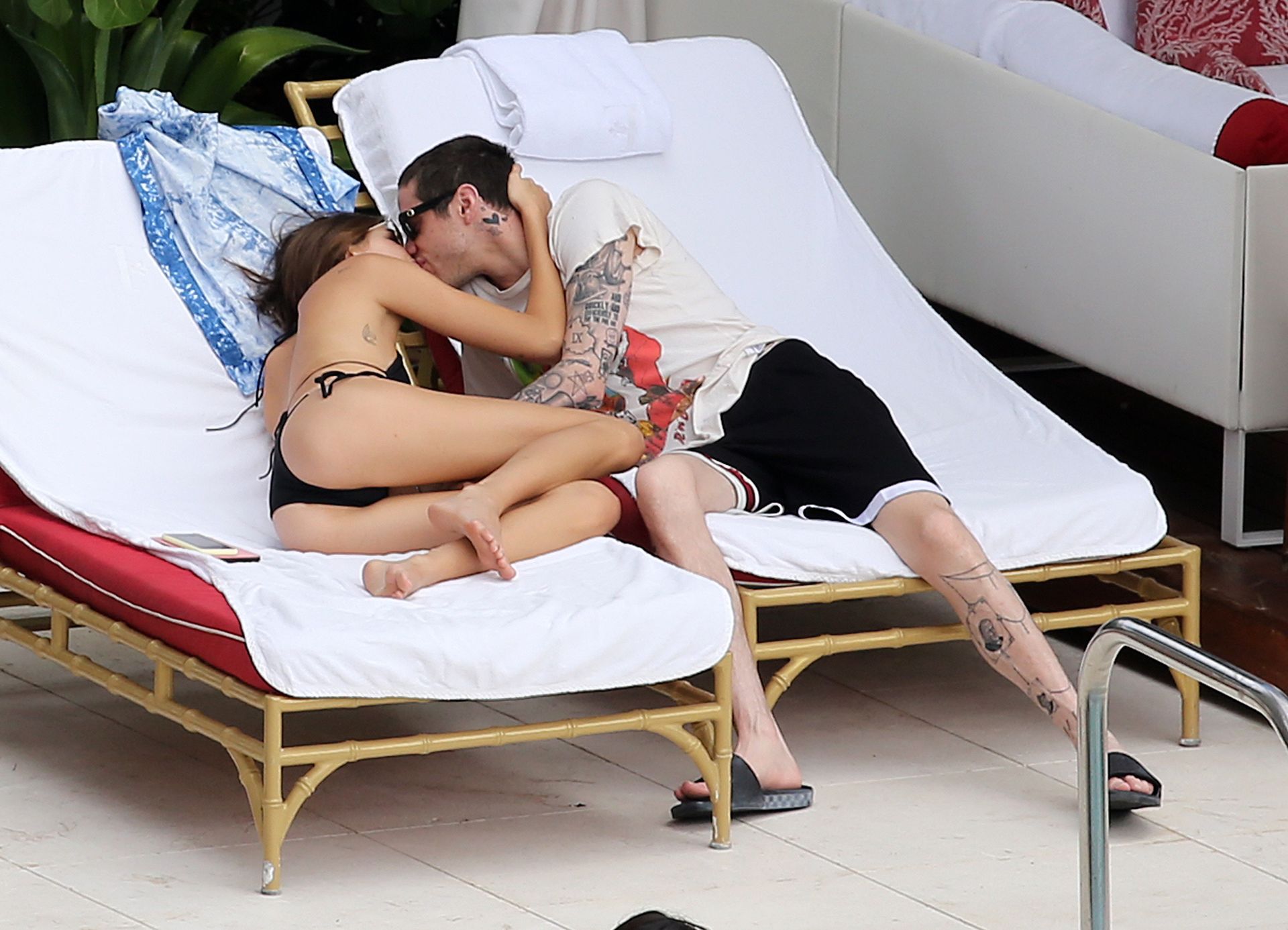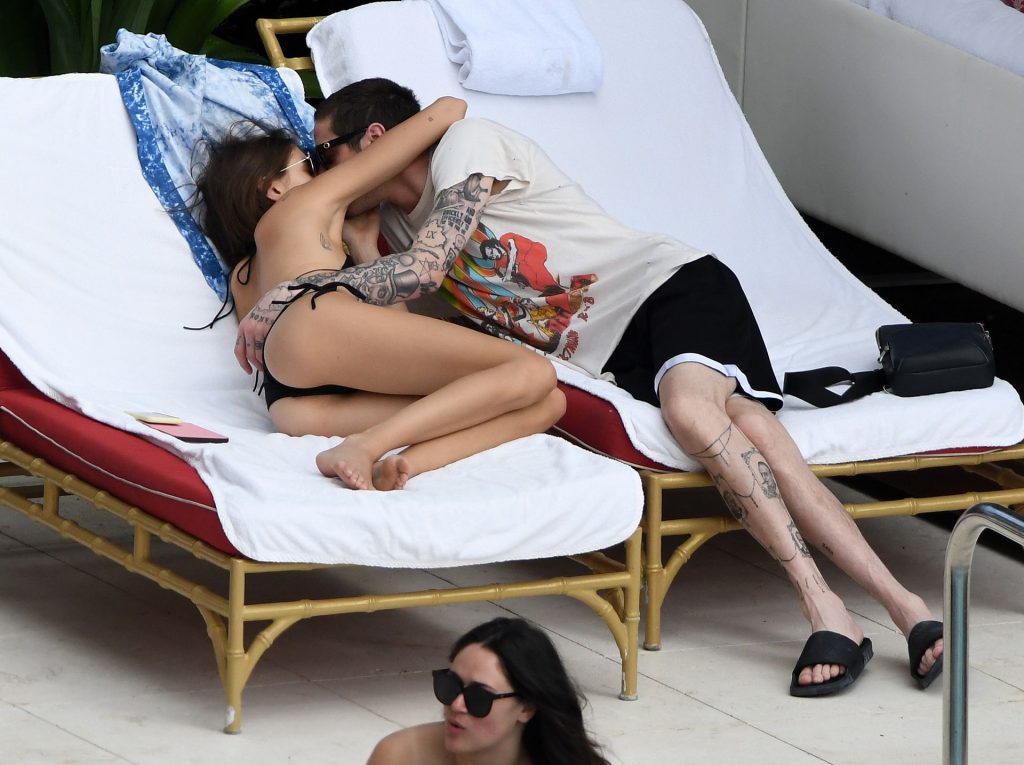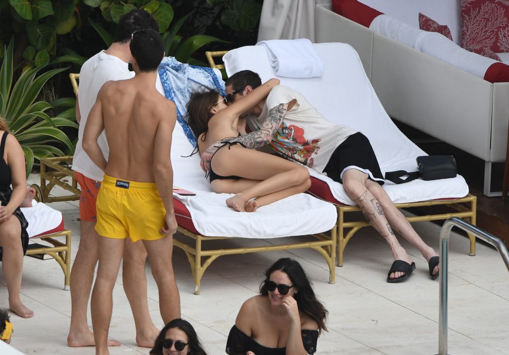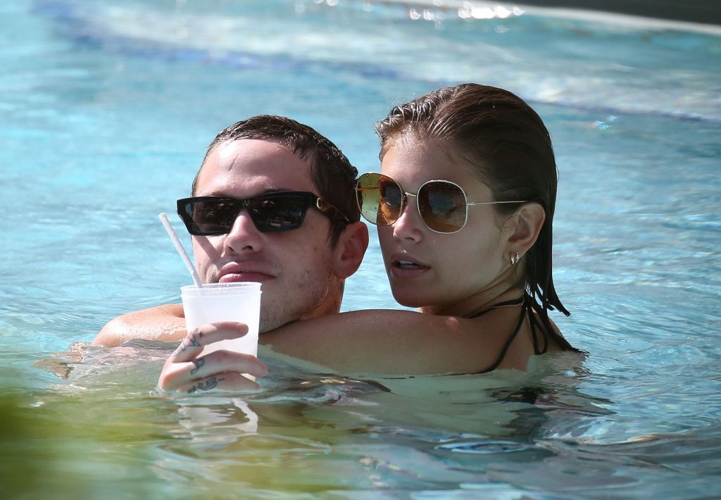 Дочь Синди Кроуфорд, модель Каия Гербер, в черном бикини целует своего парня Пита Дэвидсона у бассейна в Майами, 23.11.2019.