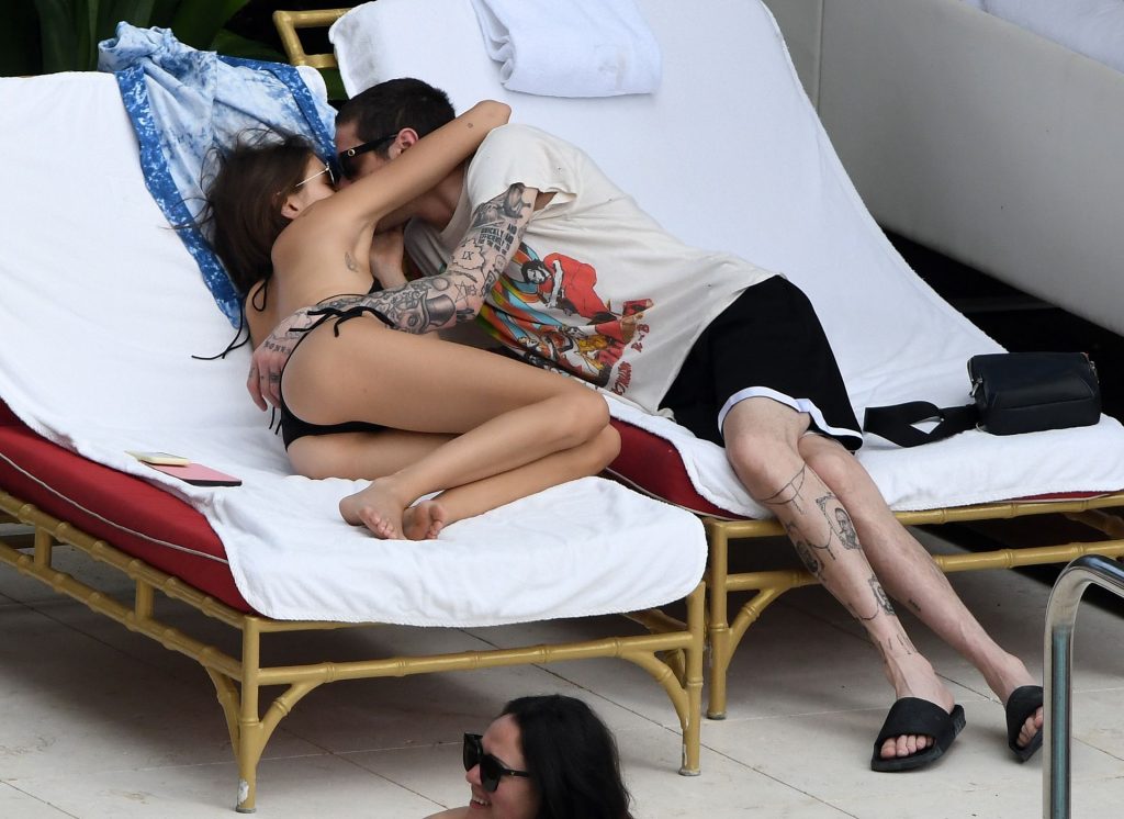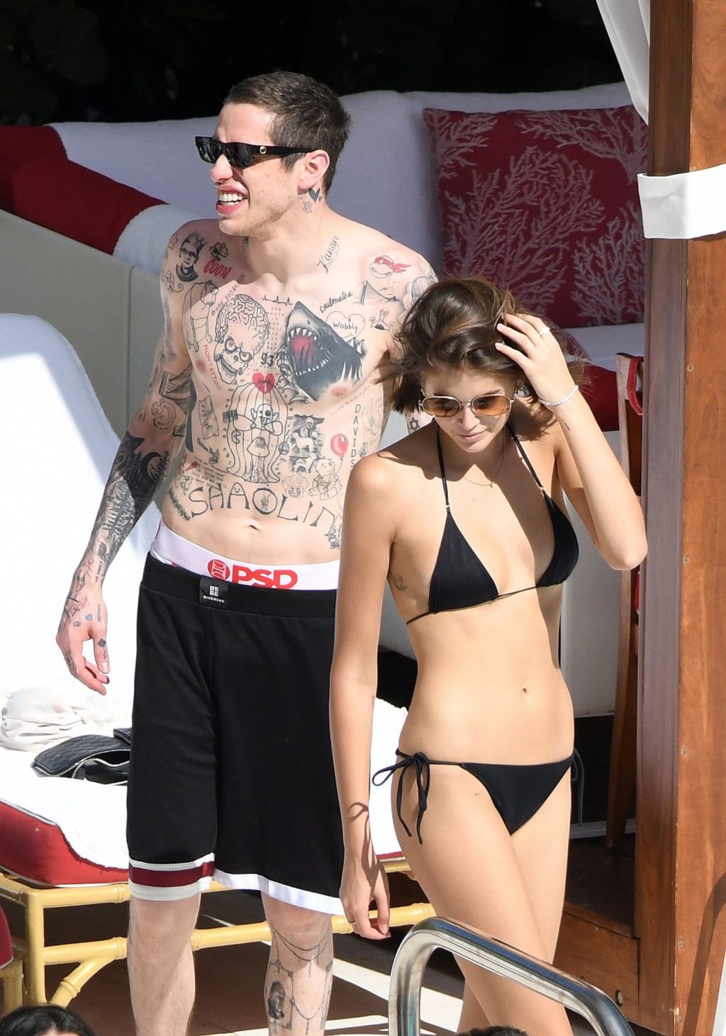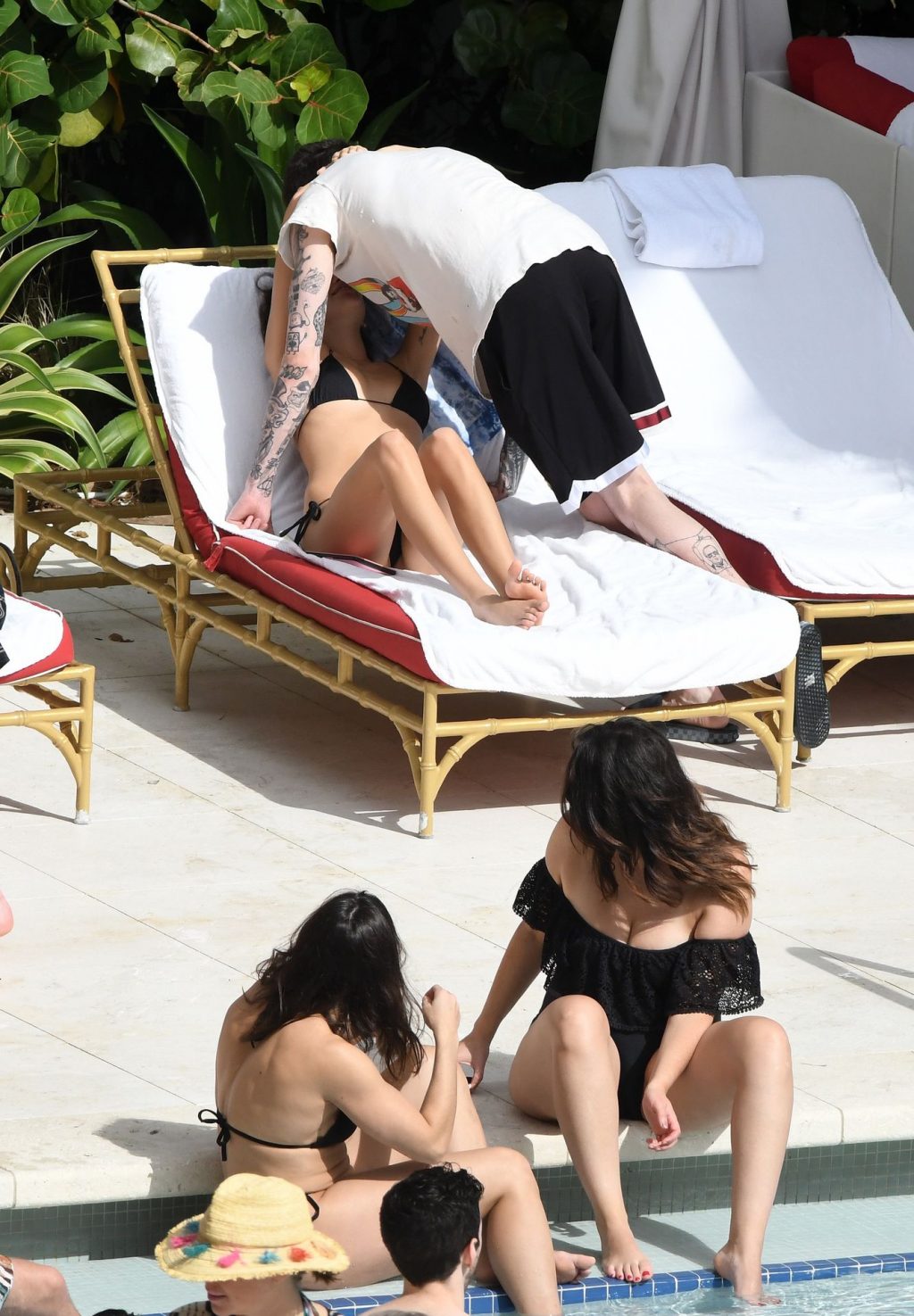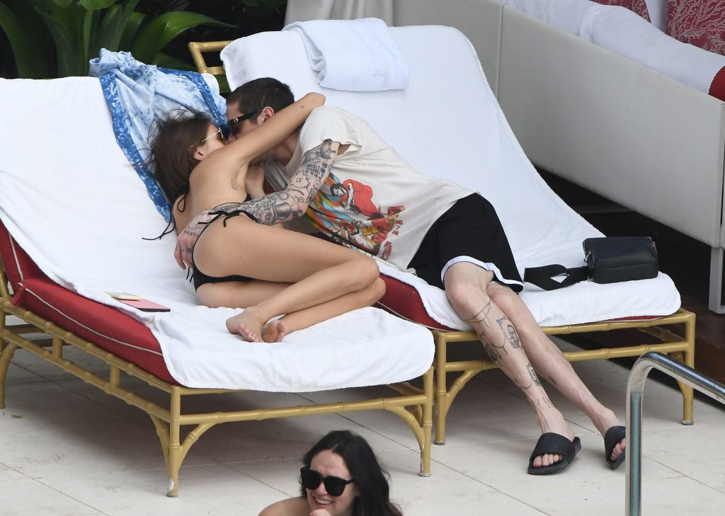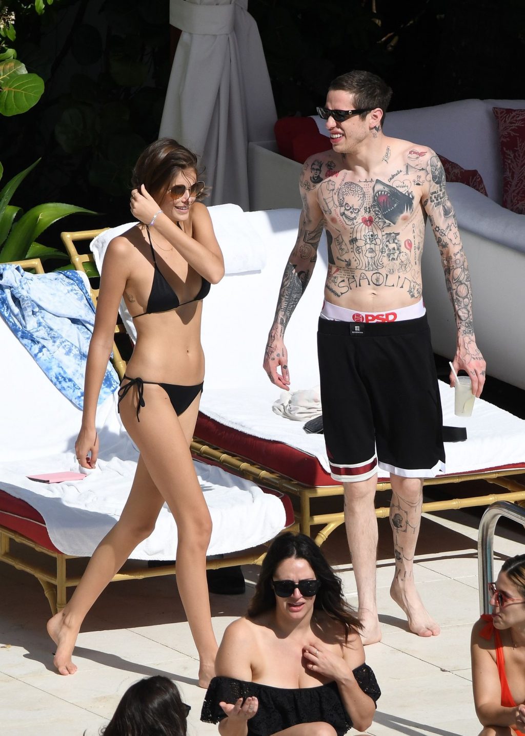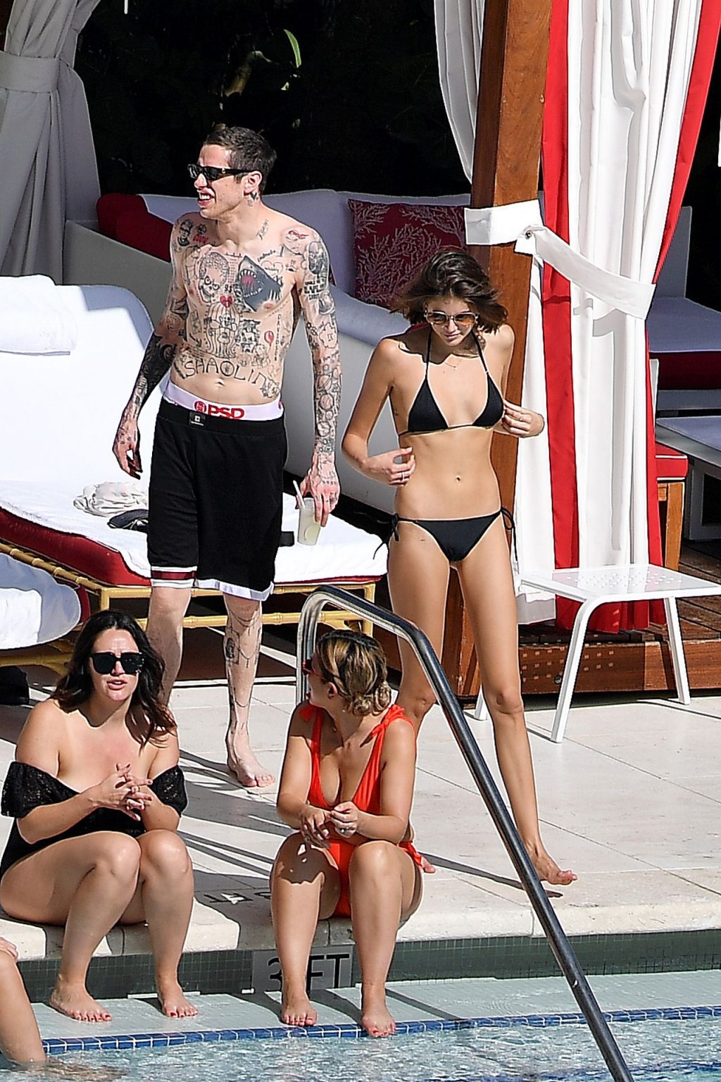 Дочь Синди Кроуфорд, модель Каия Гербер, в черном бикини целует своего парня Пита Дэвидсона у бассейна в Майами, 23.11.2019.