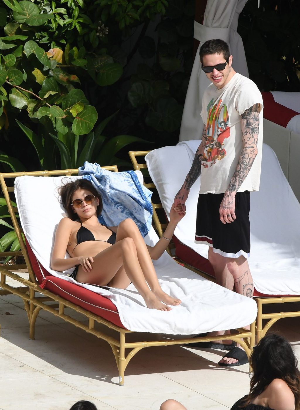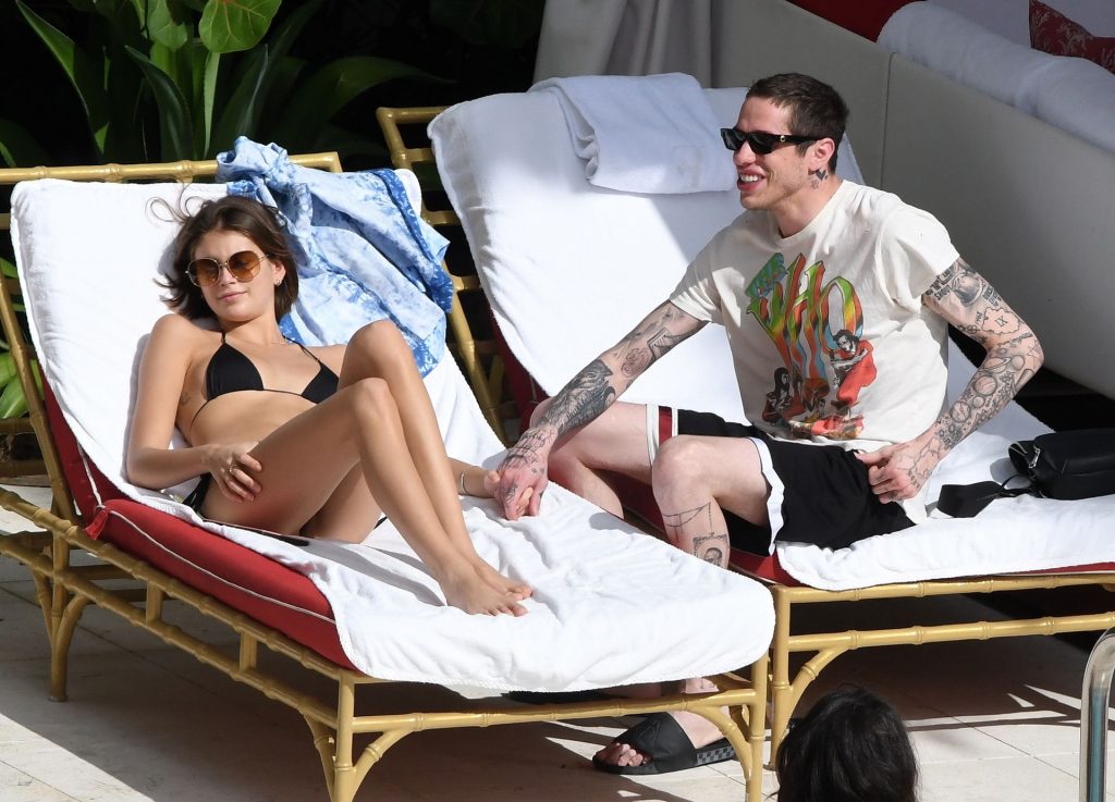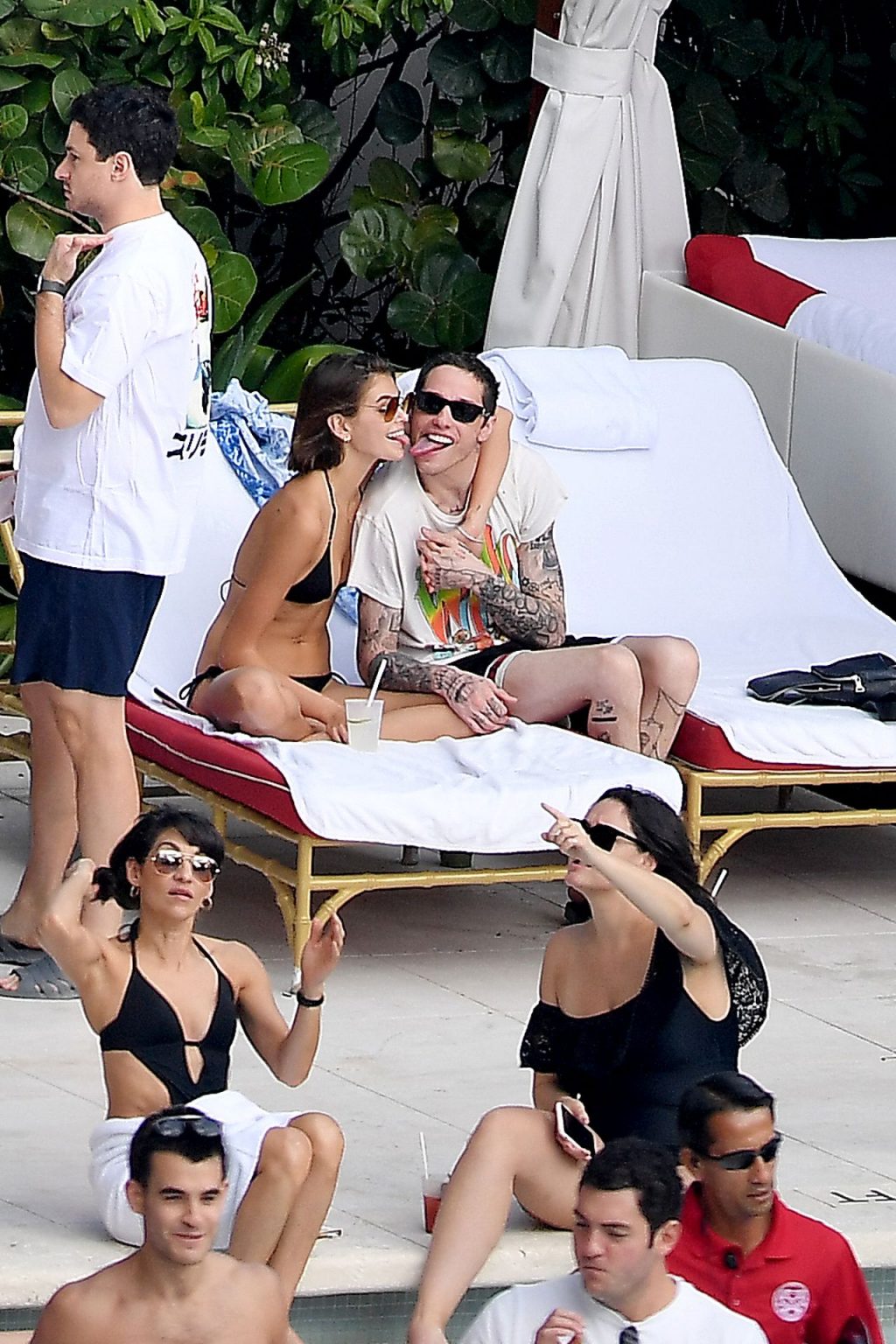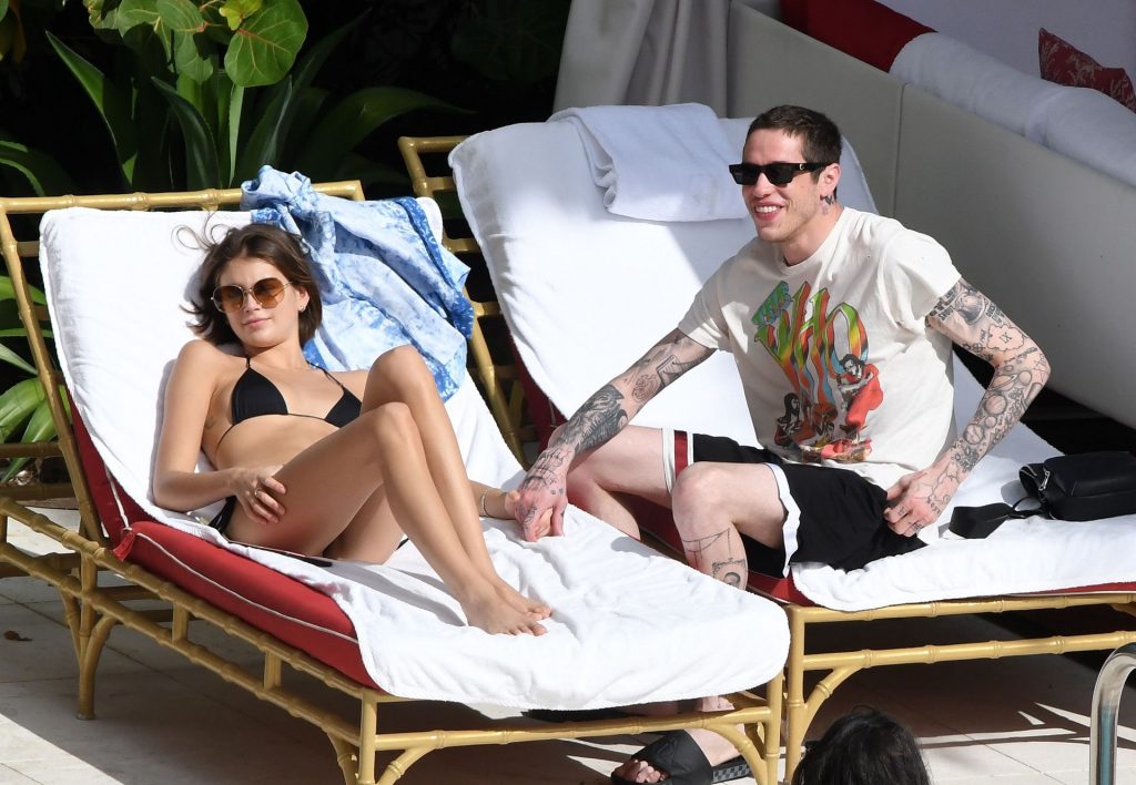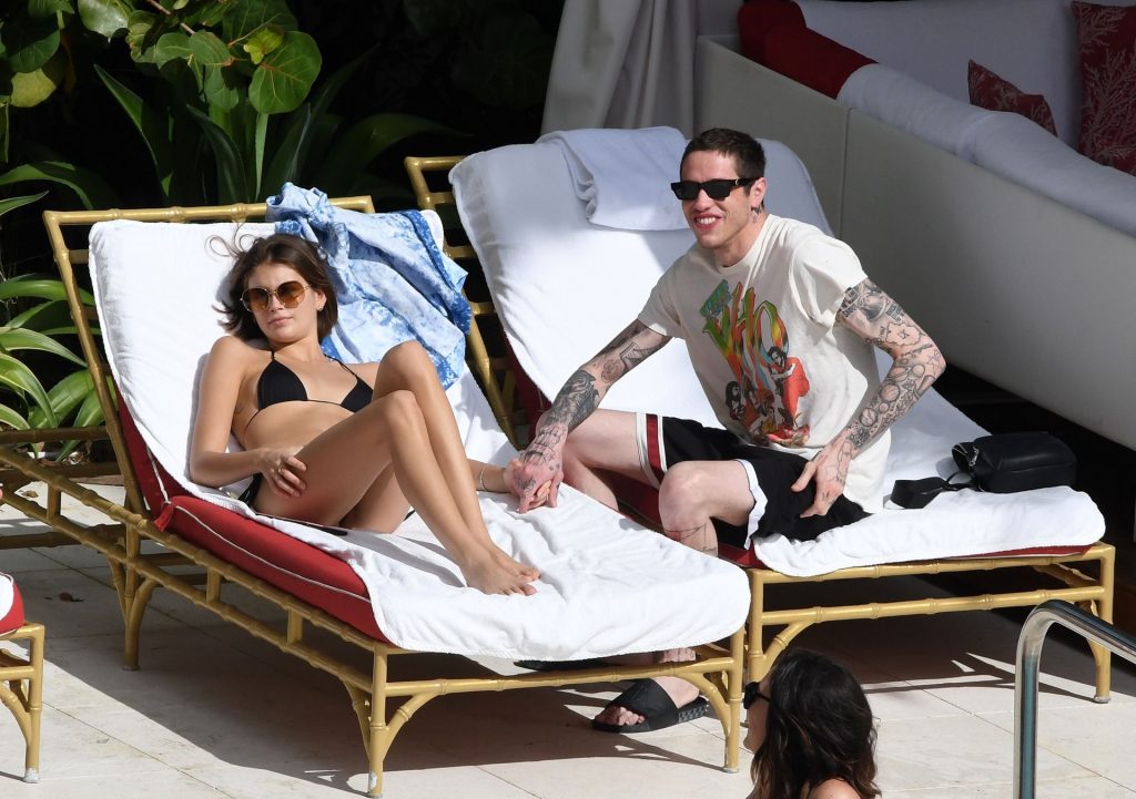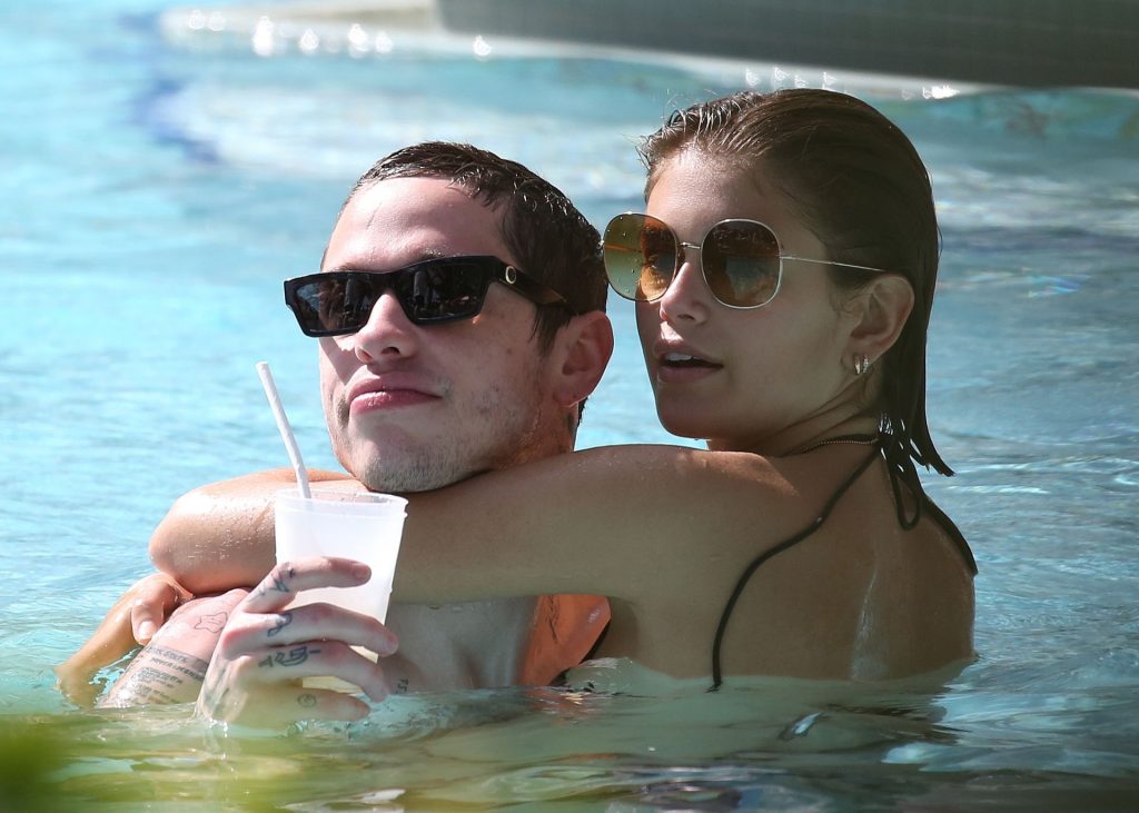 Дочь Синди Кроуфорд, модель Каия Гербер, в черном бикини целует своего парня Пита Дэвидсона у бассейна в Майами, 23.11.2019.