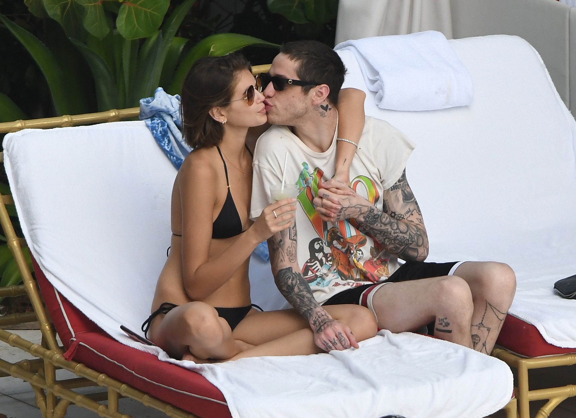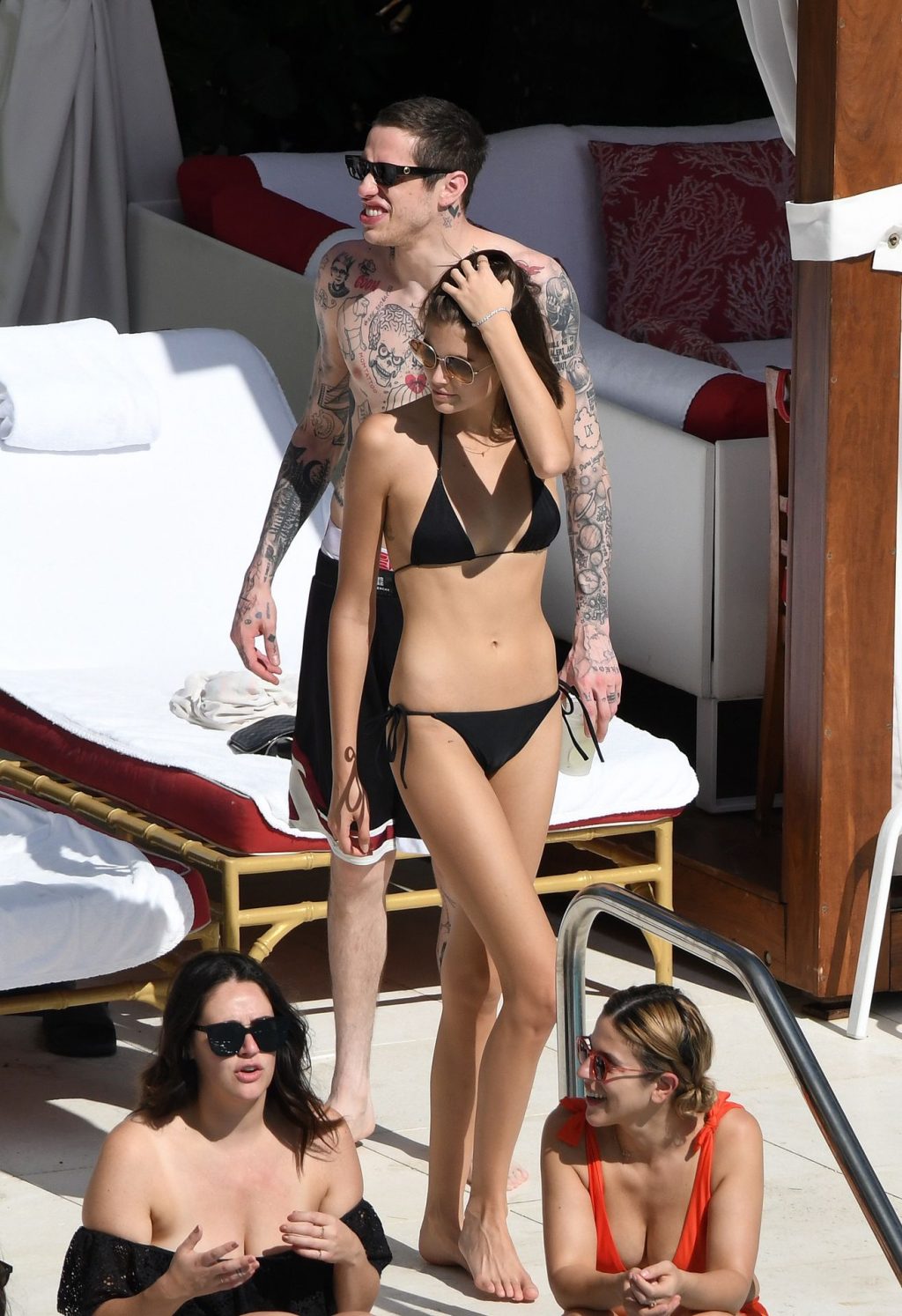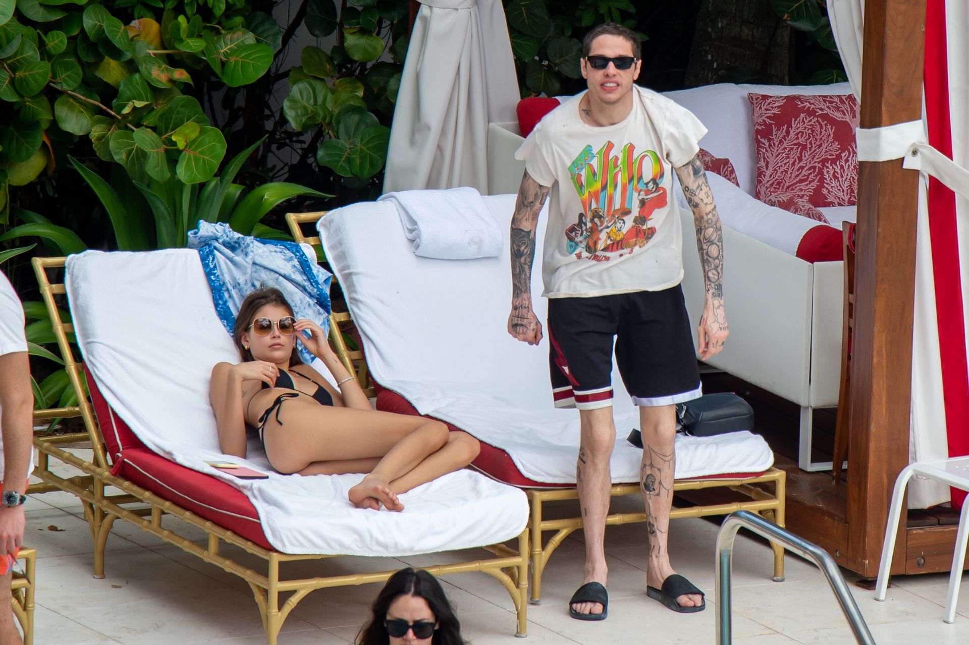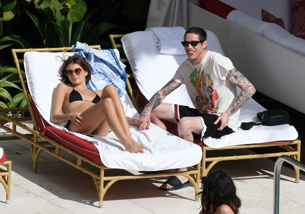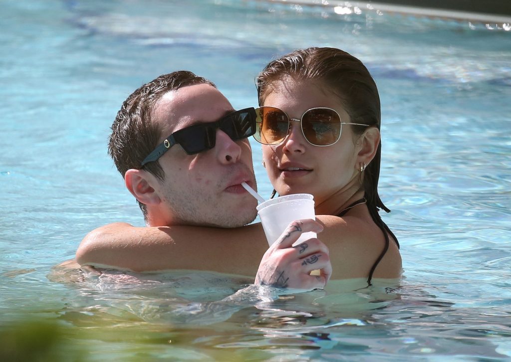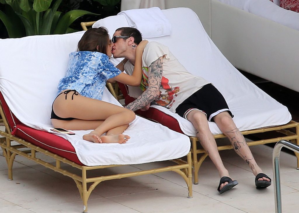 Дочь Синди Кроуфорд, модель Каия Гербер, в черном бикини целует своего парня Пита Дэвидсона у бассейна в Майами, 23.11.2019.
