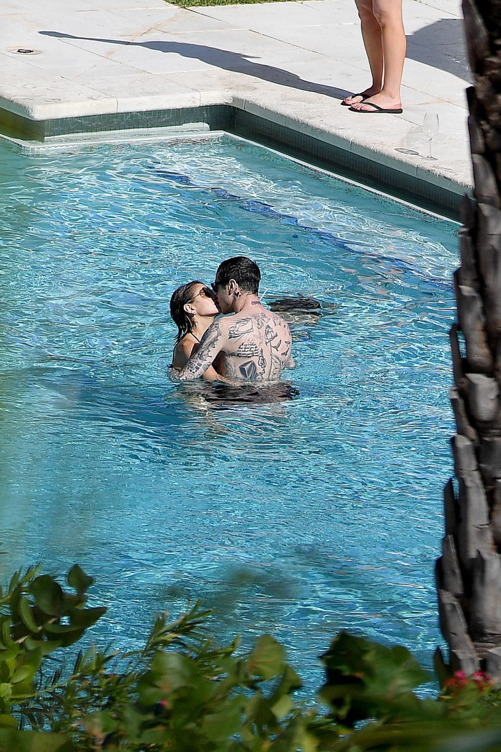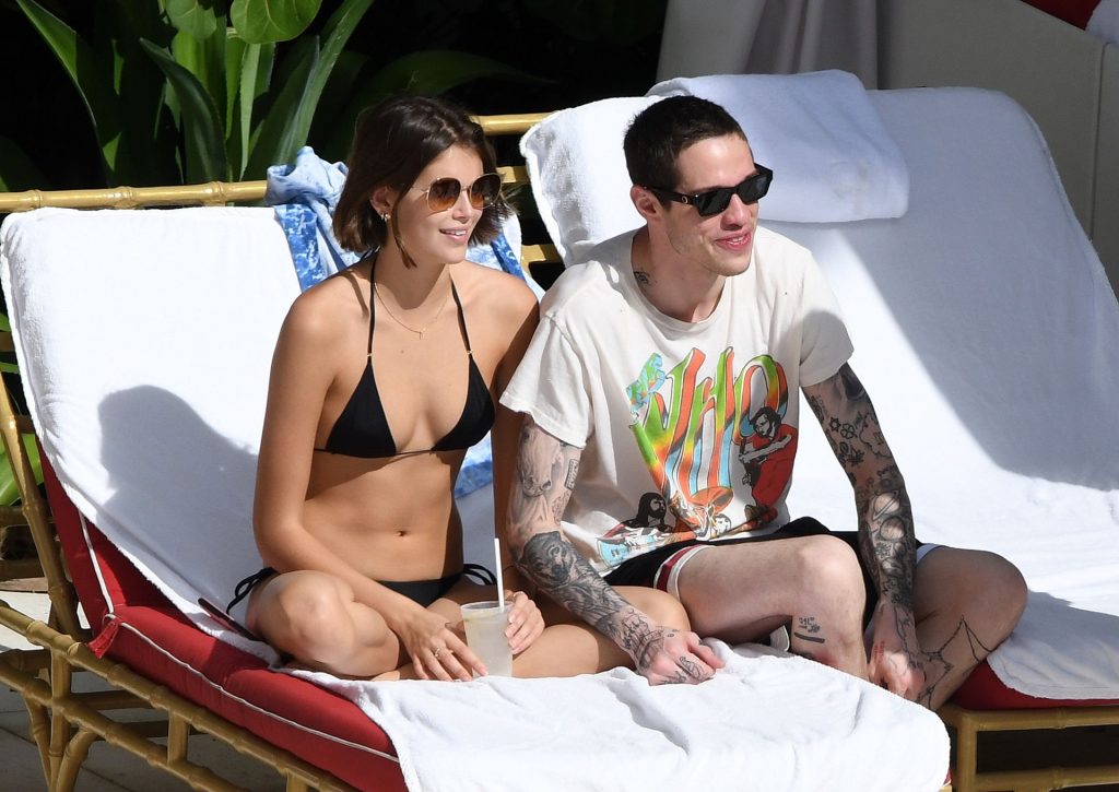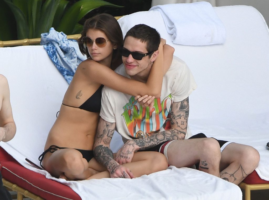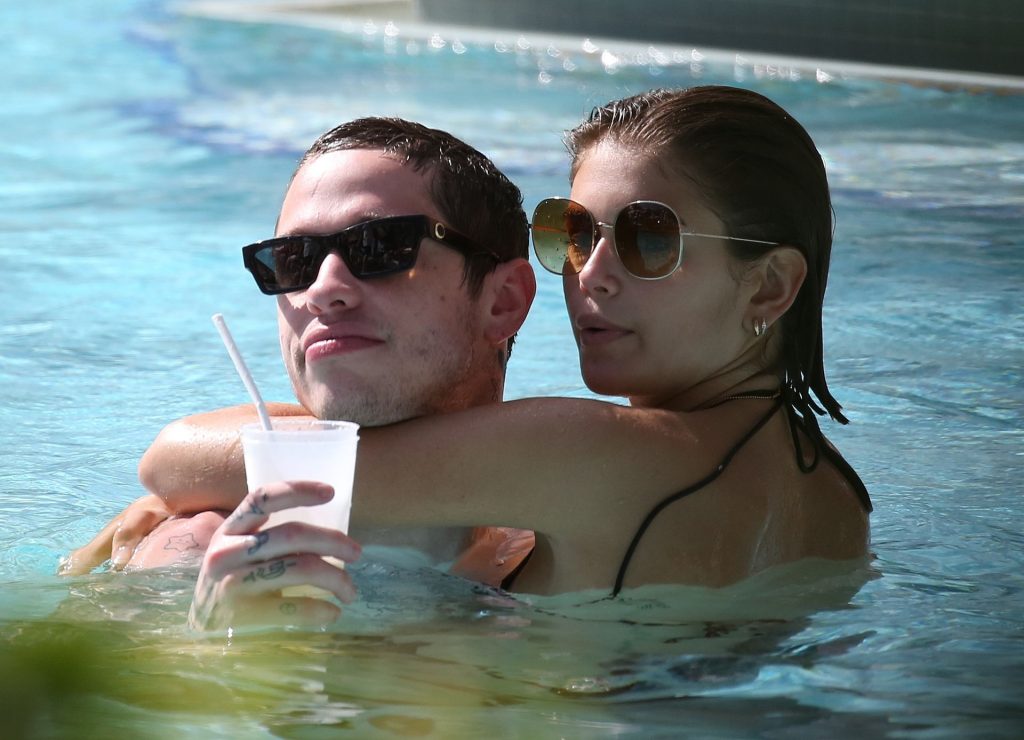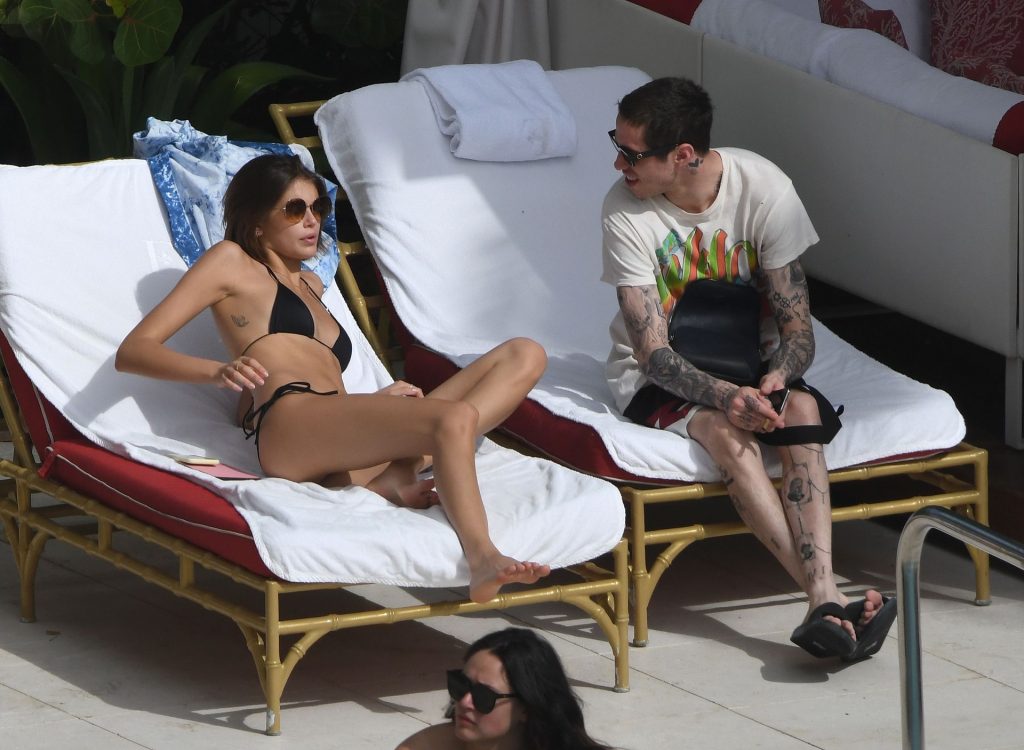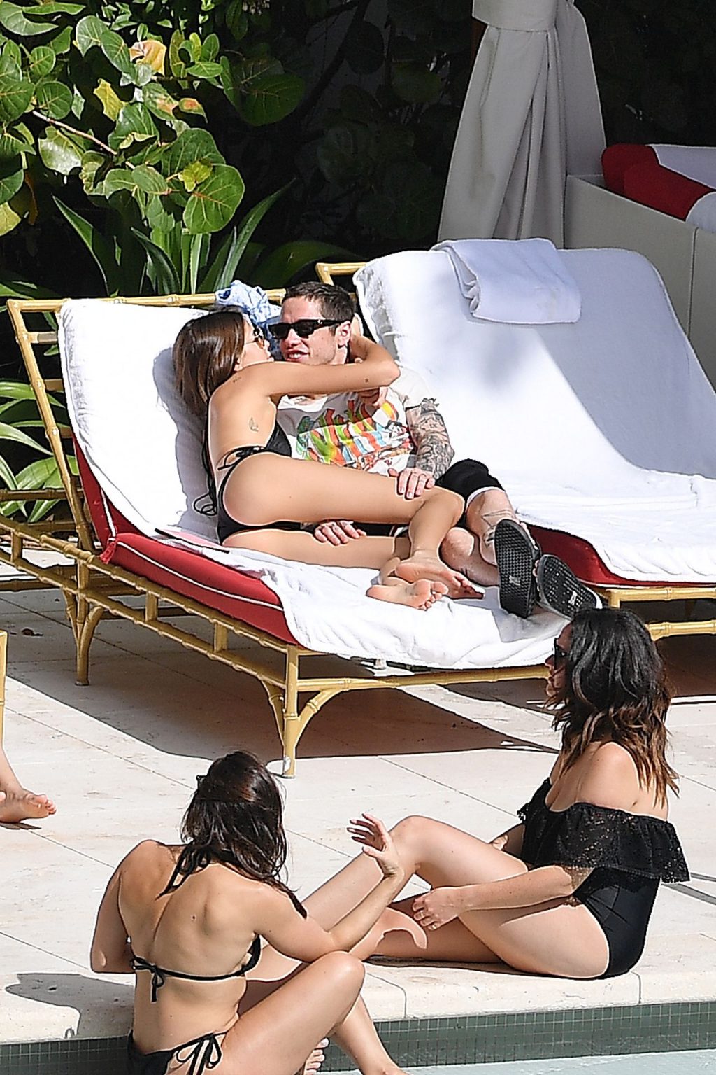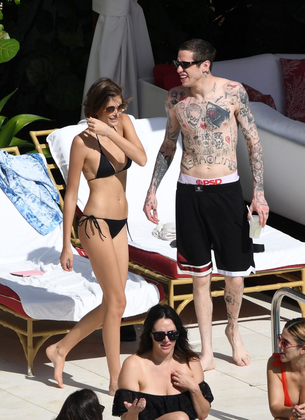 Дочь Синди Кроуфорд, модель Каия Гербер, в черном бикини целует своего парня Пита Дэвидсона у бассейна в Майами, 23.11.2019.