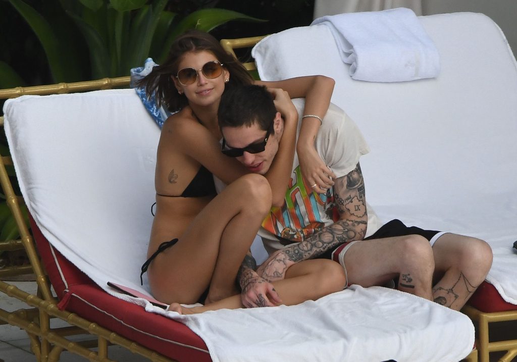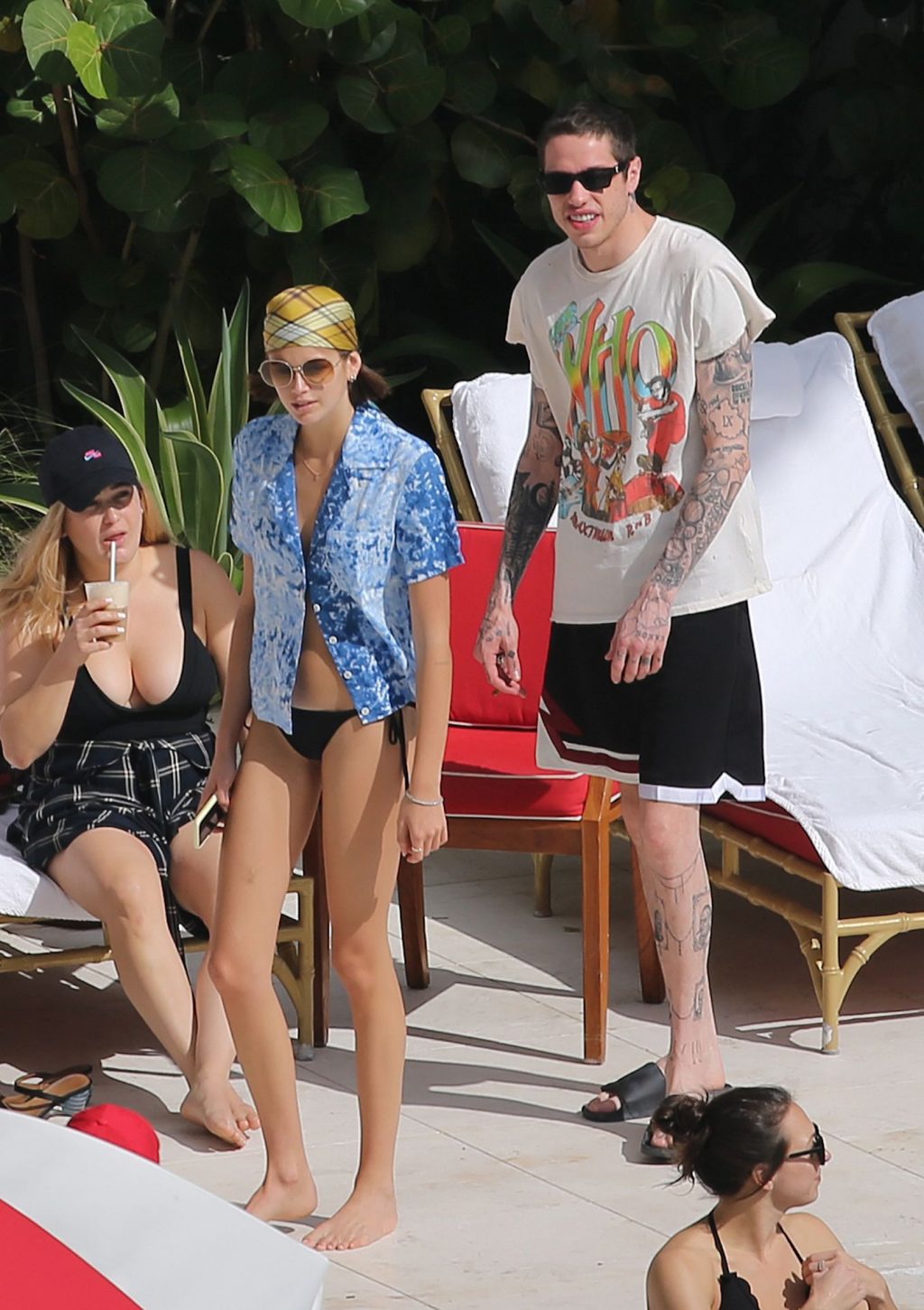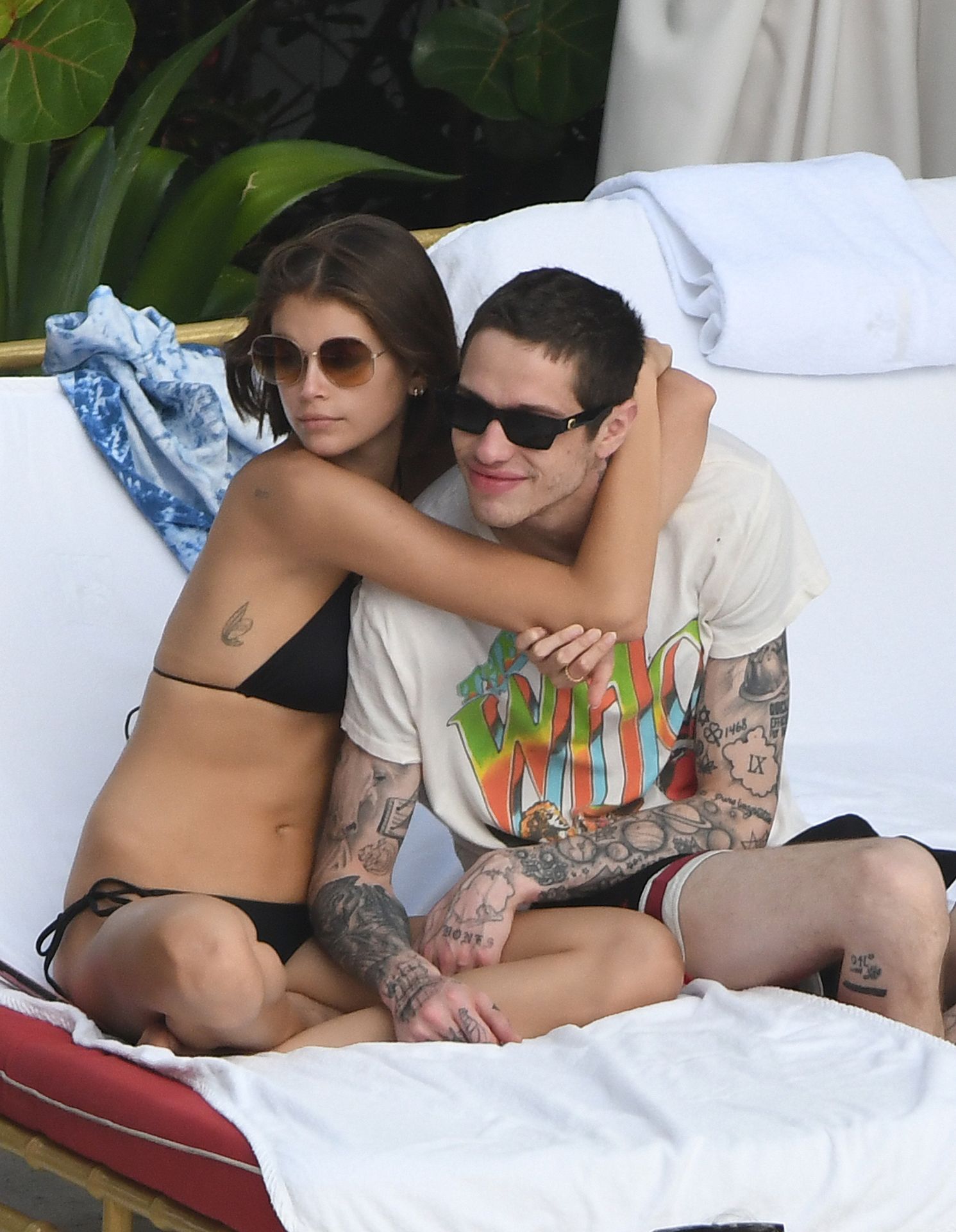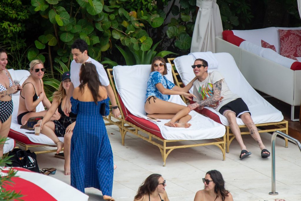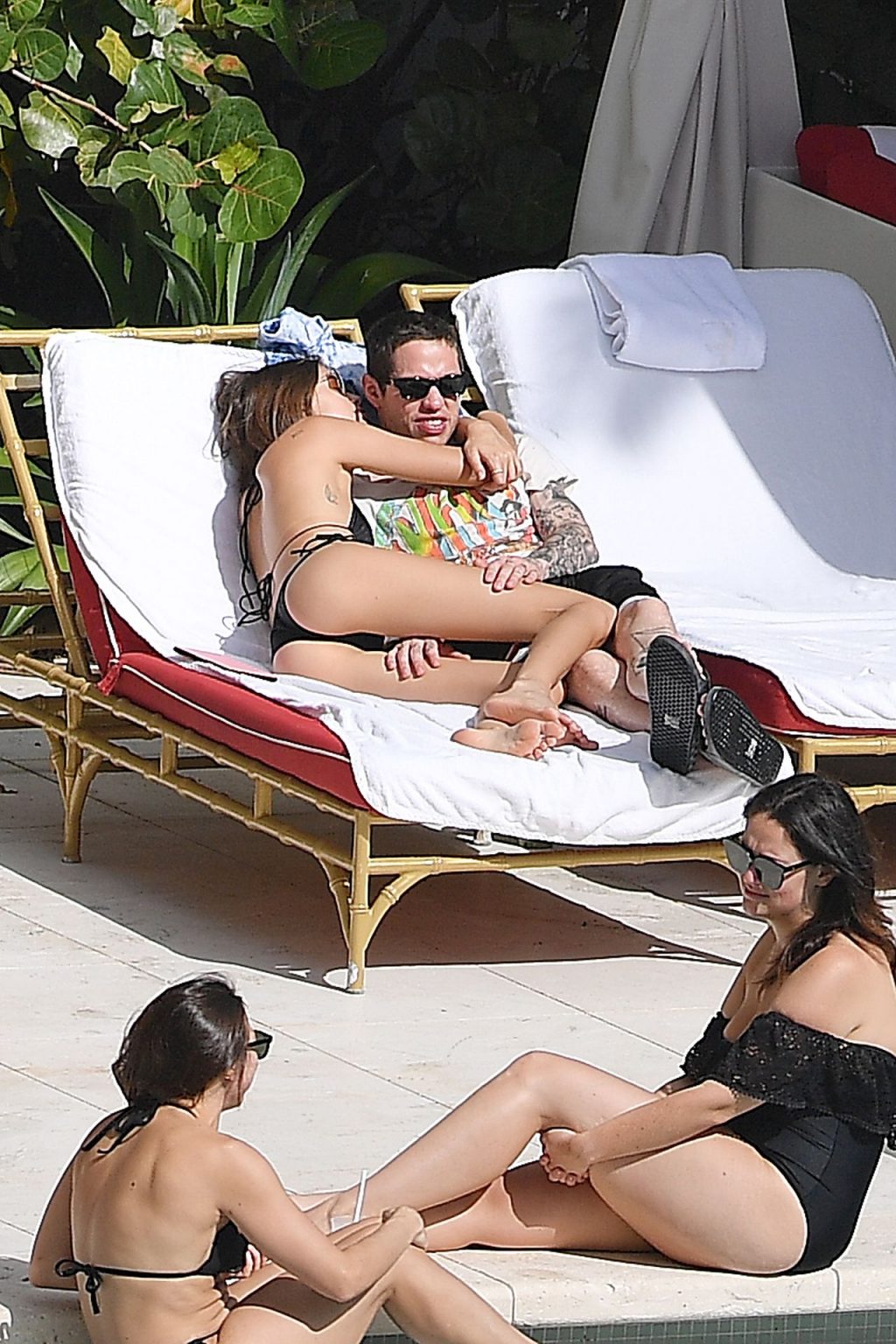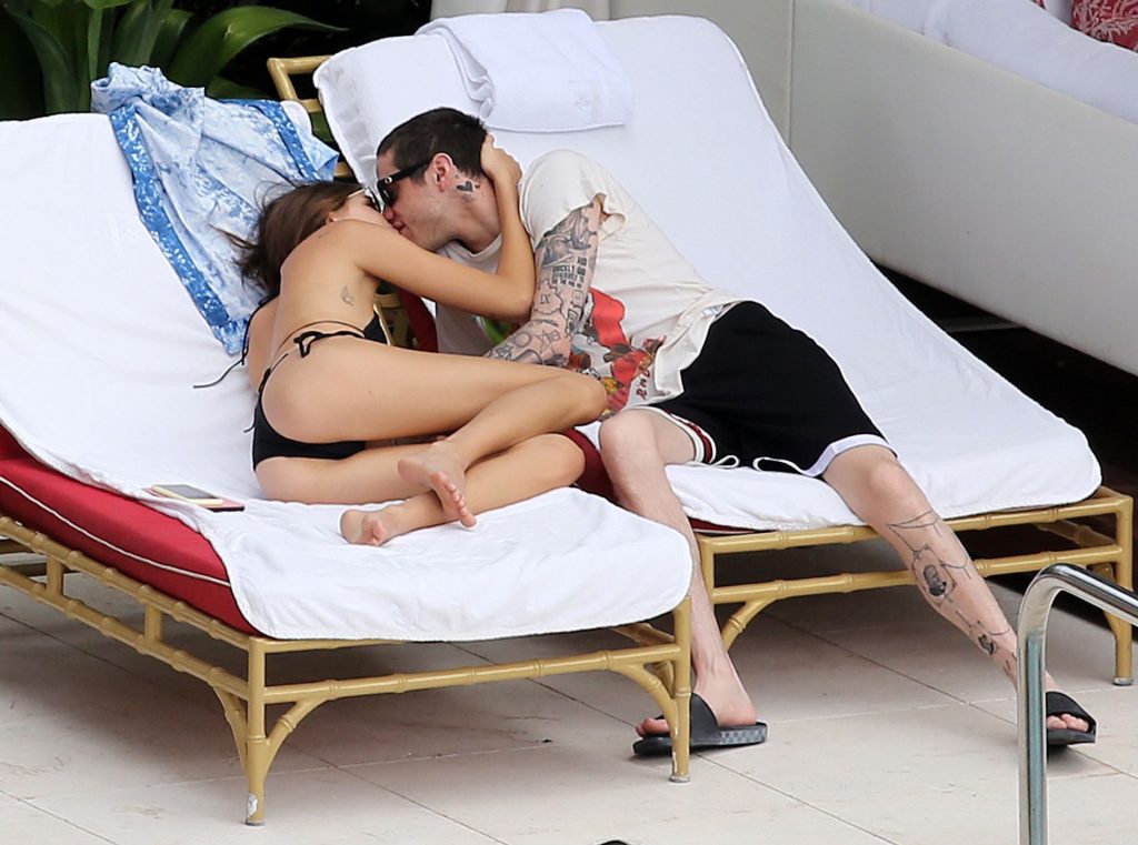 Дочь Синди Кроуфорд, модель Каия Гербер, в черном бикини целует своего парня Пита Дэвидсона у бассейна в Майами, 23.11.2019.