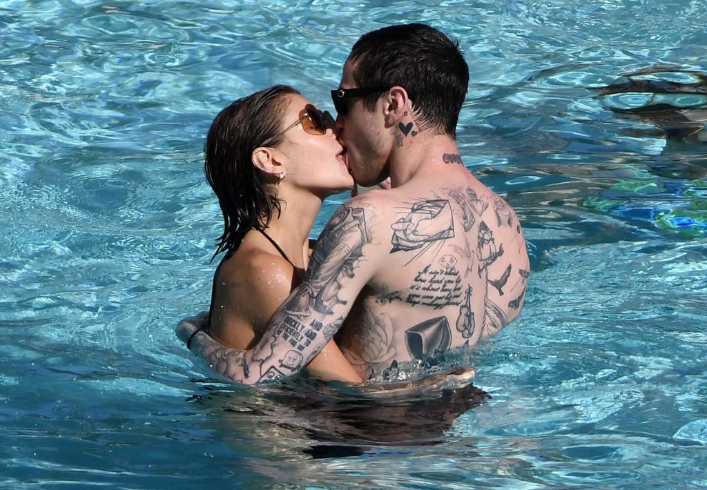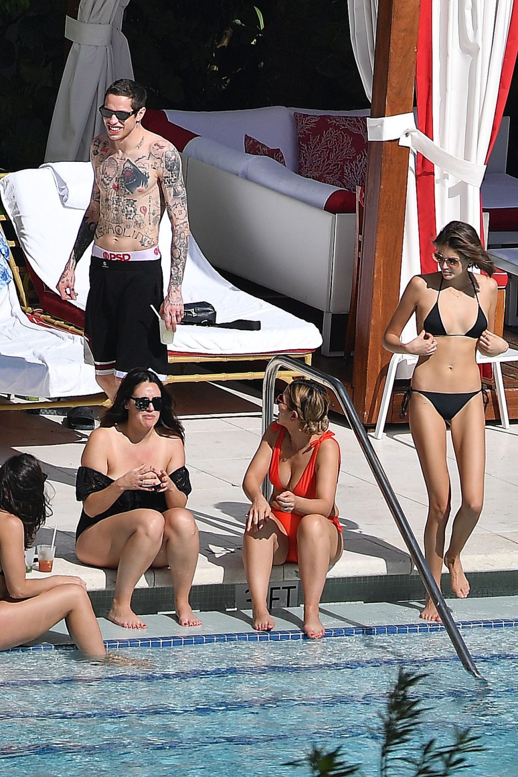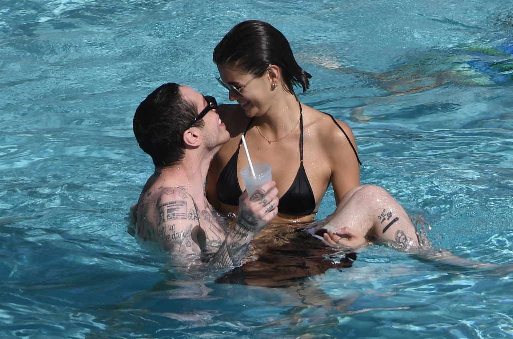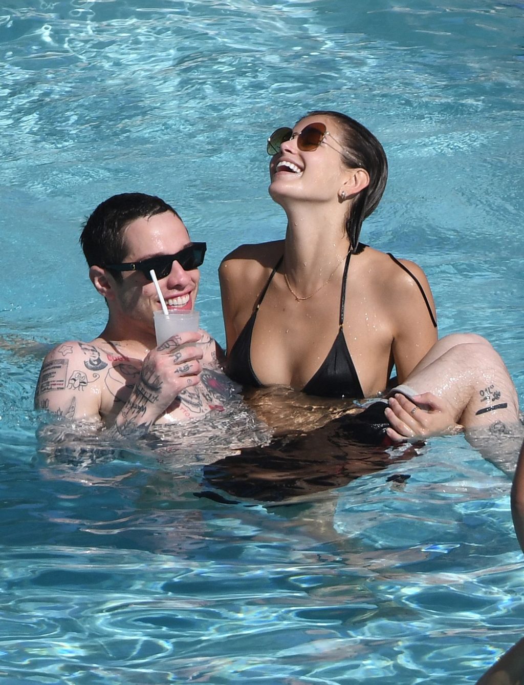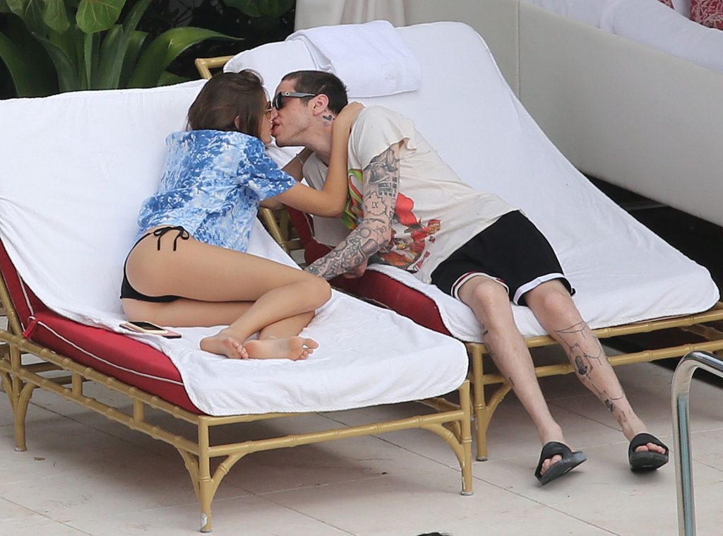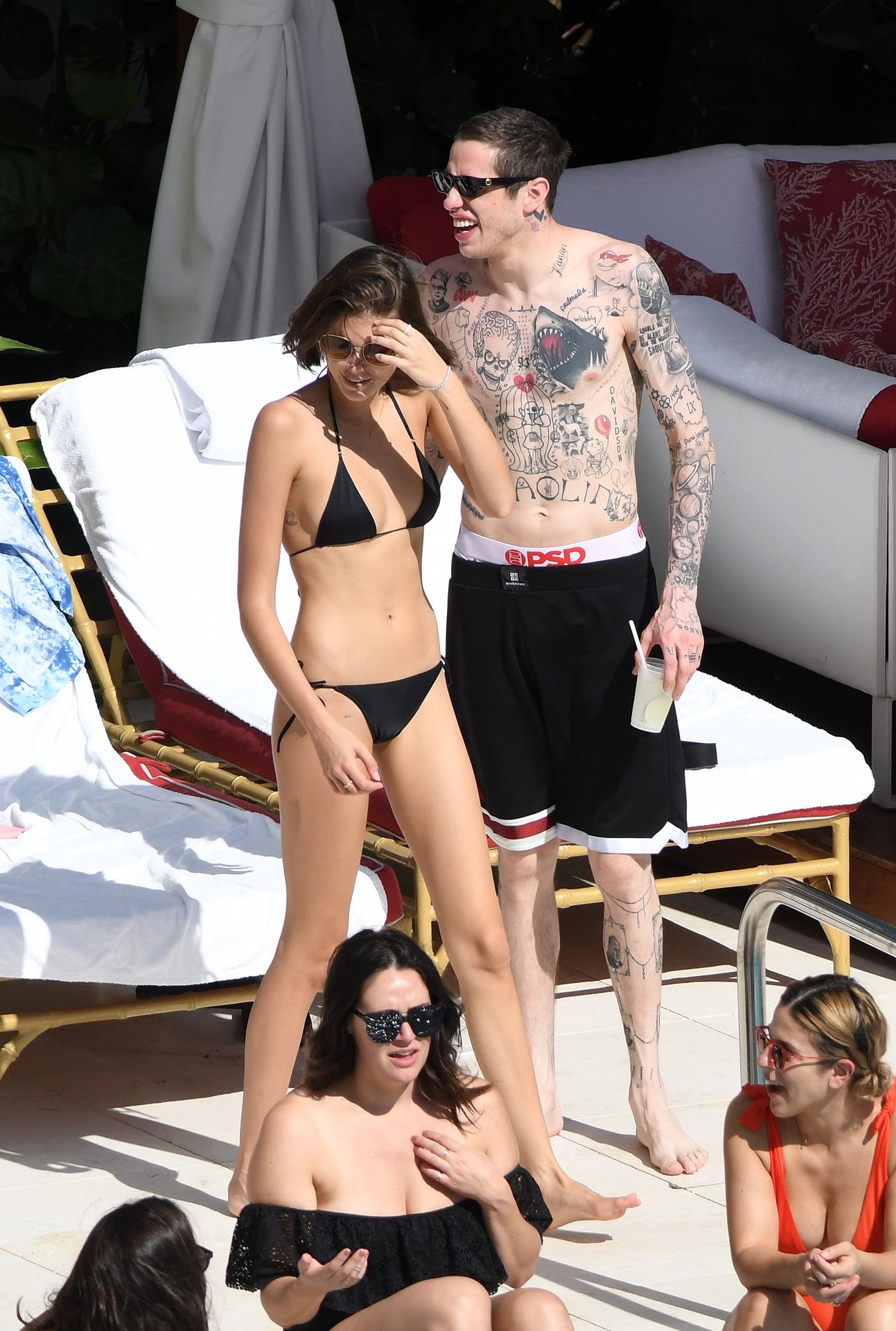 Дочь Синди Кроуфорд, модель Каия Гербер, в черном бикини целует своего парня Пита Дэвидсона у бассейна в Майами, 23.11.2019.