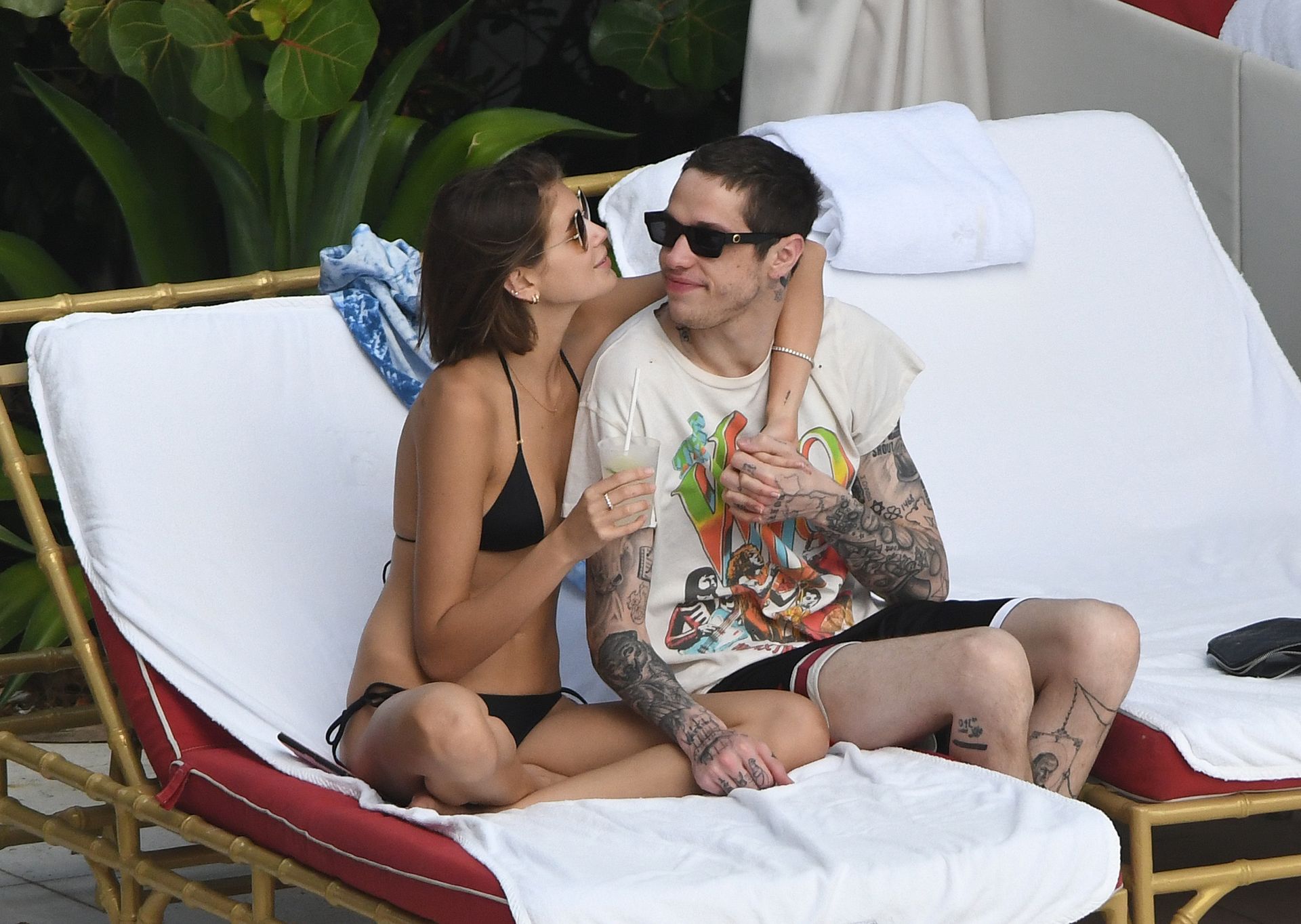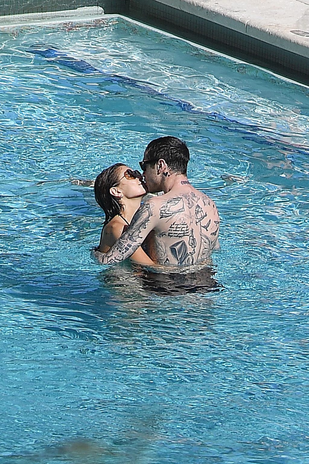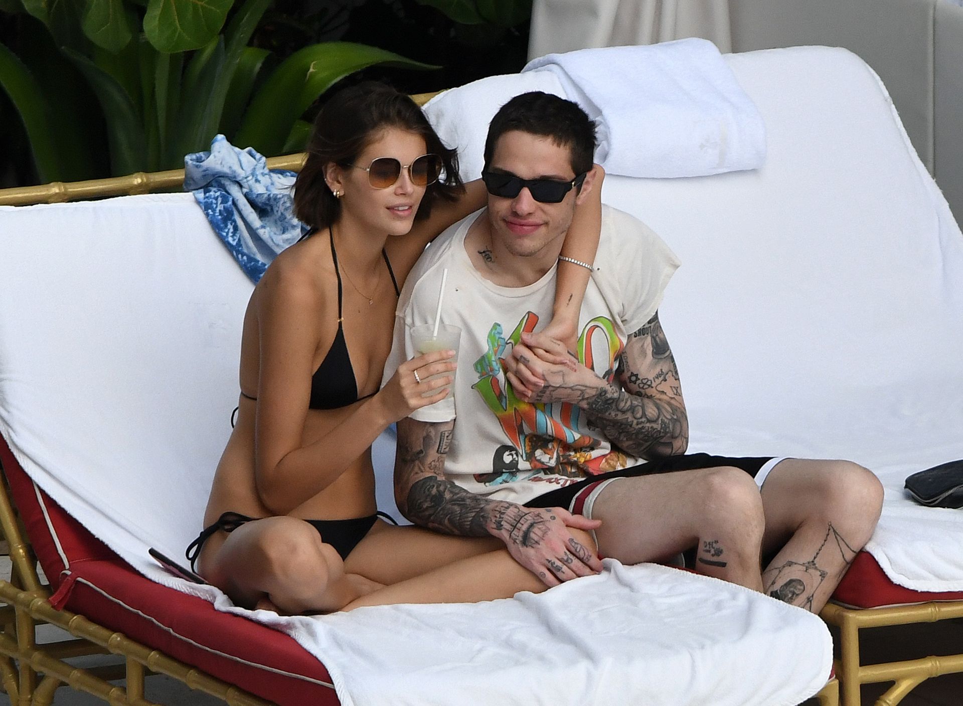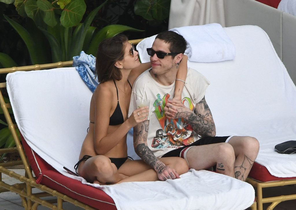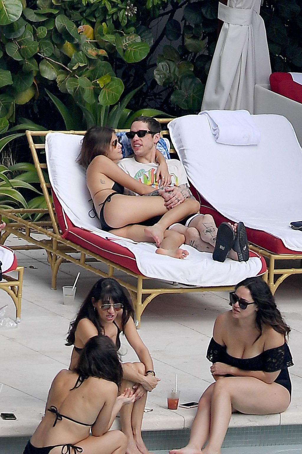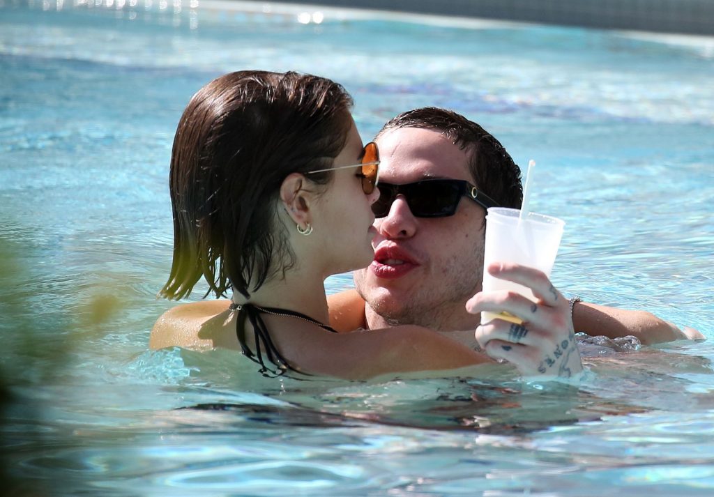 Дочь Синди Кроуфорд, модель Каия Гербер, в черном бикини целует своего парня Пита Дэвидсона у бассейна в Майами, 23.11.2019.