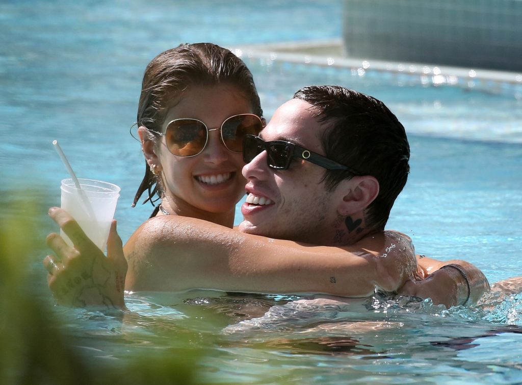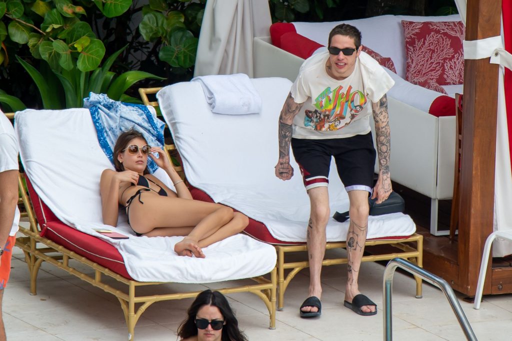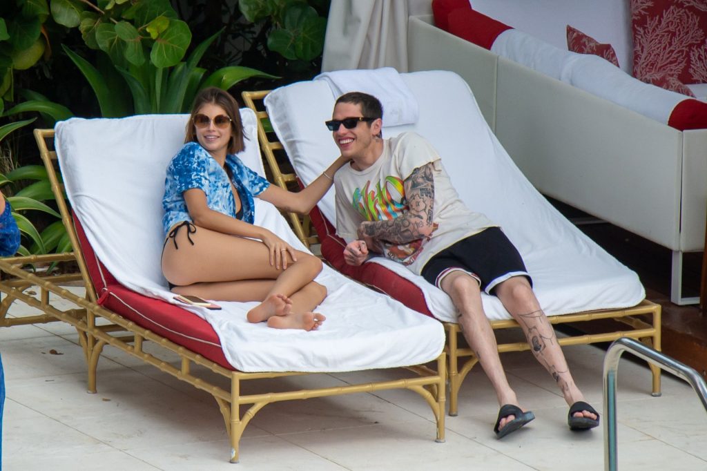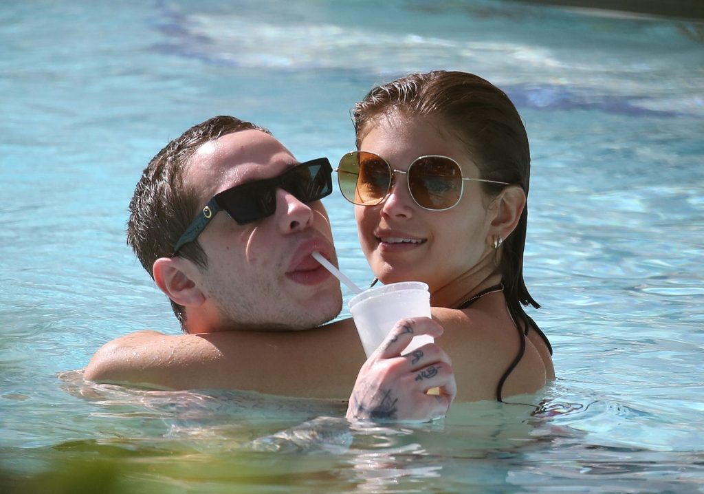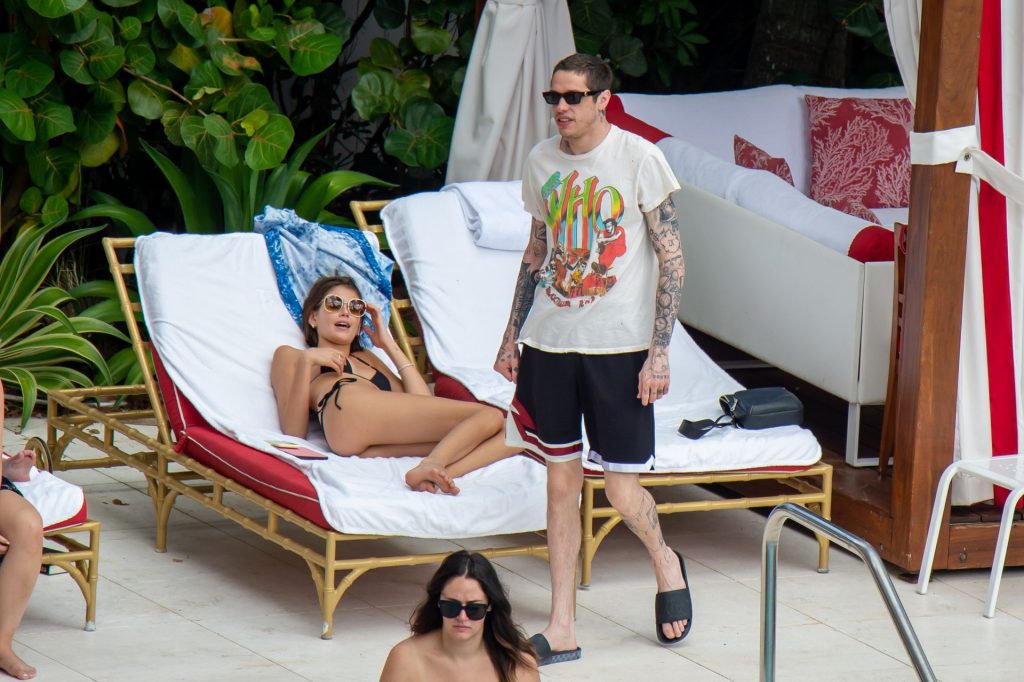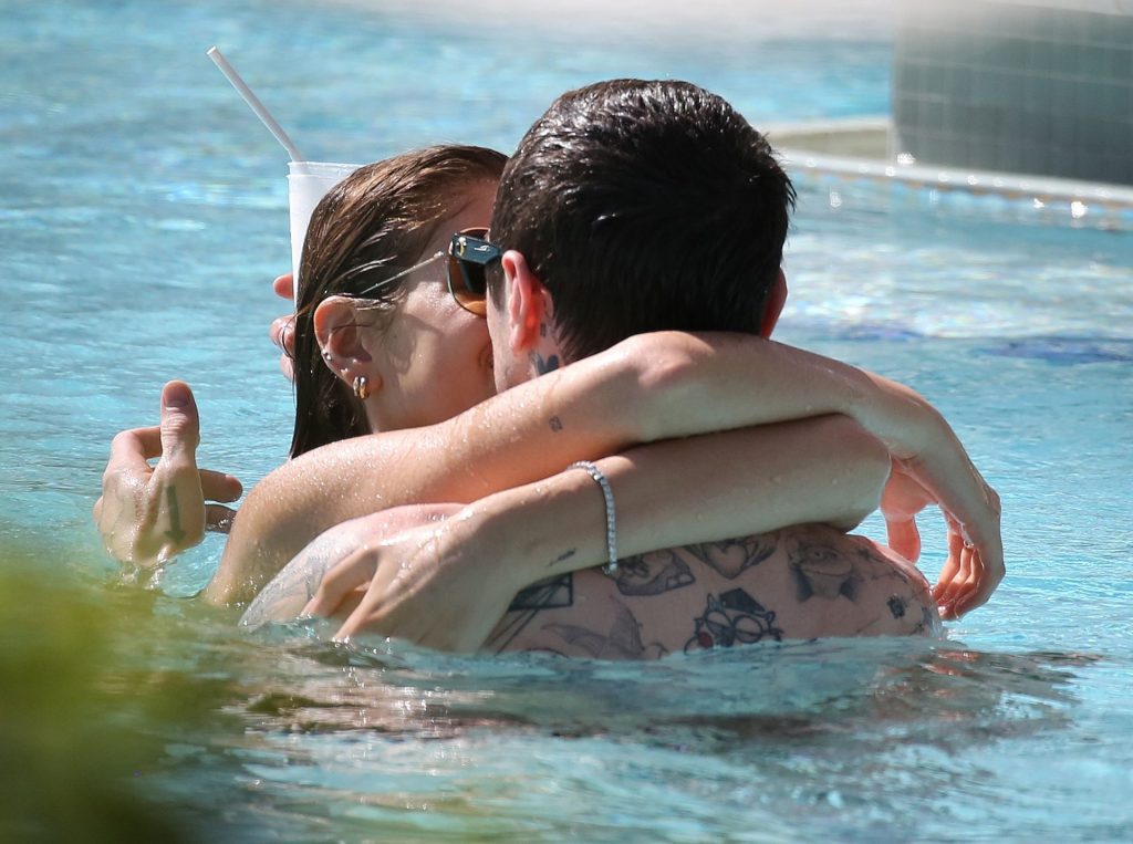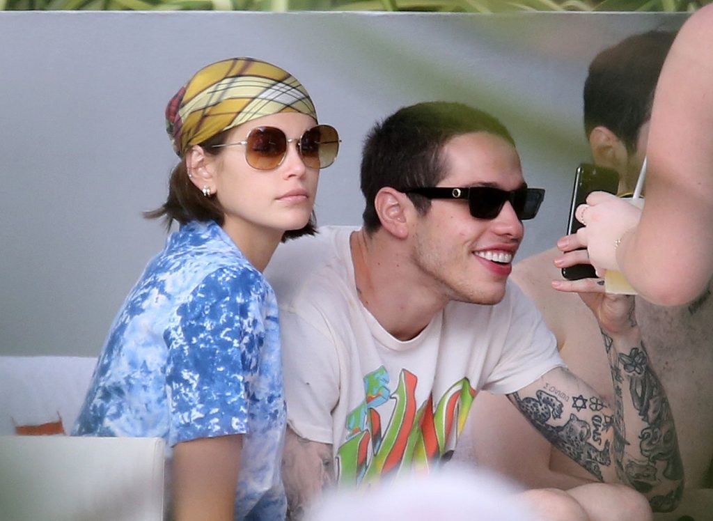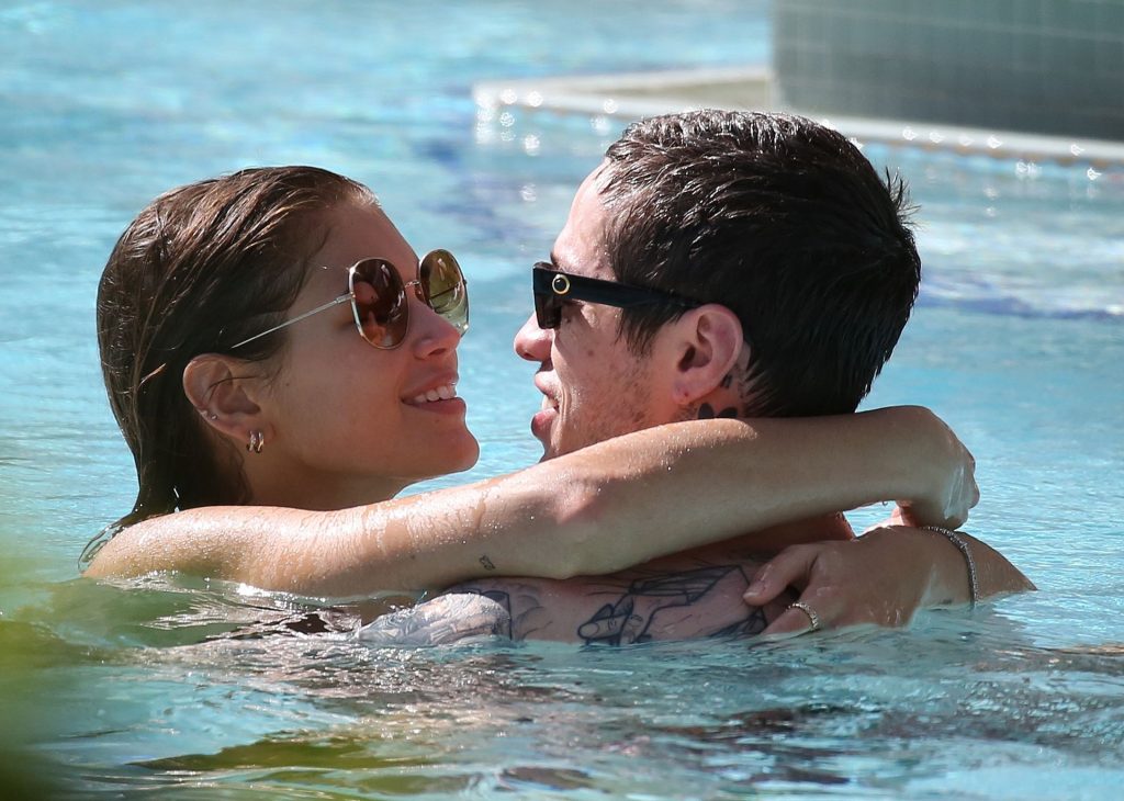 Дочь Синди Кроуфорд, модель Каия Гербер, в черном бикини целует своего парня Пита Дэвидсона у бассейна в Майами, 23.11.2019.