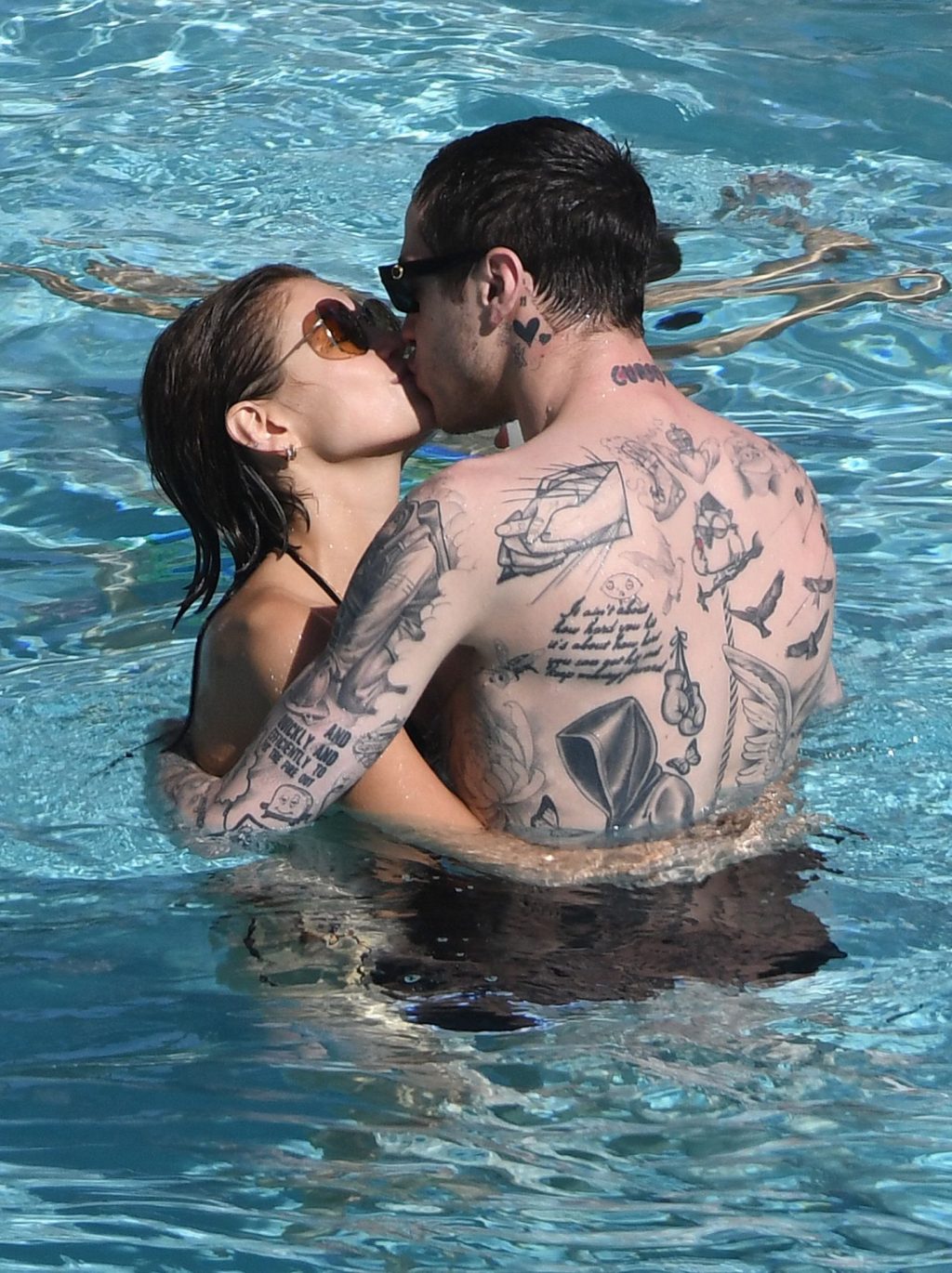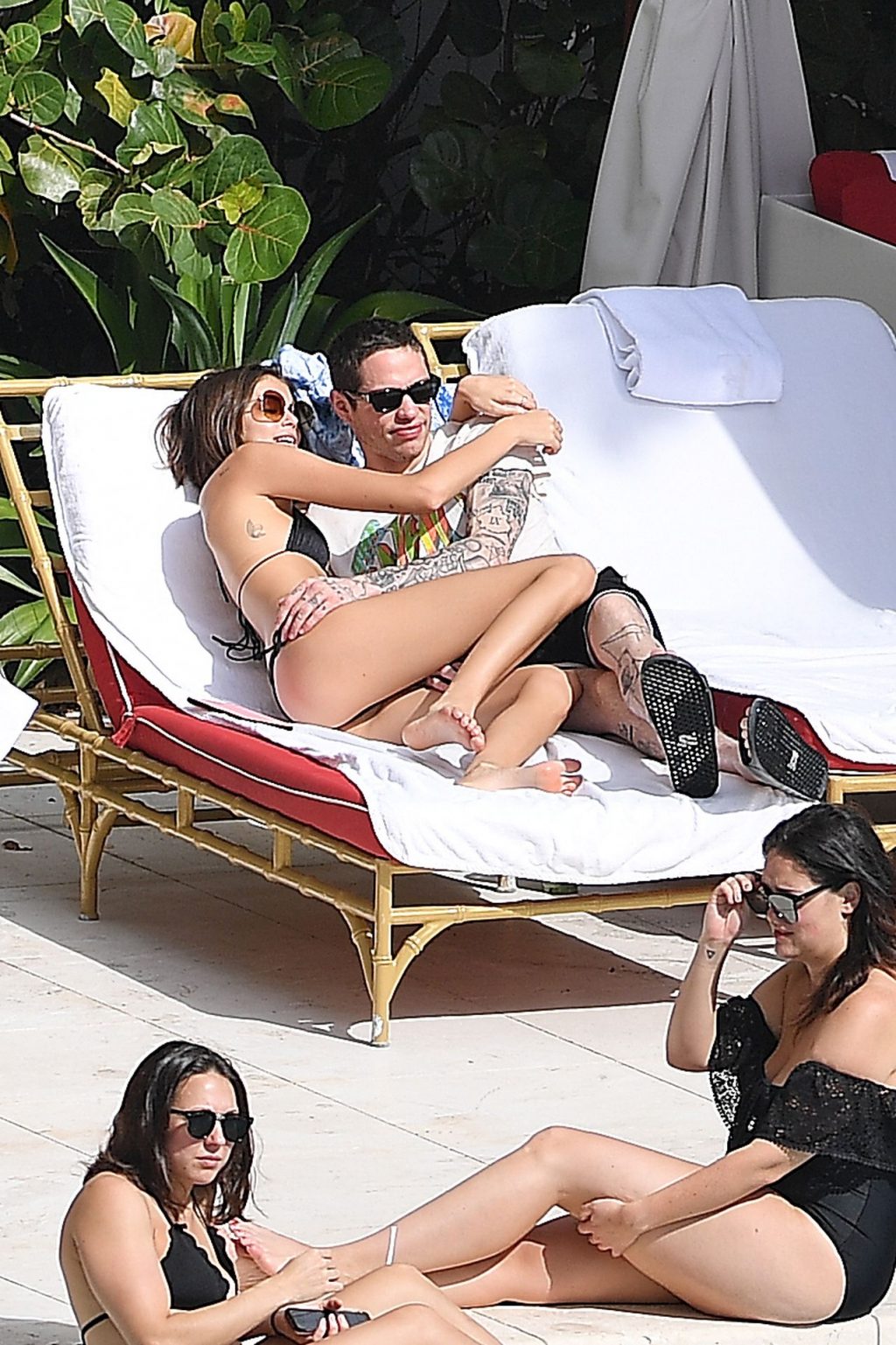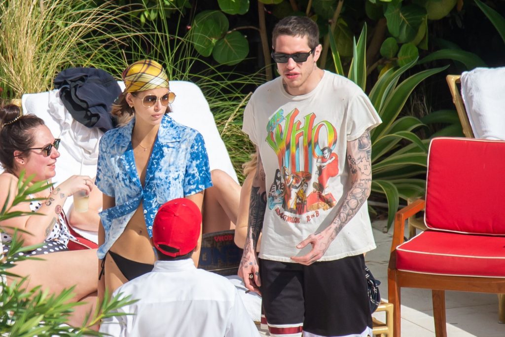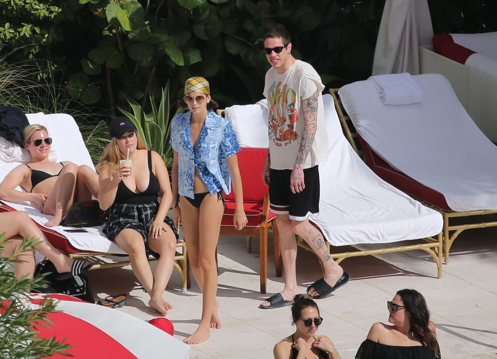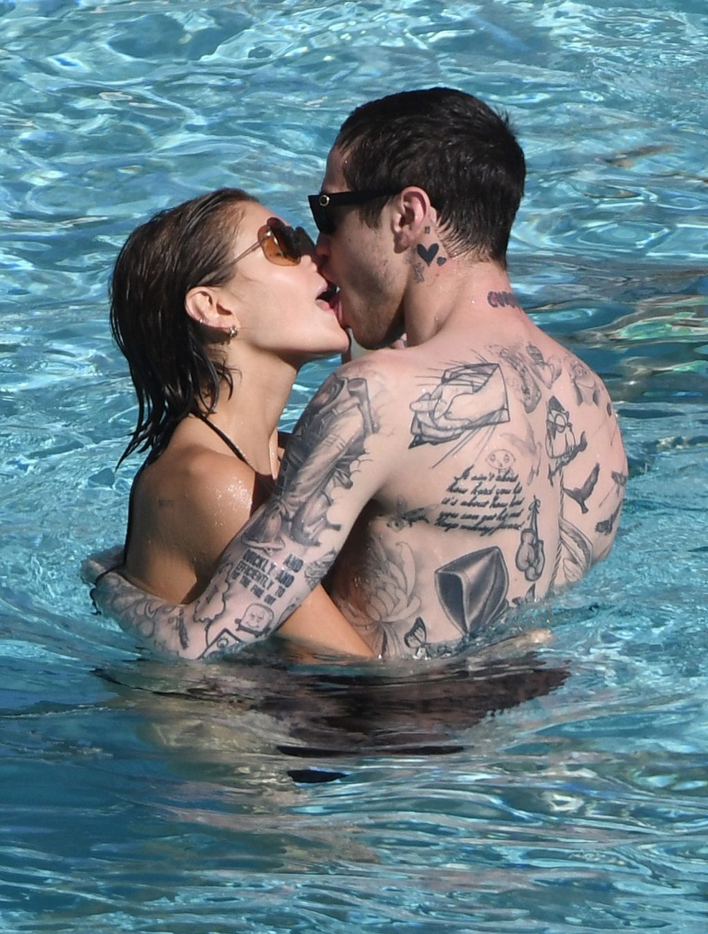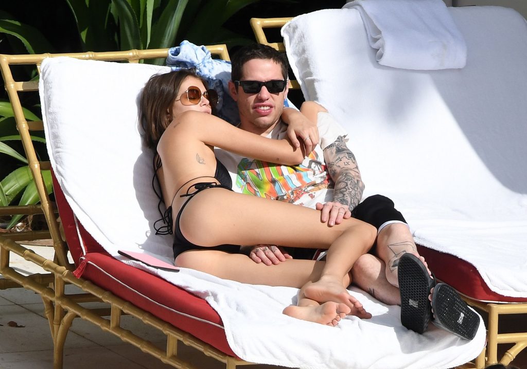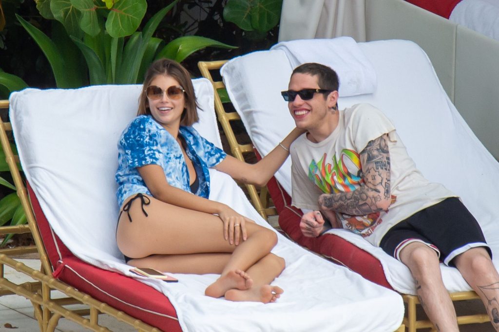 Дочь Синди Кроуфорд, модель Каия Гербер, в черном бикини целует своего парня Пита Дэвидсона у бассейна в Майами, 23.11.2019.
