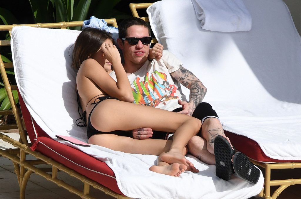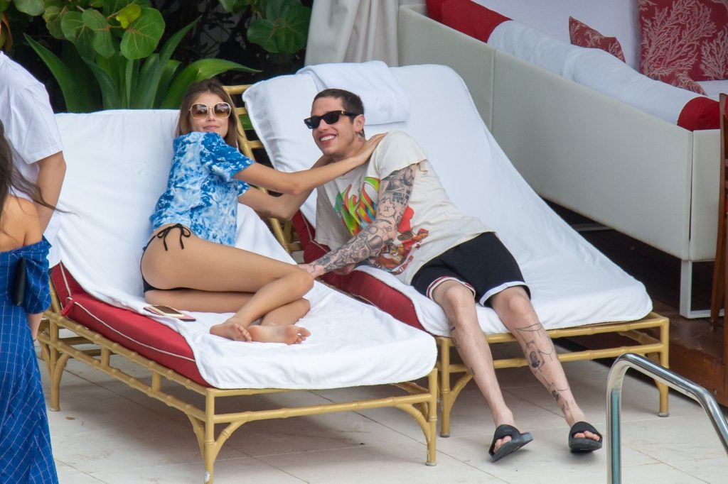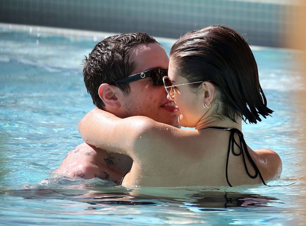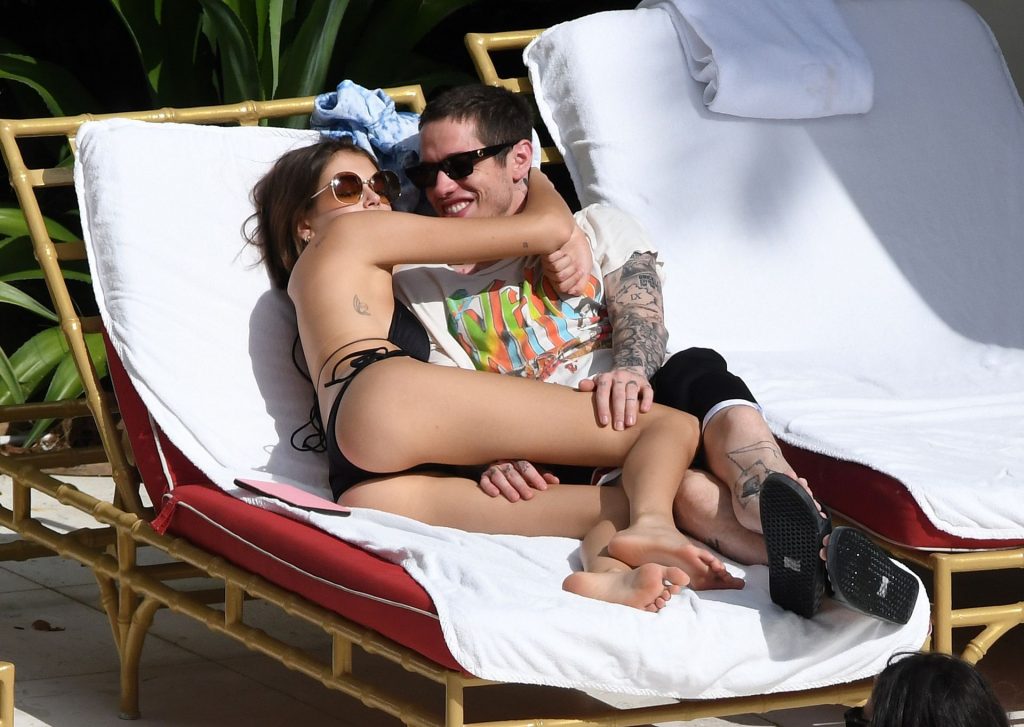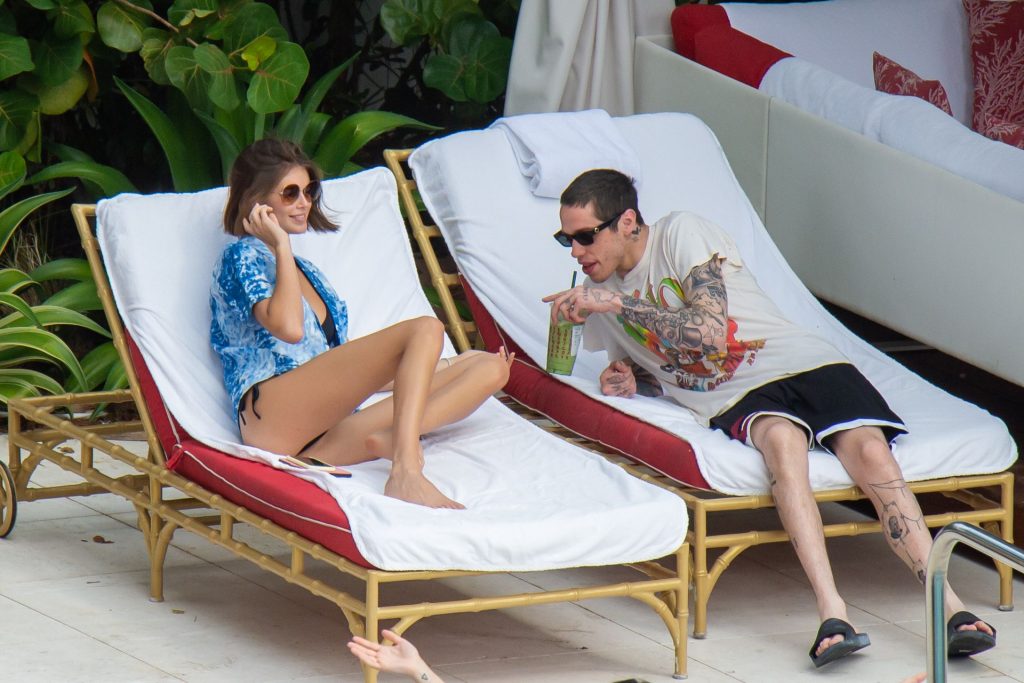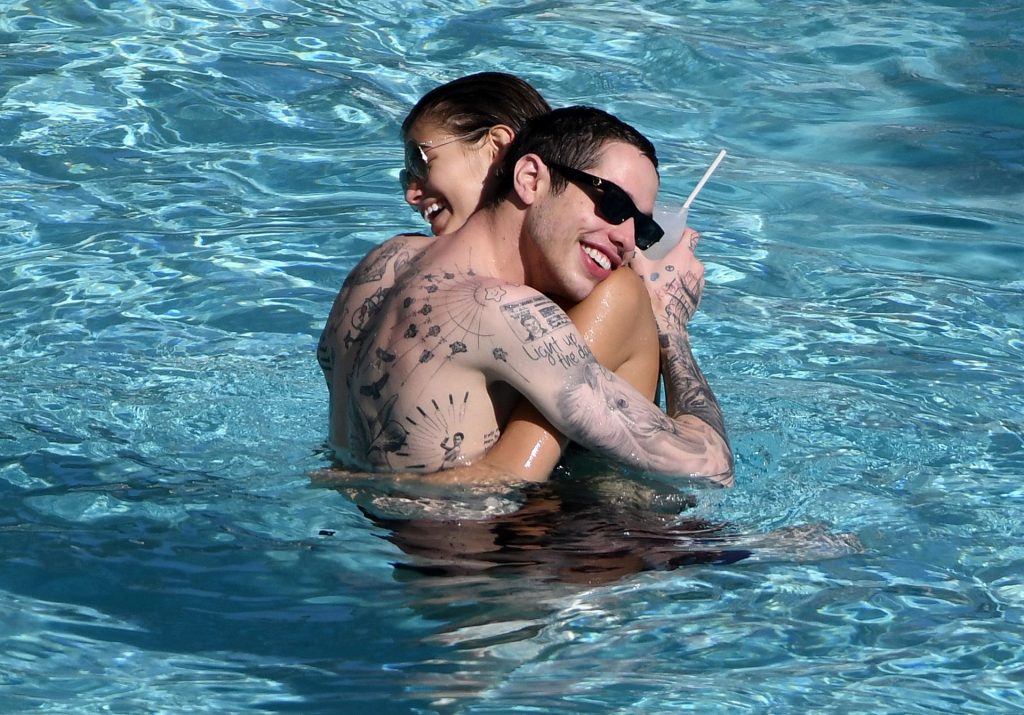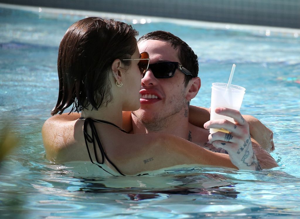 Дочь Синди Кроуфорд, модель Каия Гербер, в черном бикини целует своего парня Пита Дэвидсона у бассейна в Майами, 23.11.2019.