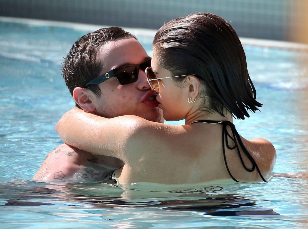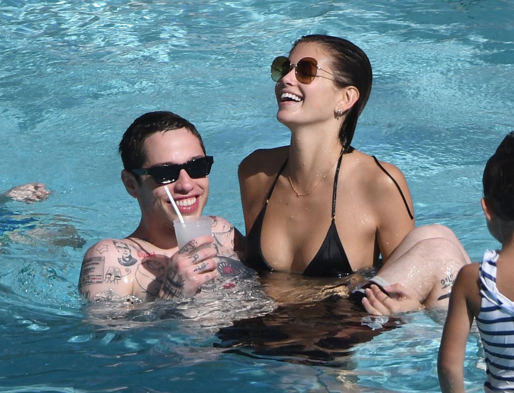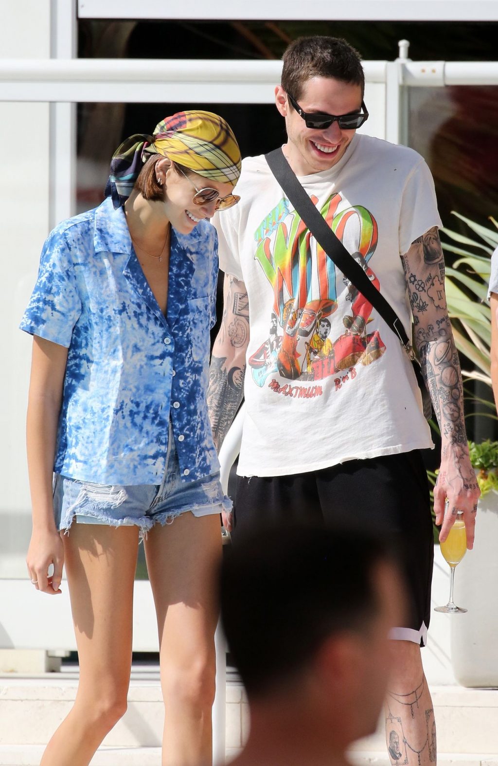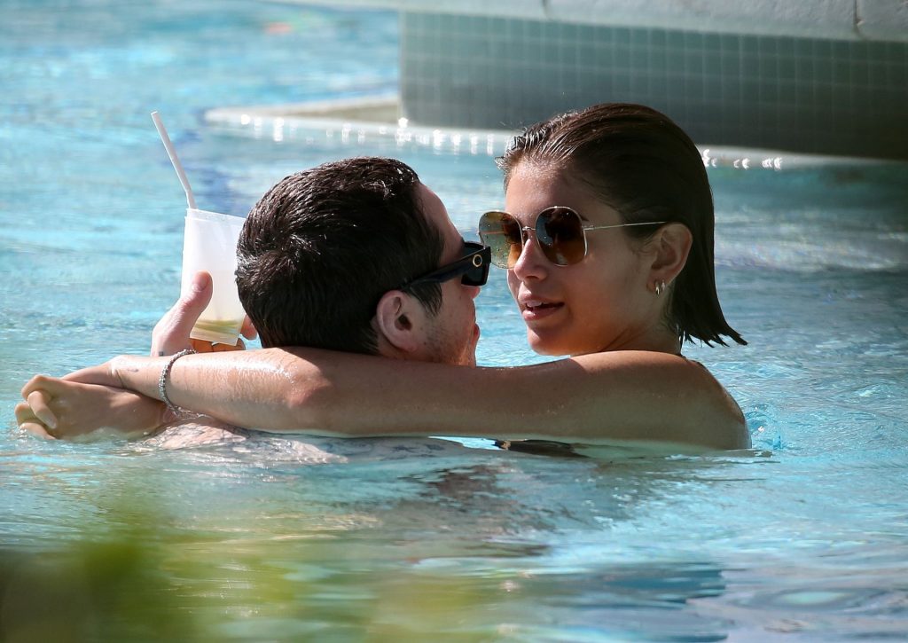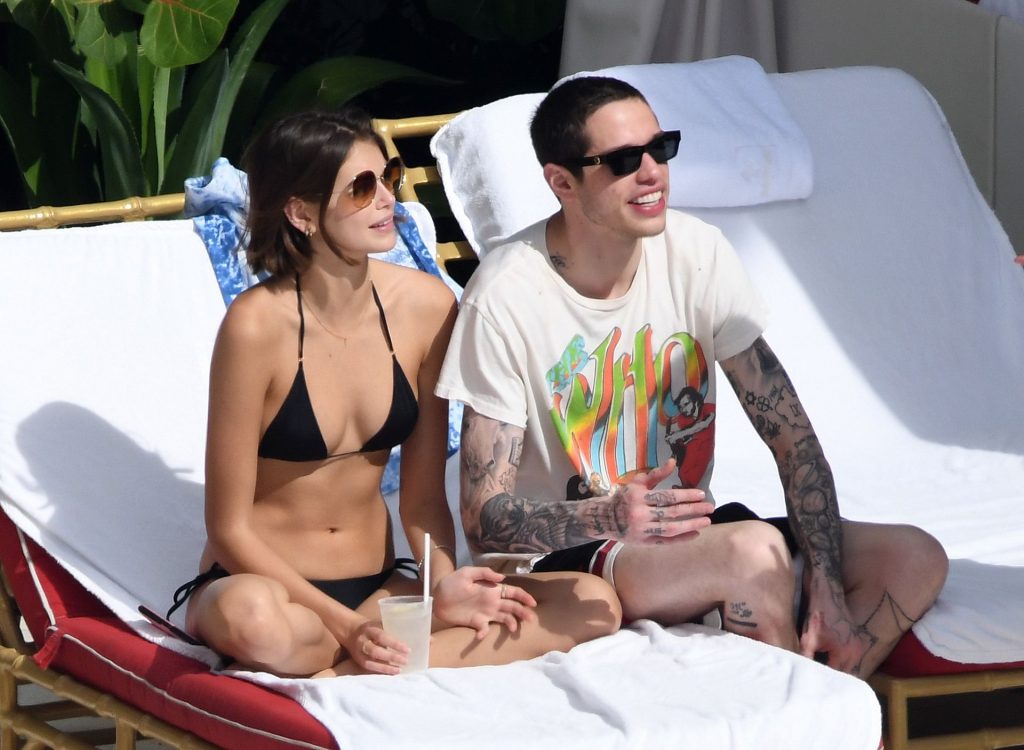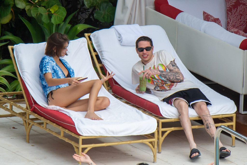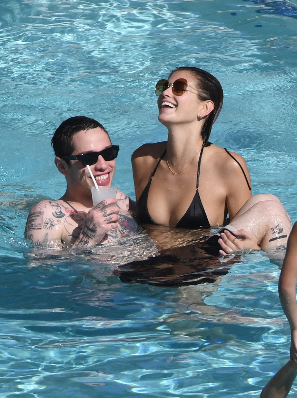Дочь Синди Кроуфорд, модель Каия Гербер, в черном бикини целует своего парня Пита Дэвидсона у бассейна в Майами, 23.11.2019.