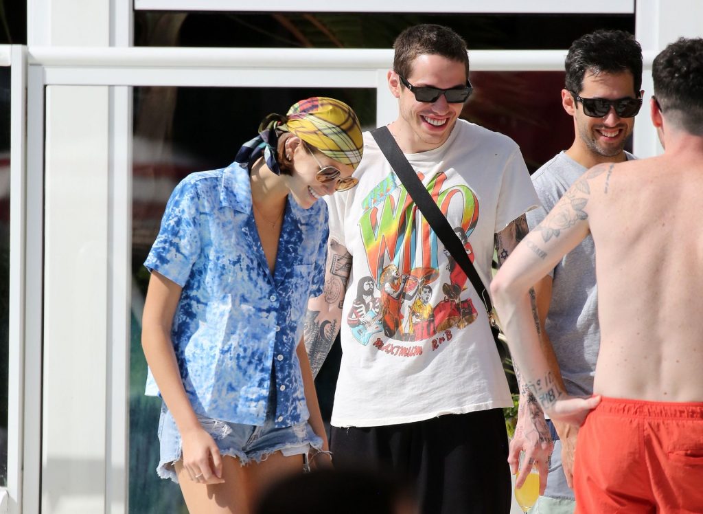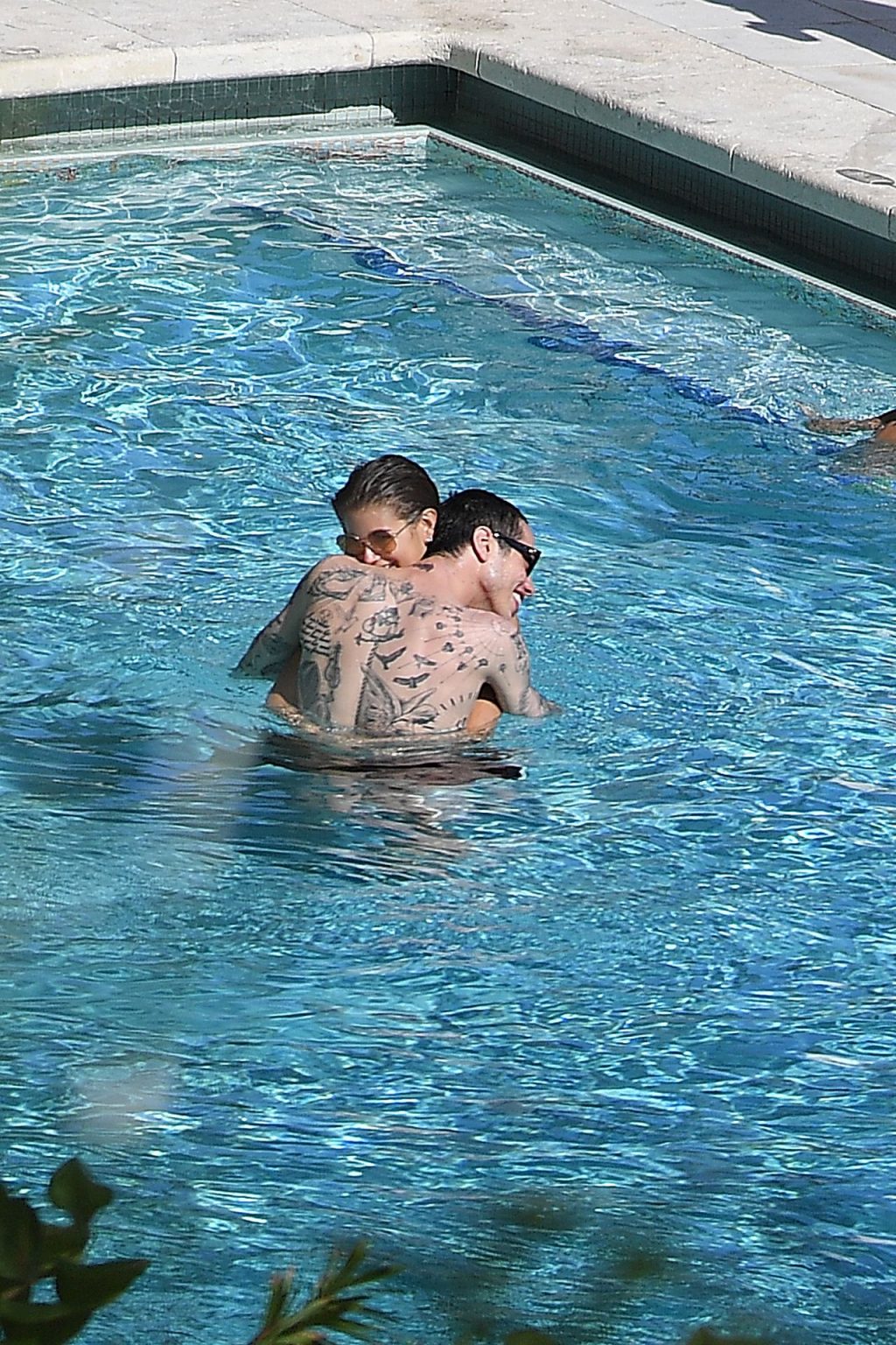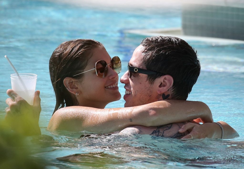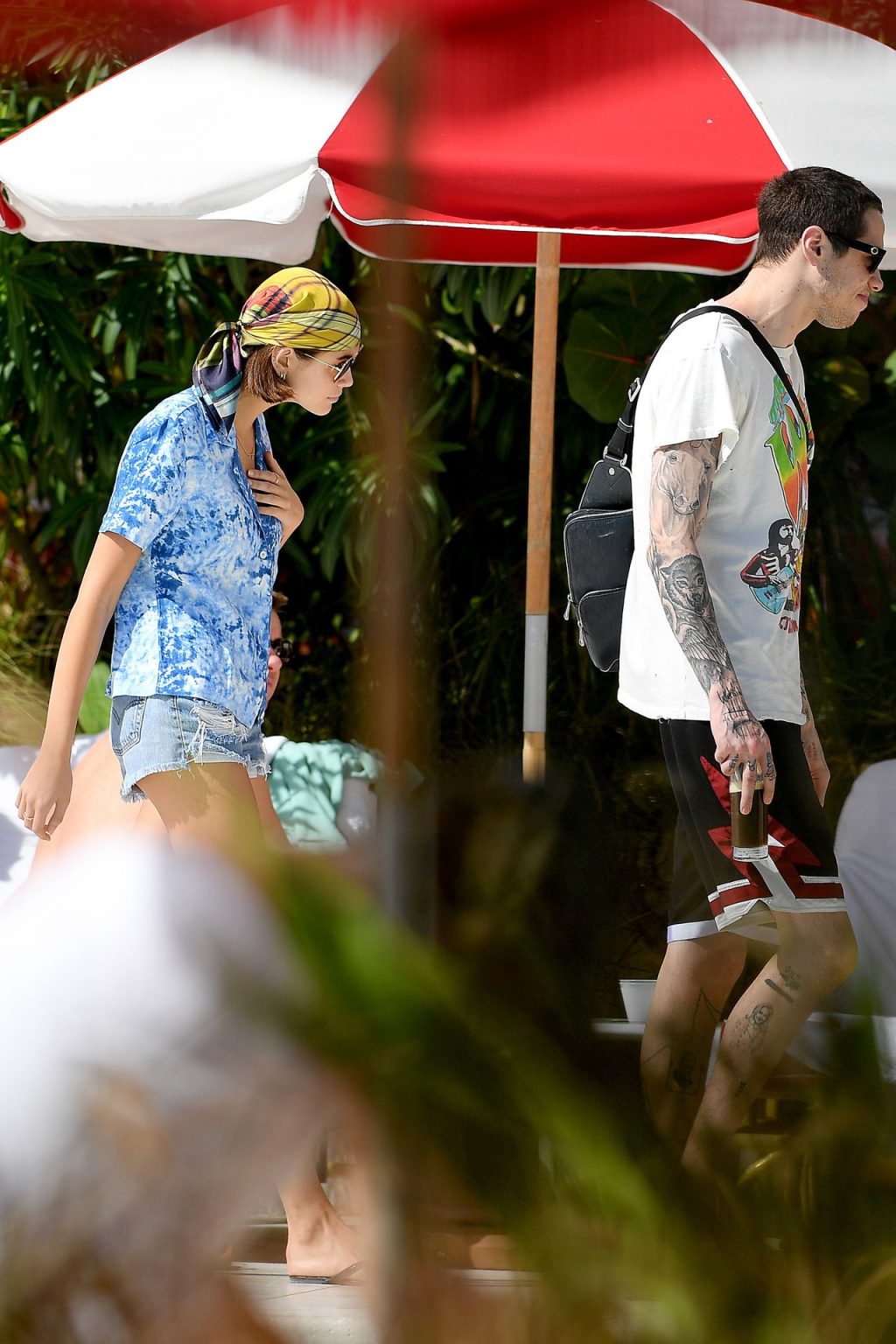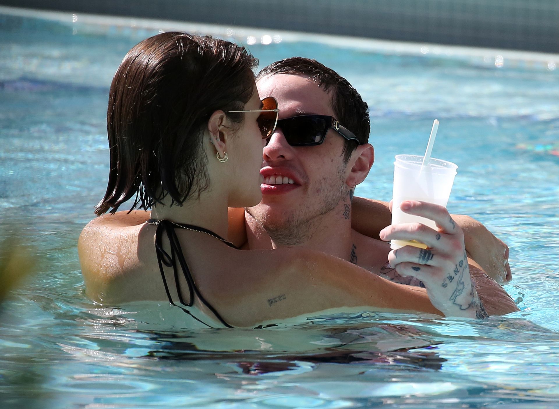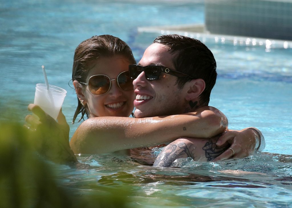 Дочь Синди Кроуфорд, модель Каия Гербер, в черном бикини целует своего парня Пита Дэвидсона у бассейна в Майами, 23.11.2019.