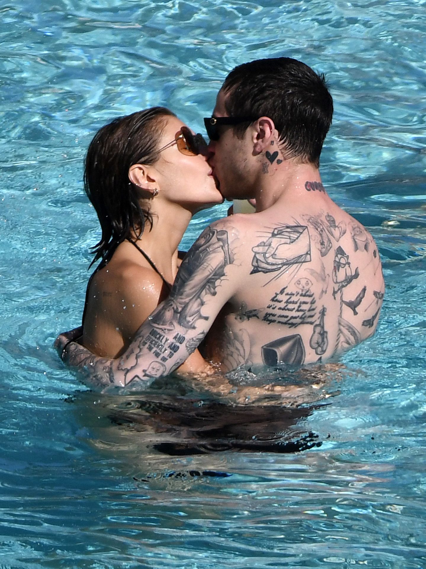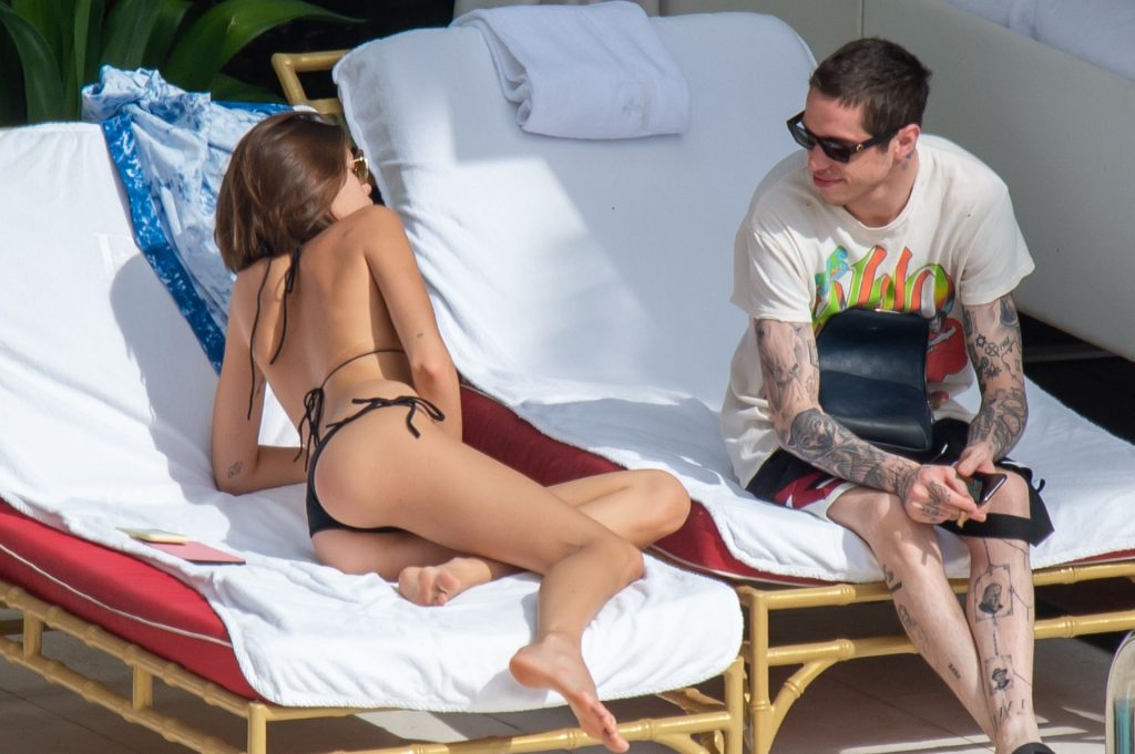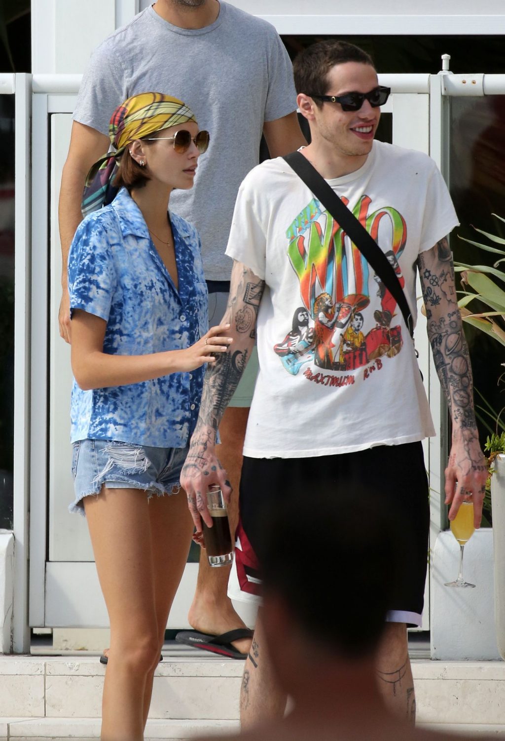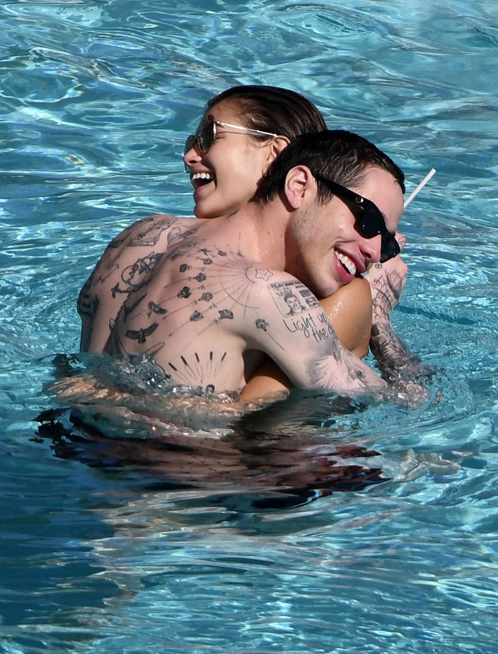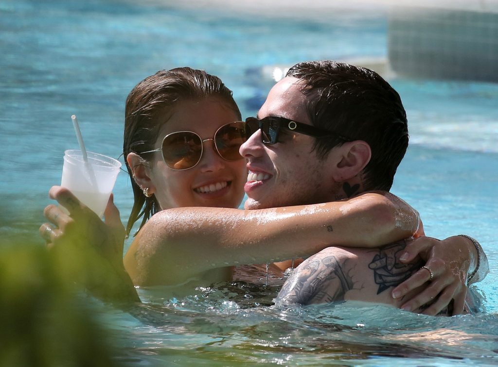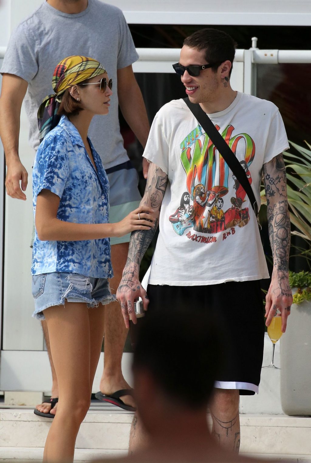 Дочь Синди Кроуфорд, модель Каия Гербер, в черном бикини целует своего парня Пита Дэвидсона у бассейна в Майами, 23.11.2019.