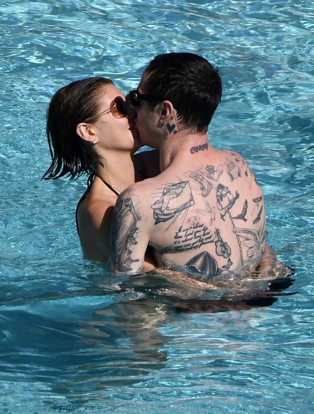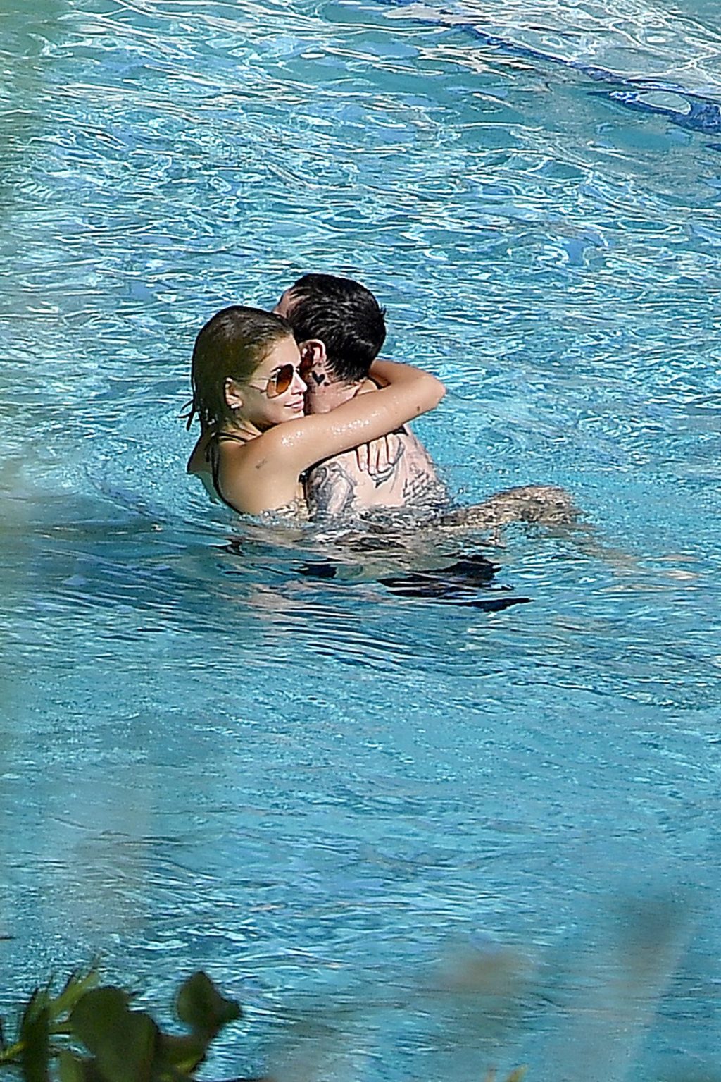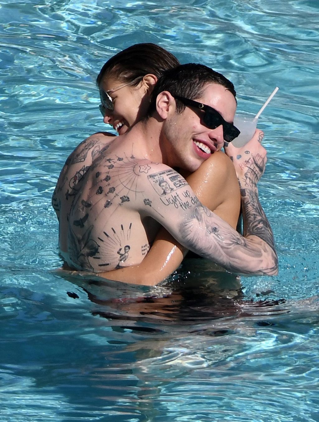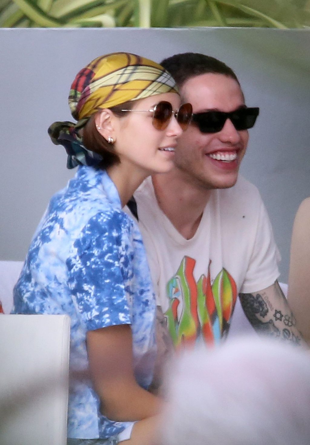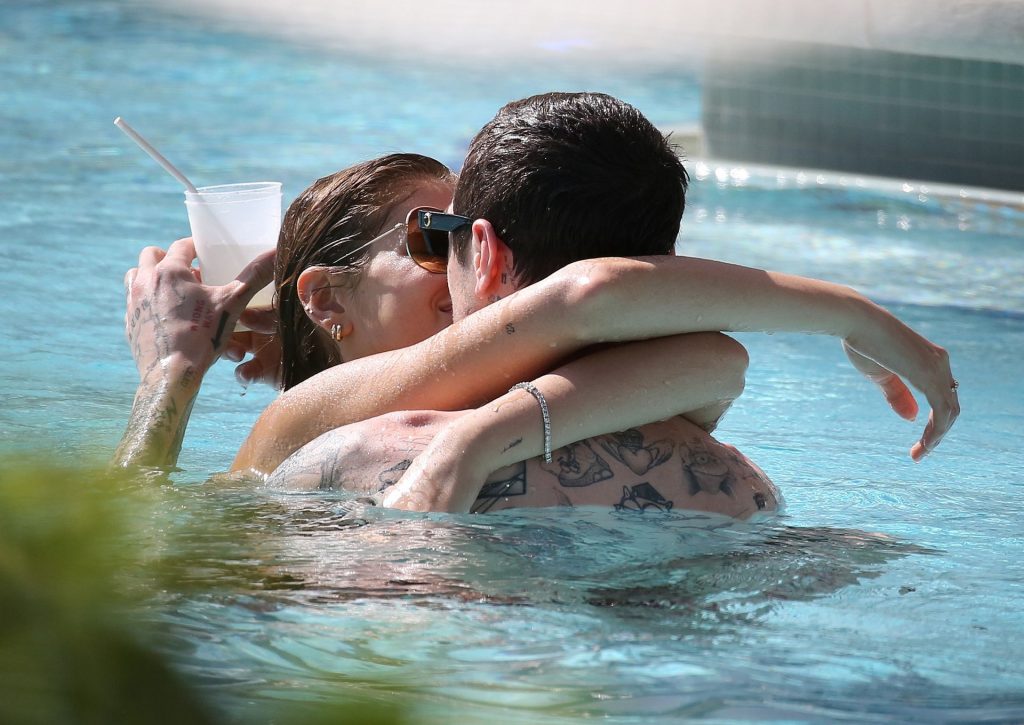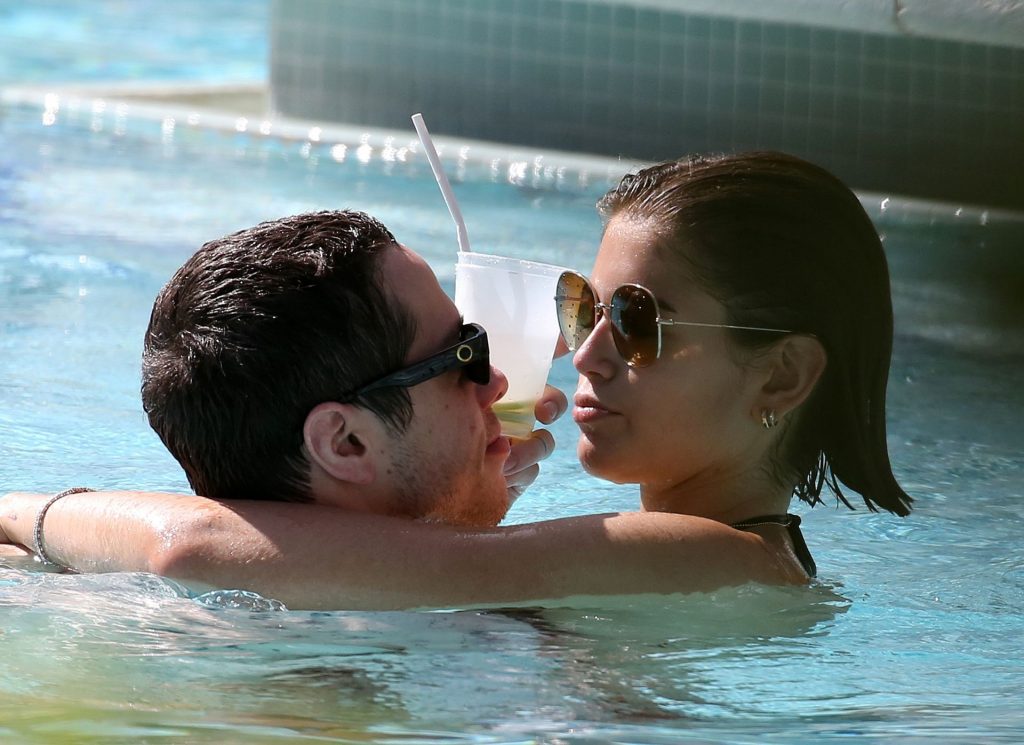 Дочь Синди Кроуфорд, модель Каия Гербер, в черном бикини целует своего парня Пита Дэвидсона у бассейна в Майами, 23.11.2019.