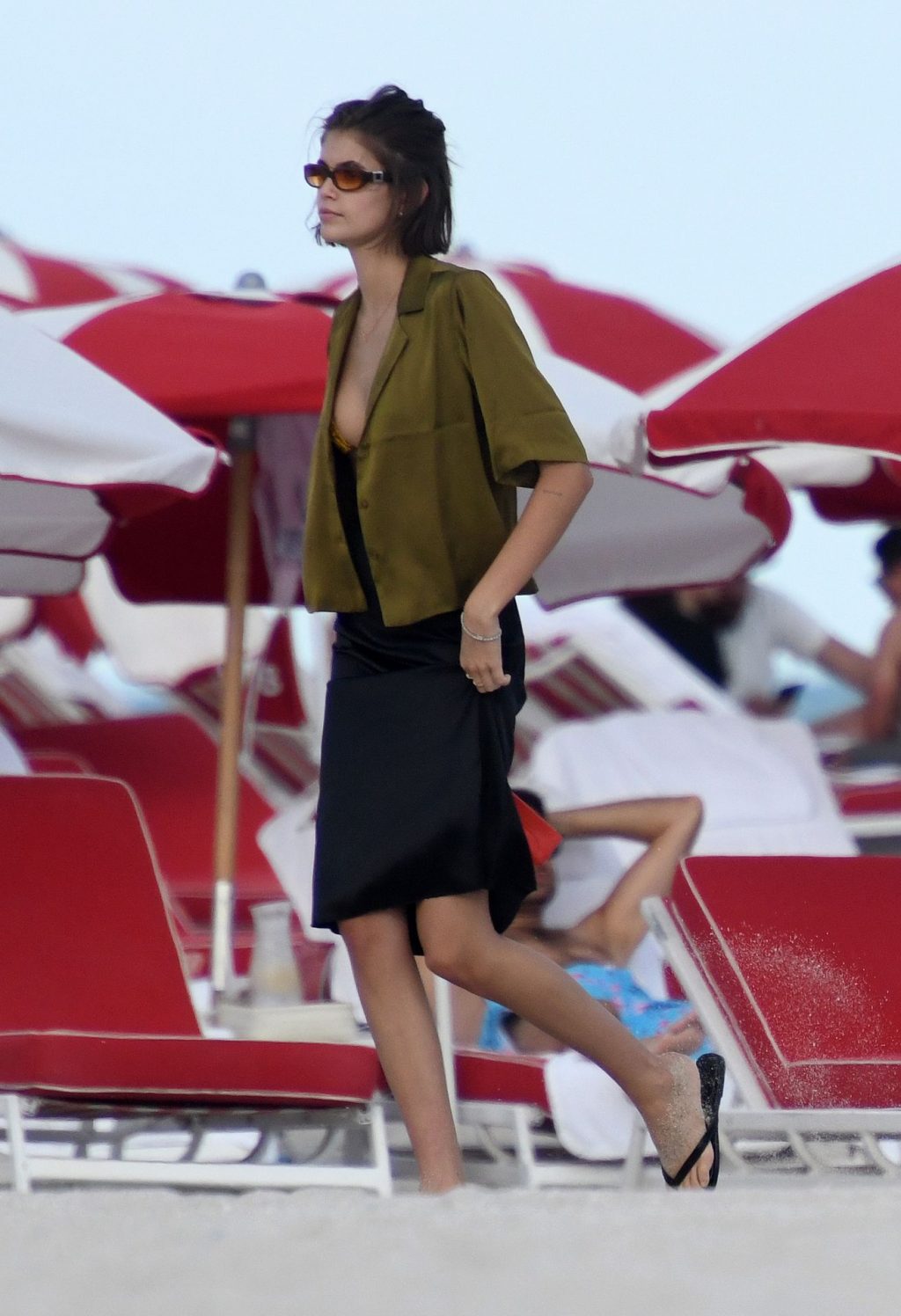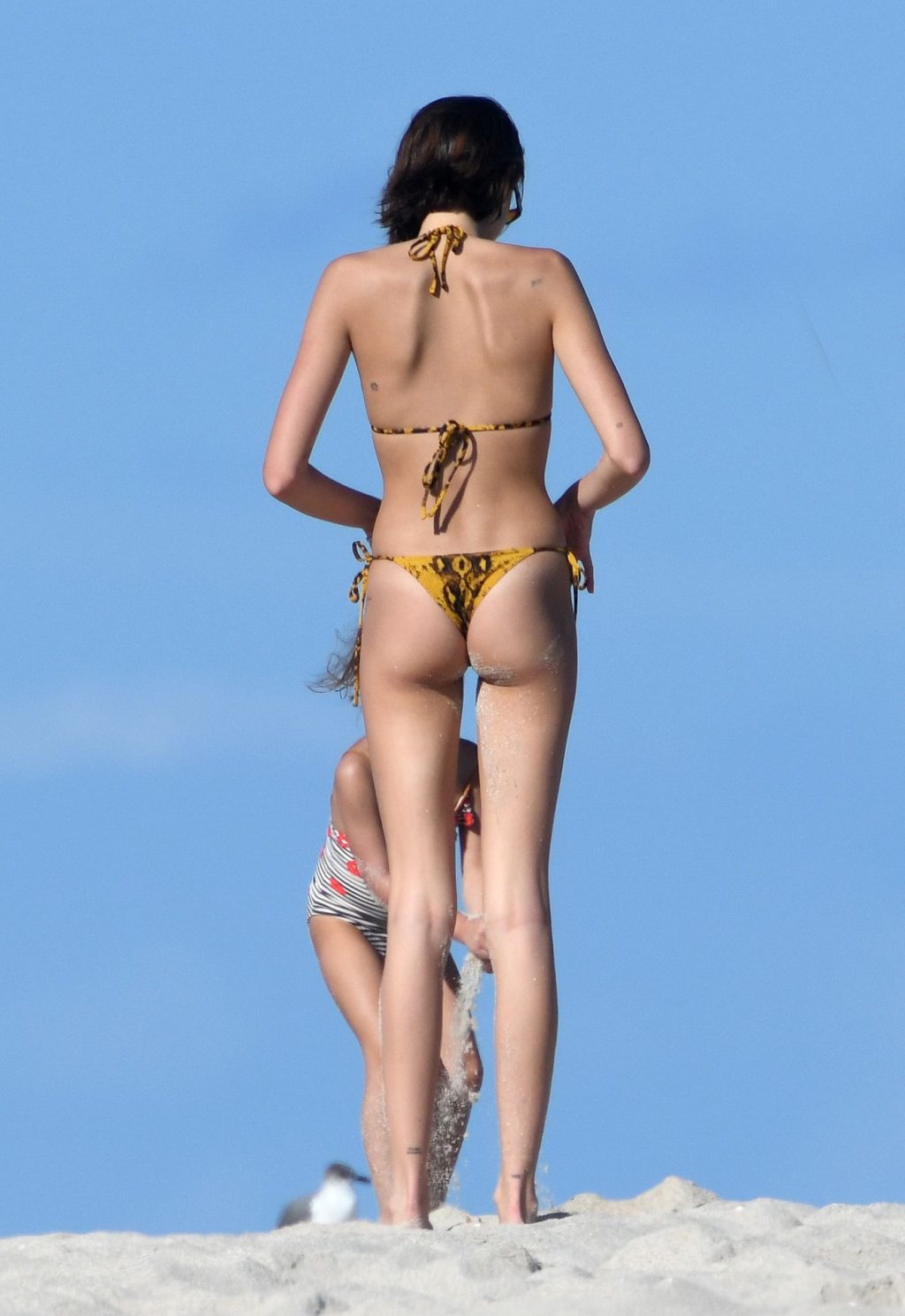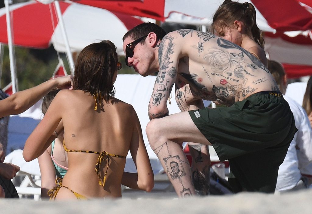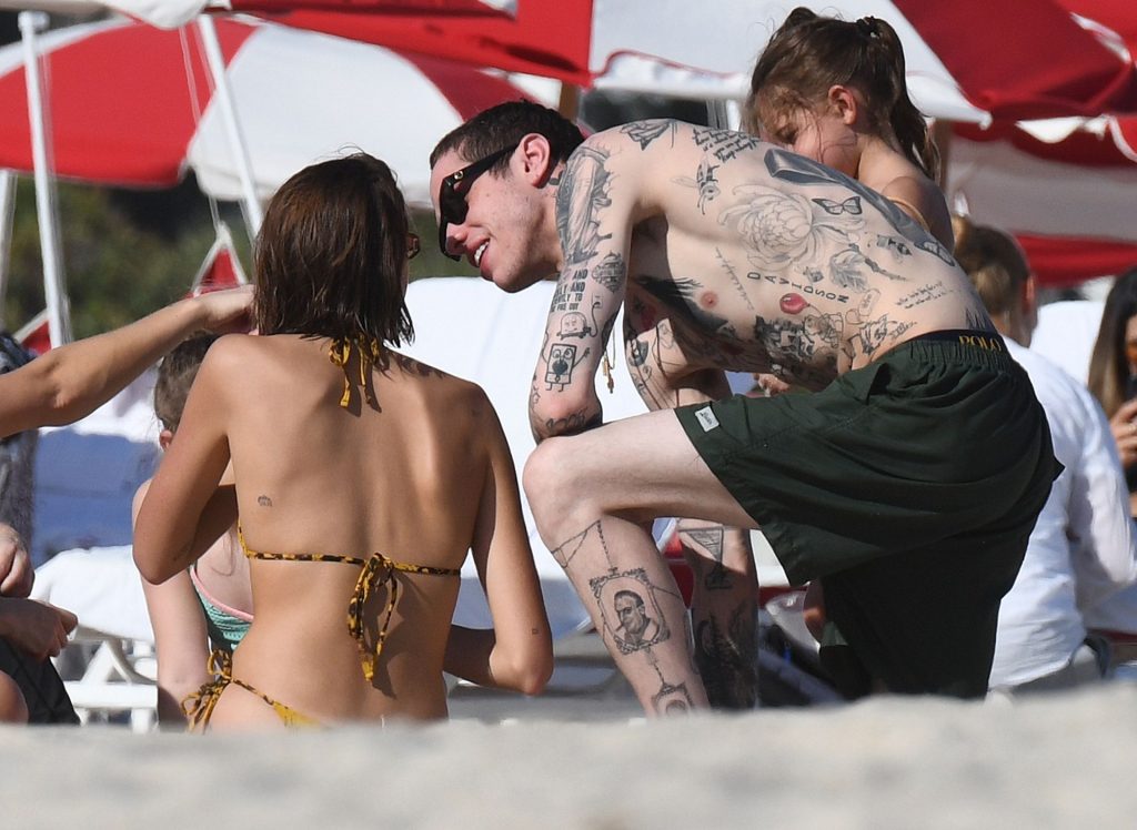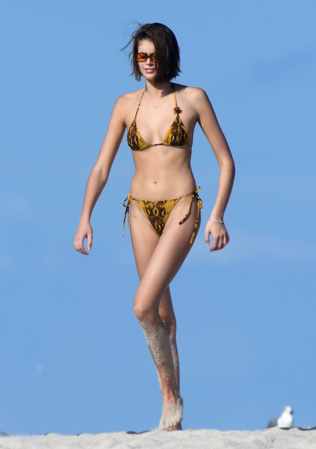 Модель Каия Гербер носит крошечный желто-черный бикини с принтом под змеиную кожу, когда получает поцелуй от сильно татуированного бойфренда Пита Дэвидсона на пляже в Майами, 22.11.2019.
