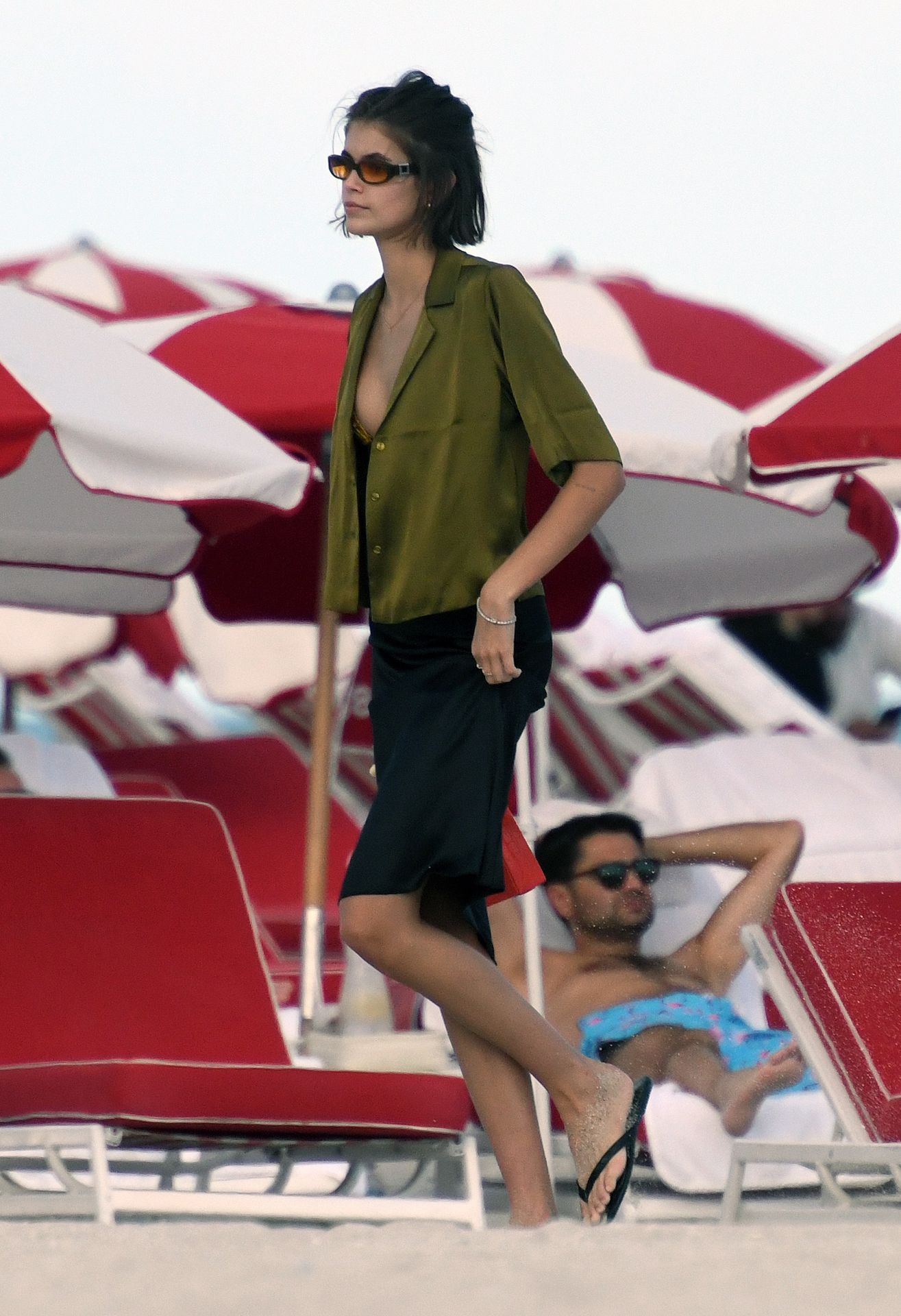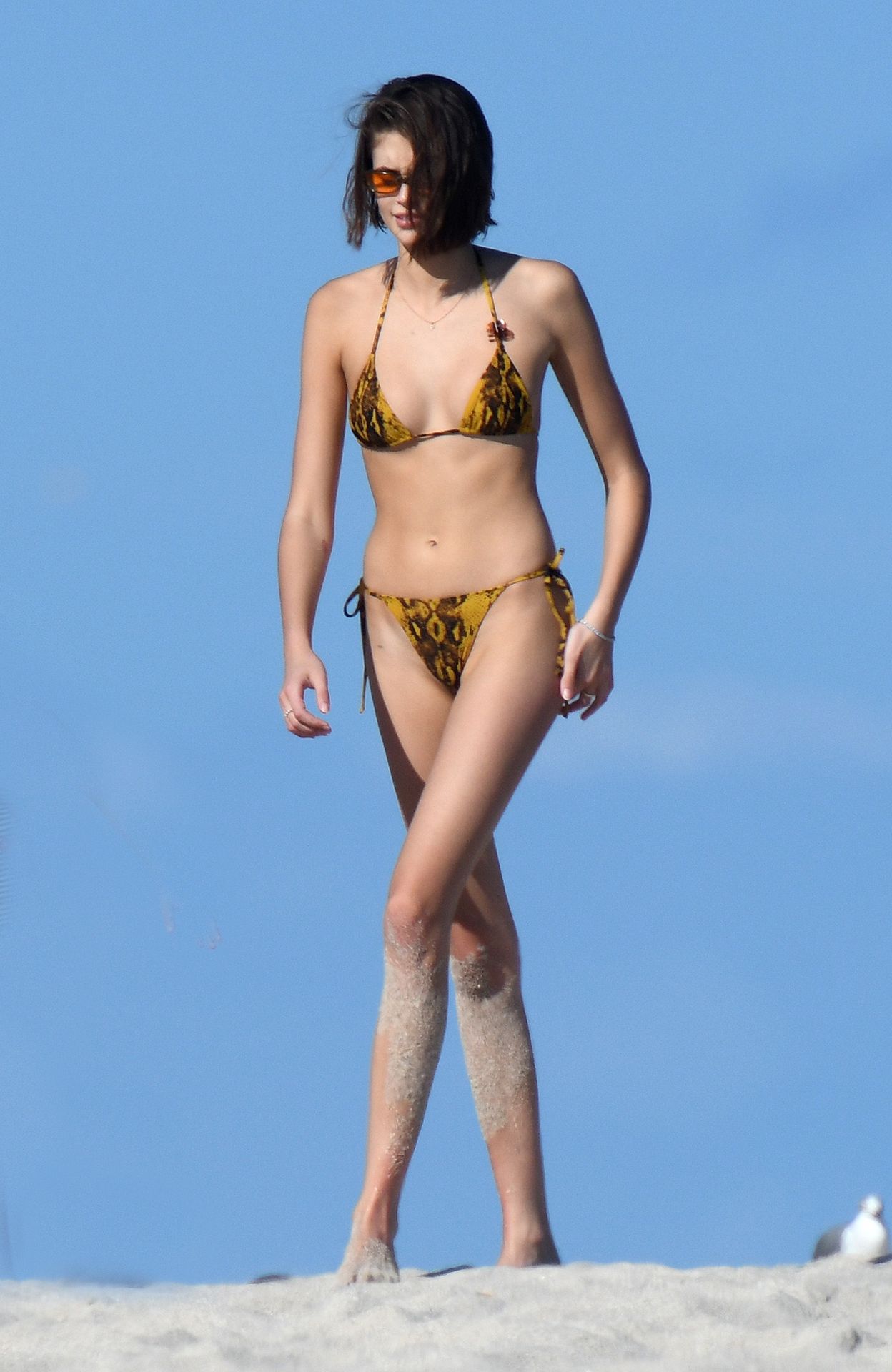 Модель Каия Гербер носит крошечный желто-черный бикини с принтом под змеиную кожу, когда получает поцелуй от сильно татуированного бойфренда Пита Дэвидсона на пляже в Майами, 22.11.2019.