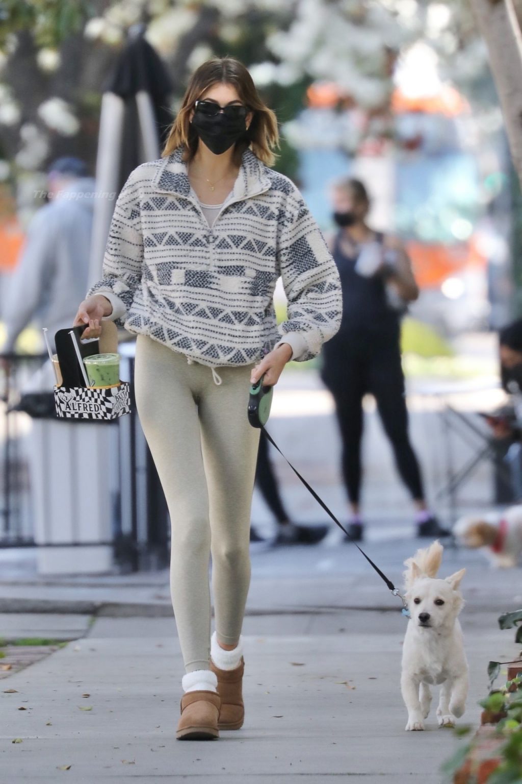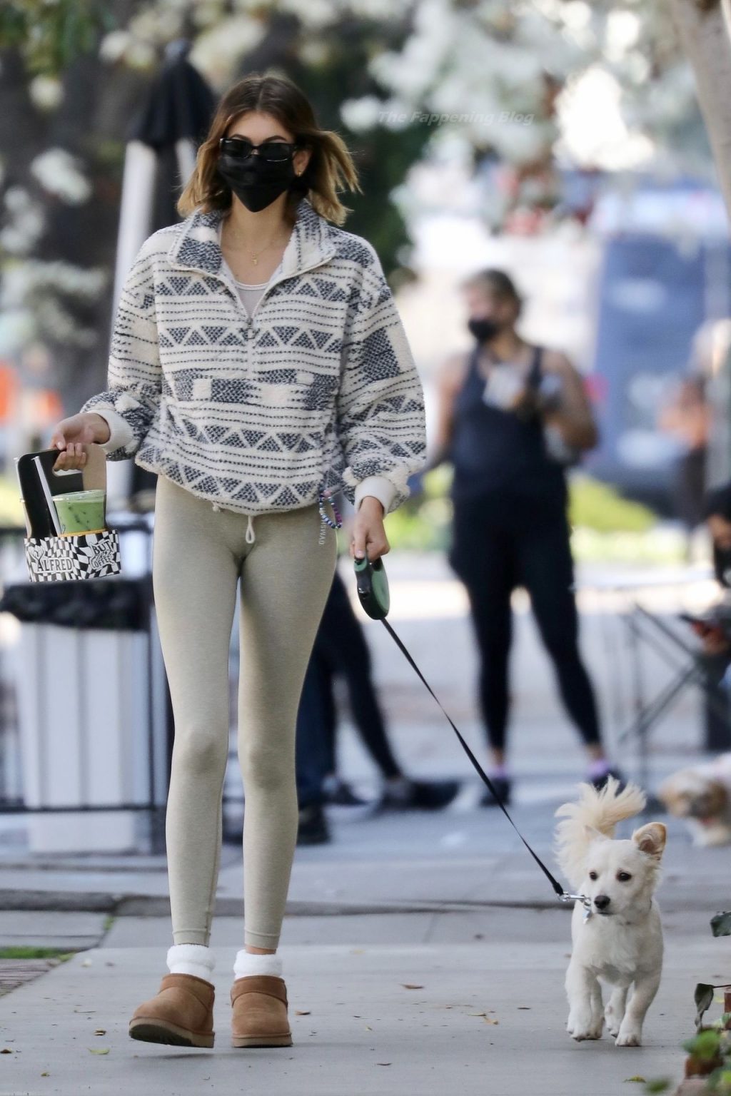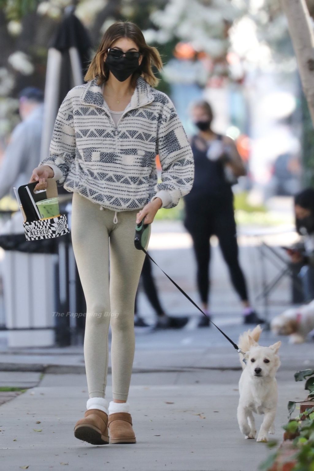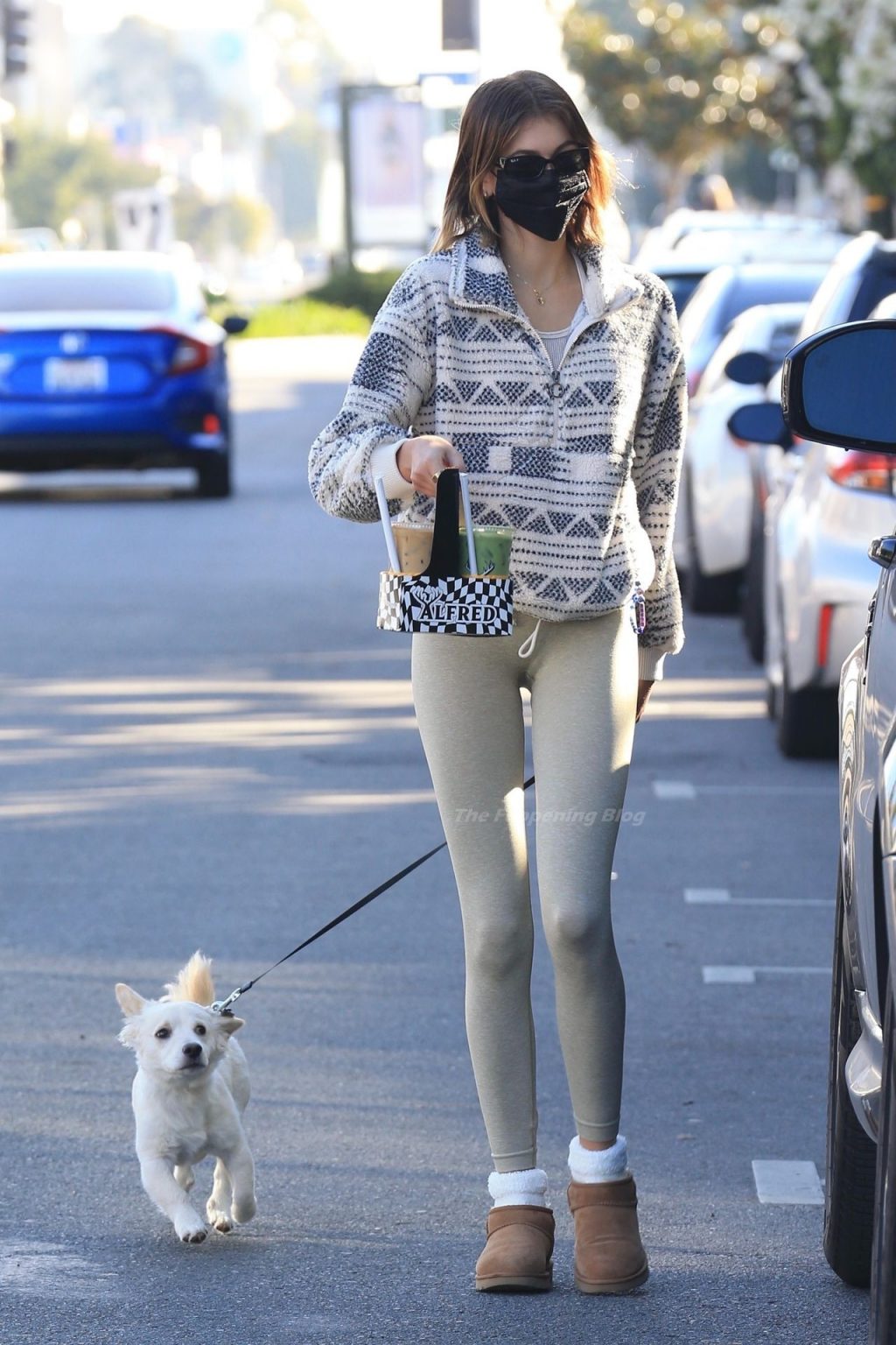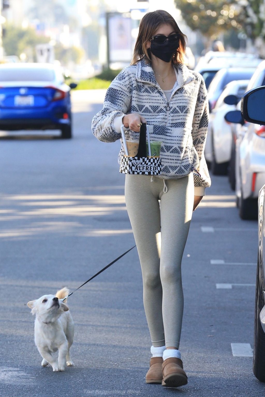 Супермодель Кайя Гербер выглядит уютно и тепло, останавливаясь на утренний кофе в Alfred Coffee после своей частной тренировки по пилатесу в Лос-Анджелесе, 02/02/2021. Ее сопровождал ее пес Майло.