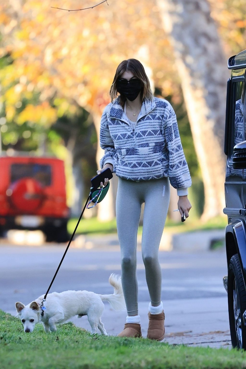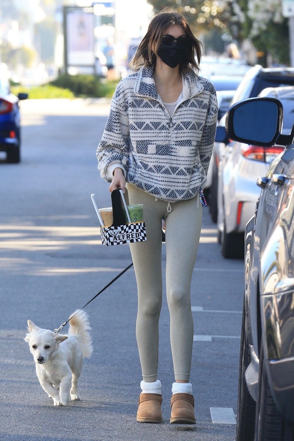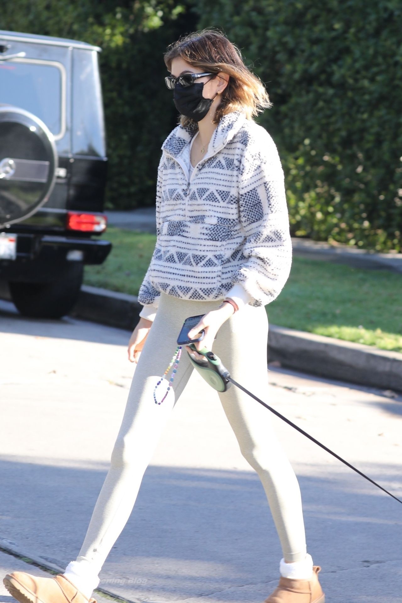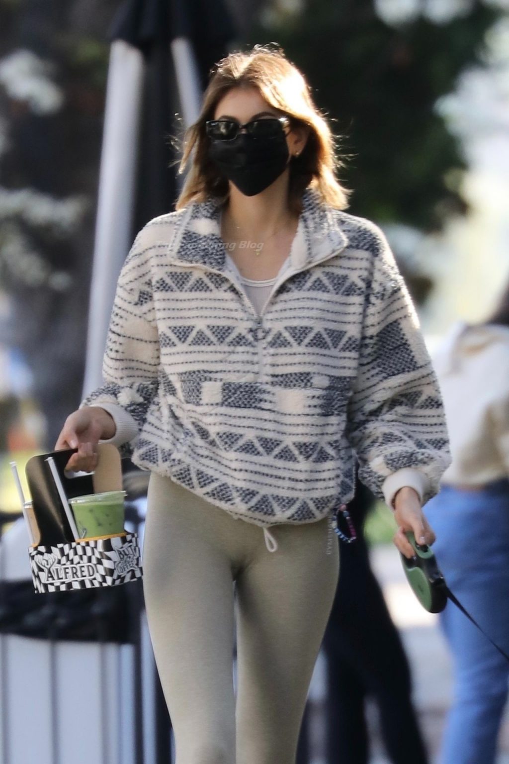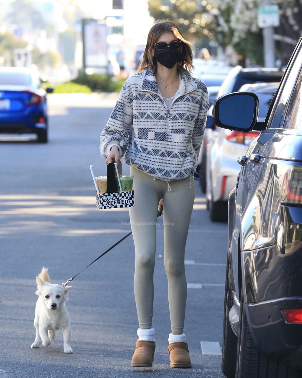 Супермодель Кайя Гербер выглядит уютно и тепло, останавливаясь на утренний кофе в Alfred Coffee после своей частной тренировки по пилатесу в Лос-Анджелесе, 02/02/2021. Ее сопровождал ее пес Майло.