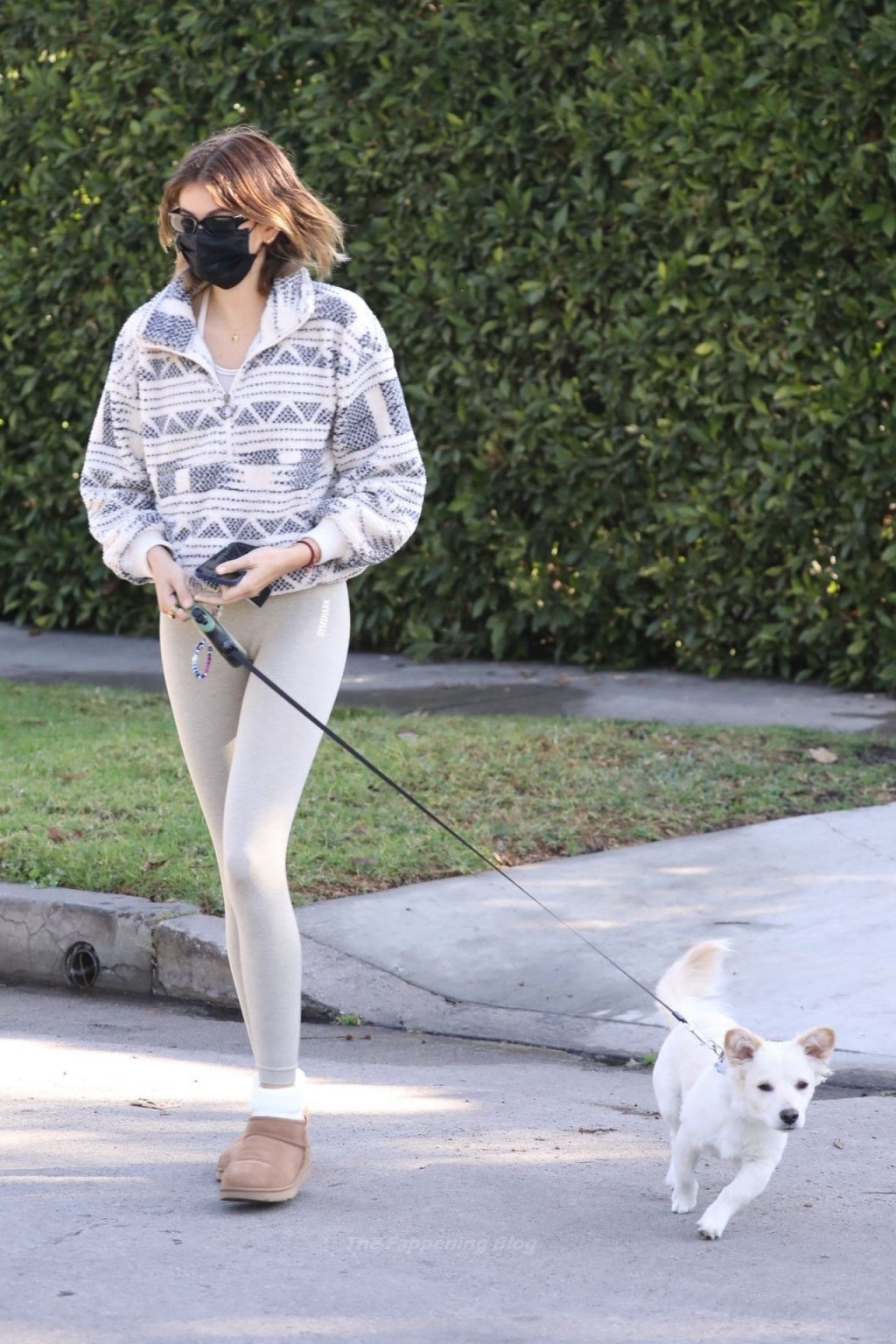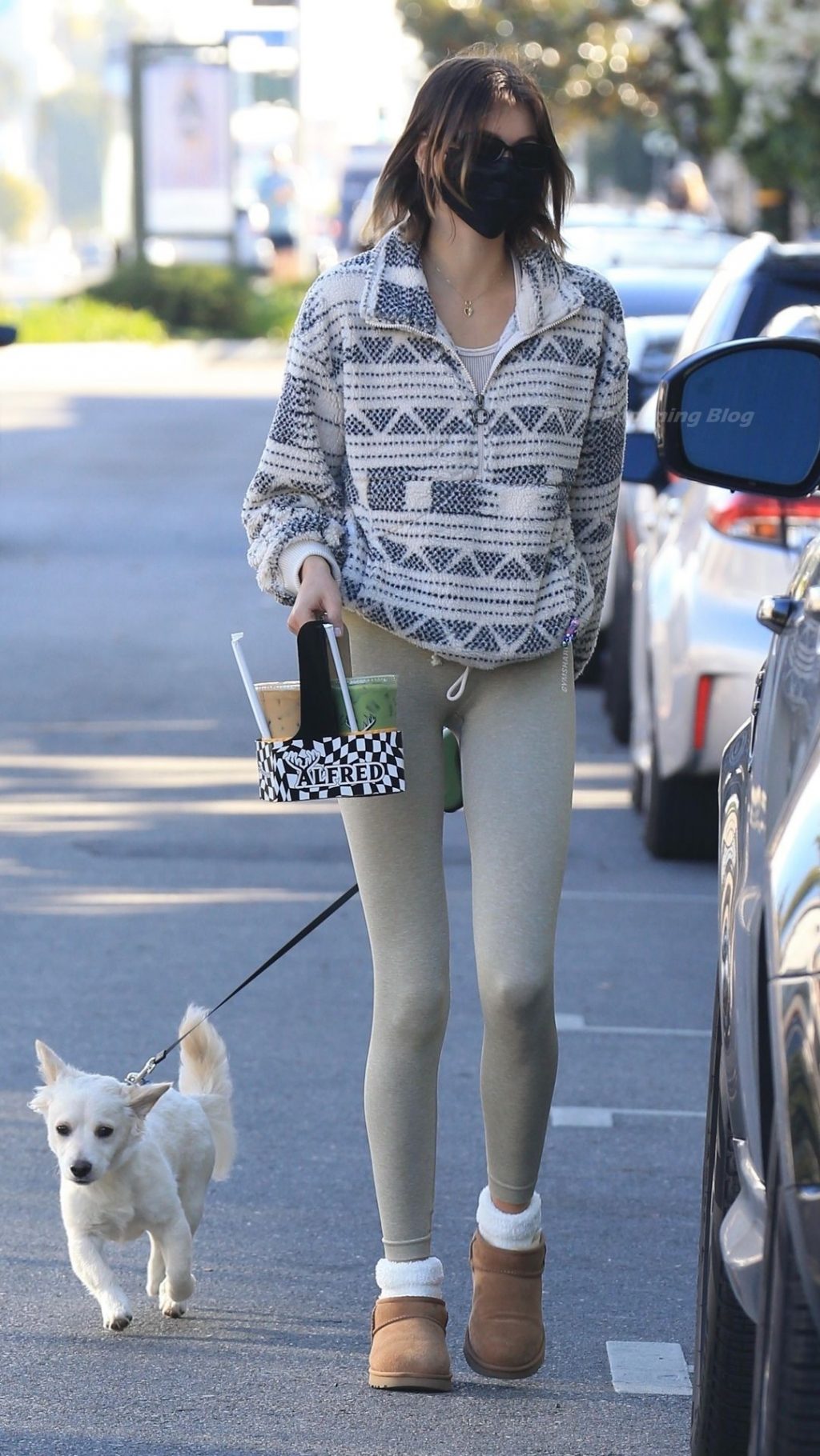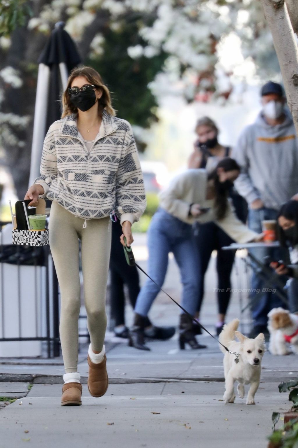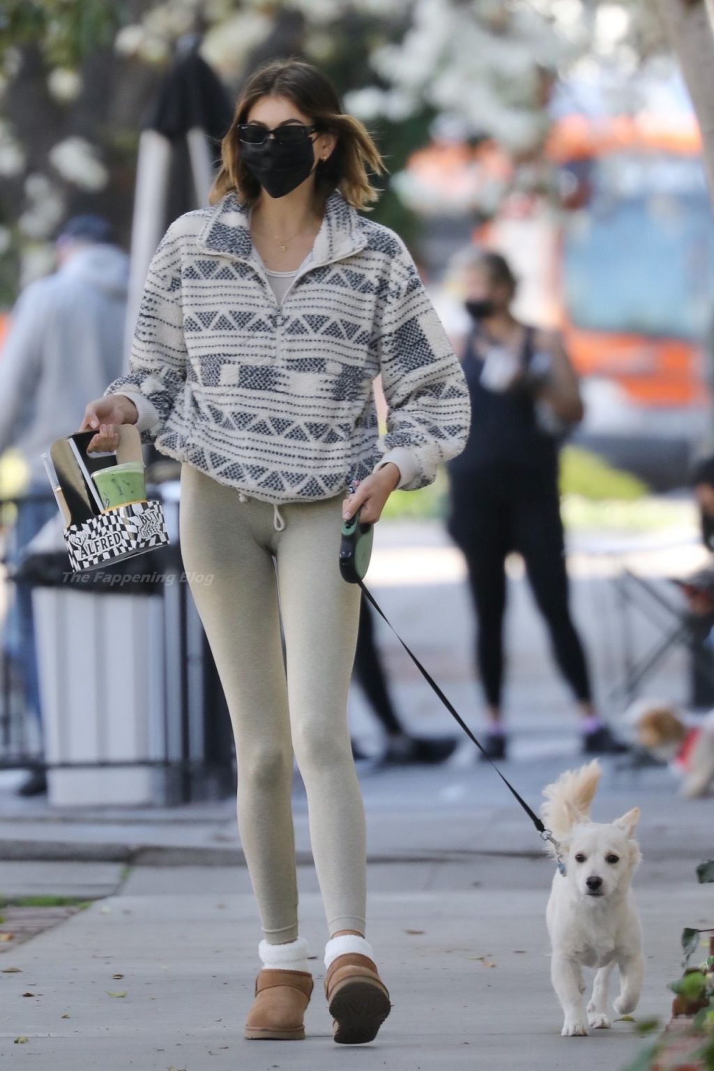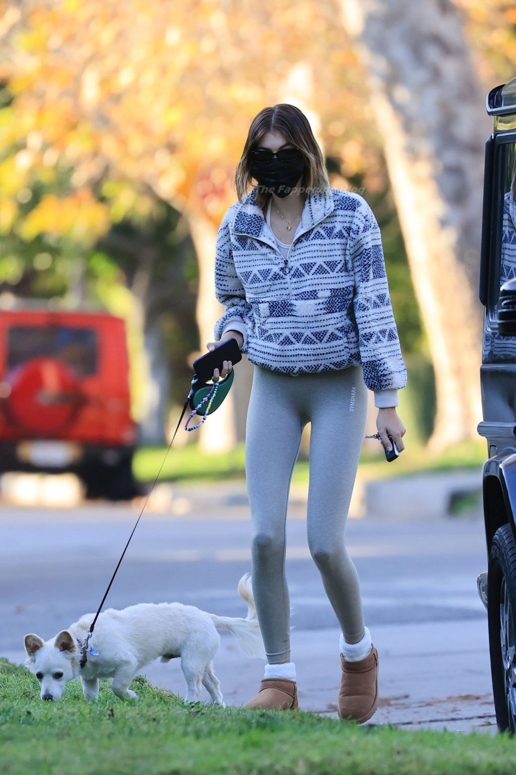 Супермодель Кайя Гербер выглядит уютно и тепло, останавливаясь на утренний кофе в Alfred Coffee после своей частной тренировки по пилатесу в Лос-Анджелесе, 02/02/2021. Ее сопровождал ее пес Майло.