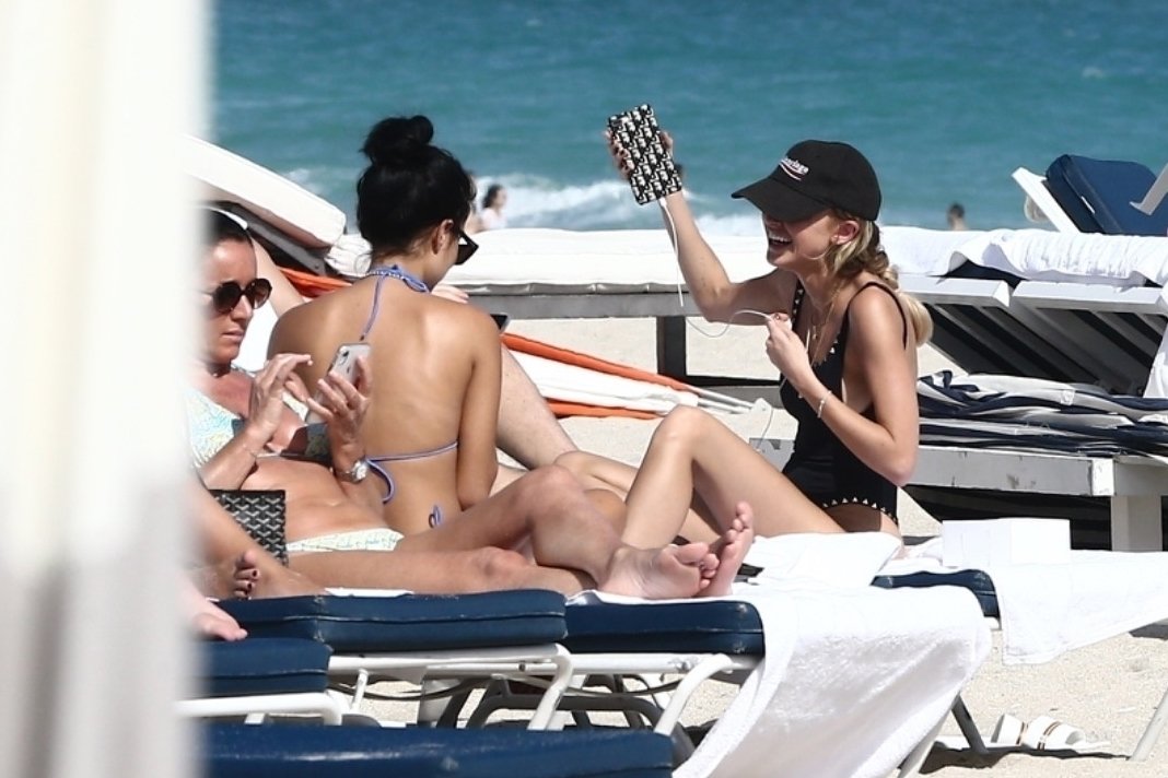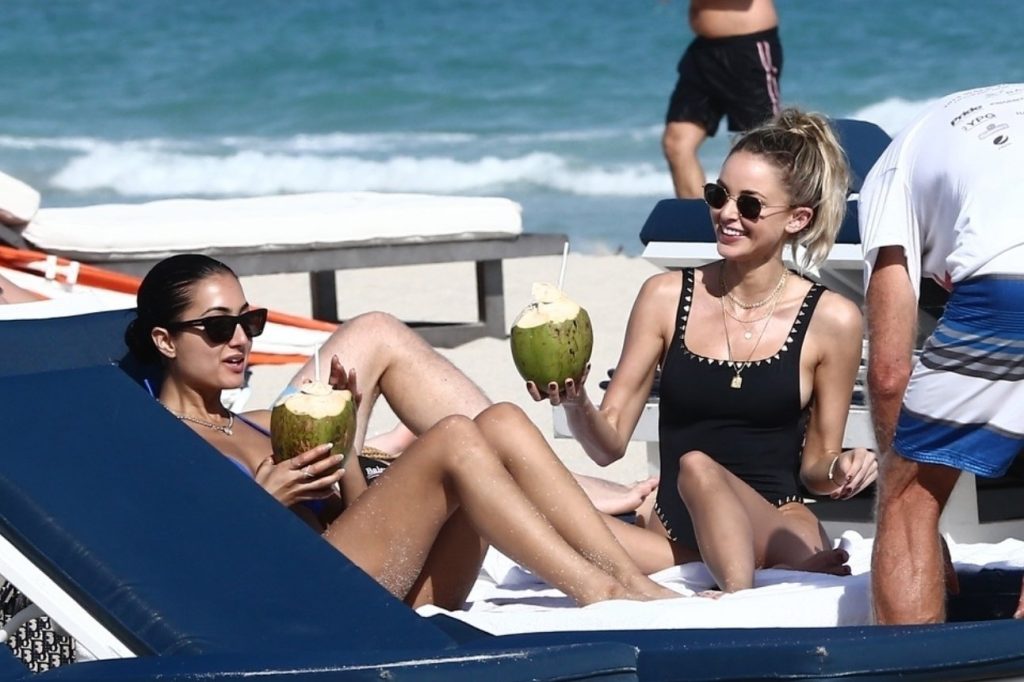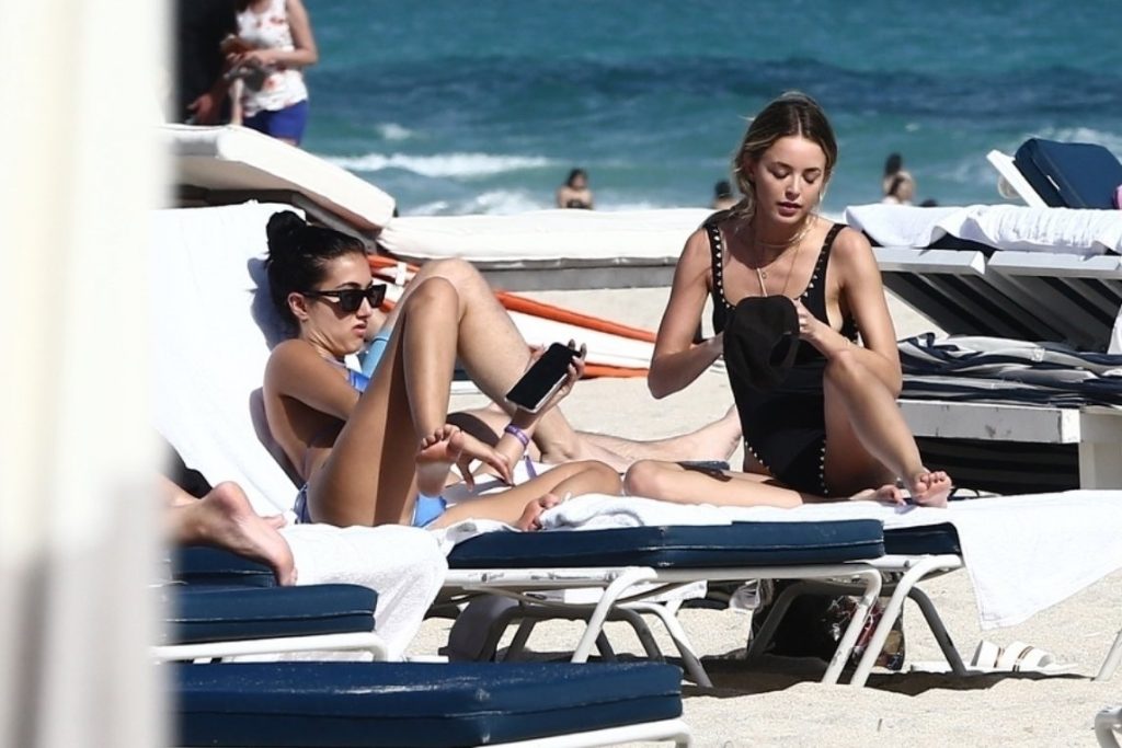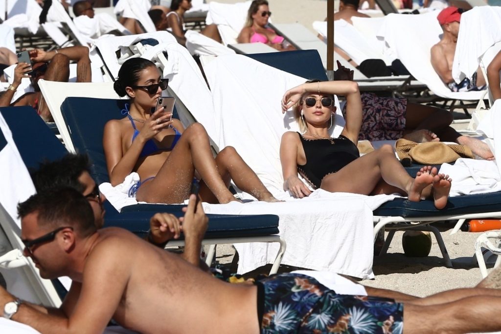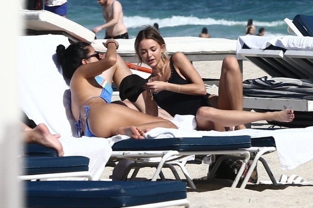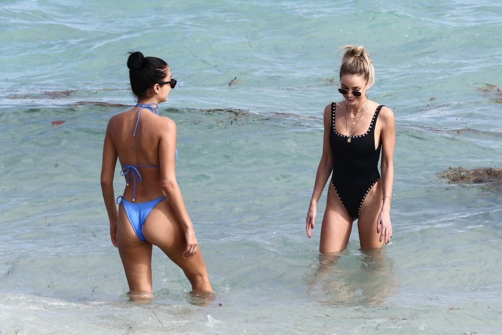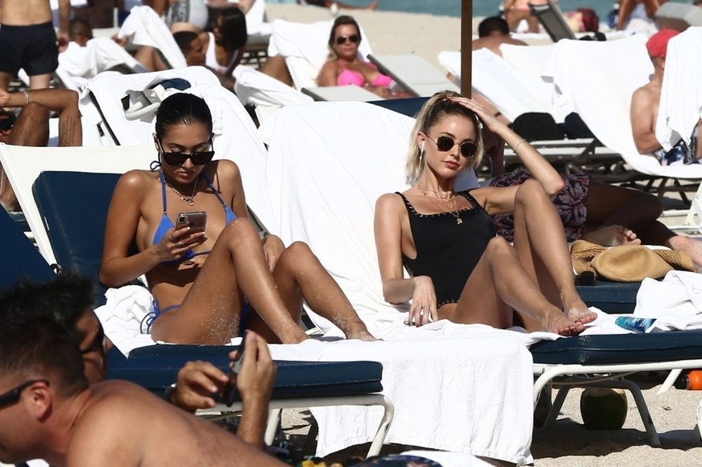 Личность из социальных сетей Кейтлин Картер наслаждается днем на пляже с Ракель Наташей во время Art Basel в Майами, 10.12.2019.