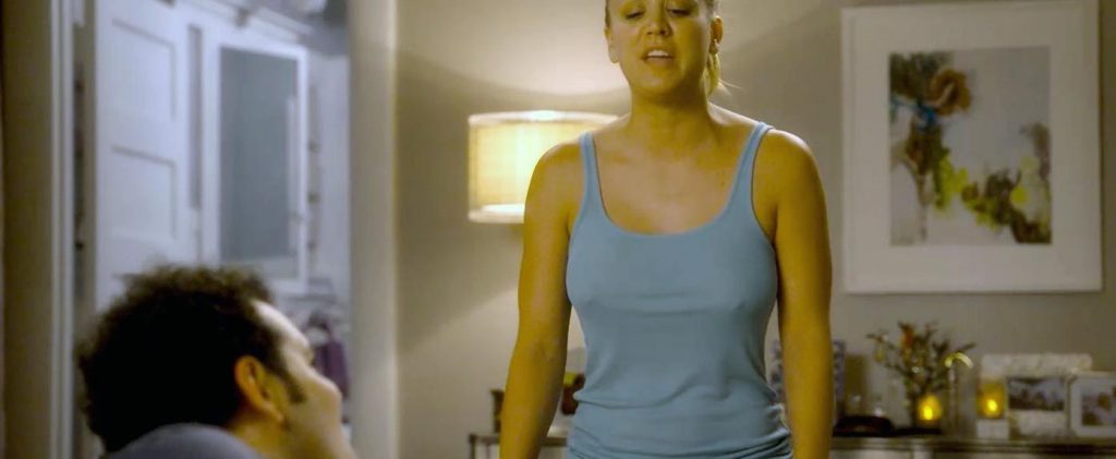 The first scene is from a movie called ‘The Wedding Ringer’. Kaley Cuoco walks into the room braless as she comes out of a bathroom arguing with a man and then sits down on the bed with him while he gives her ice cream and then some earrings while attempting to charm her into having sex with him, all while looking at her hard nipples.