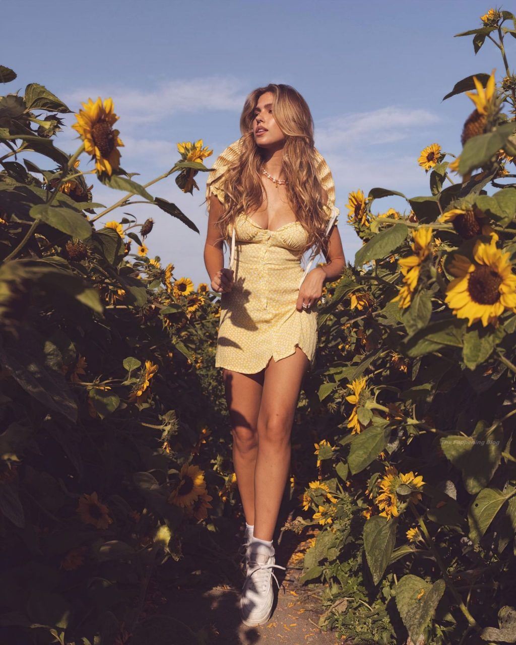 Модель Кара Дел Торо демонстрирует декольте в летнем платье, позируя среди подсолнухов в новой фотосессии для социальных сетей от Меган Батсон (2021).