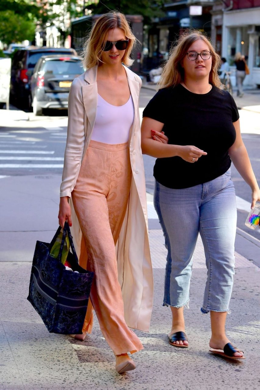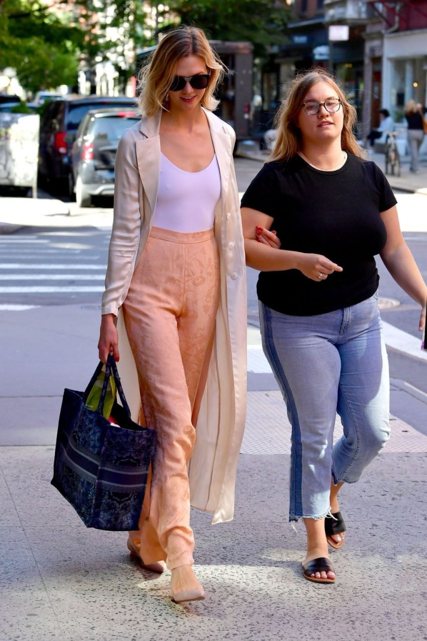 Модель Карли Клосс демонстрирует шикарный летний образ, выходя в сатиновых персиковых брюках с узором и белой футболке с подругой в Нью-Йорке, 11.06.2019.
