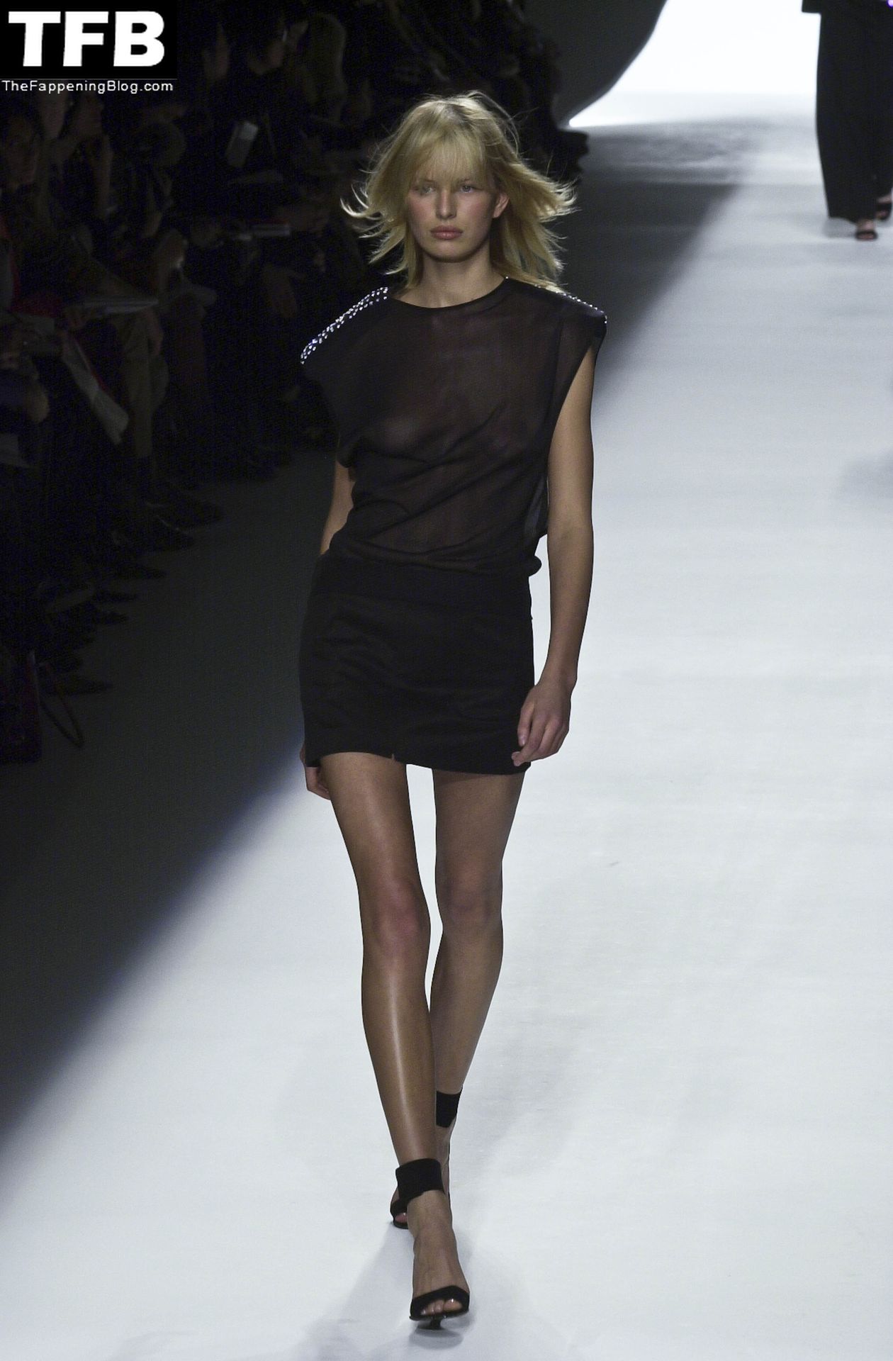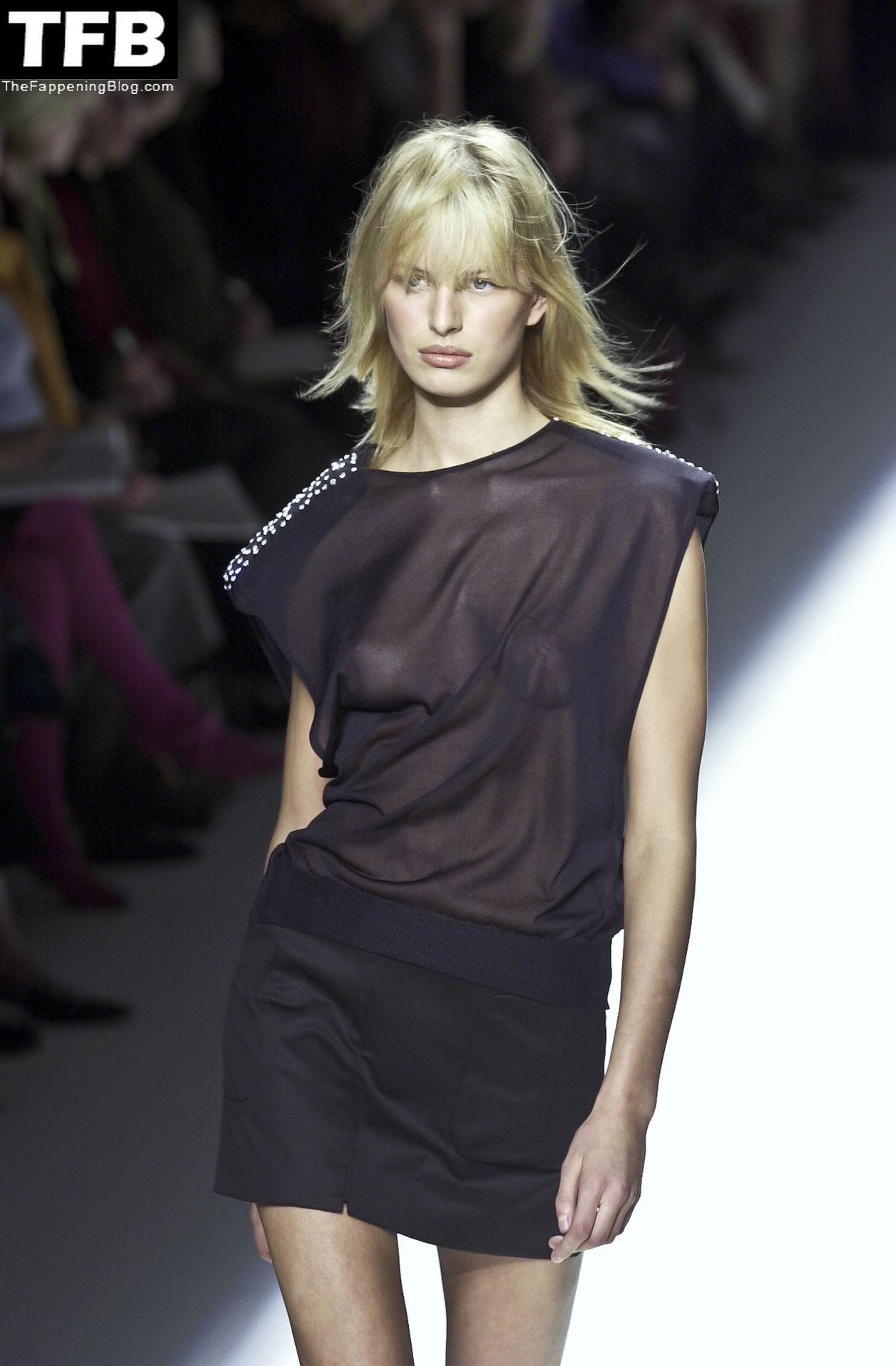 Модель Каролина Куркова демонстрирует свои обнажённые груди, проходя по подиуму во время показа мод Lanvin Весна 2001.