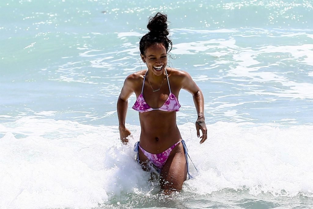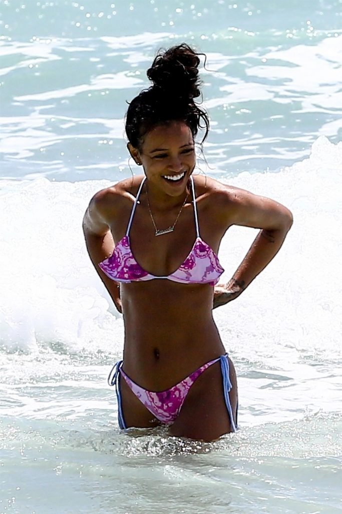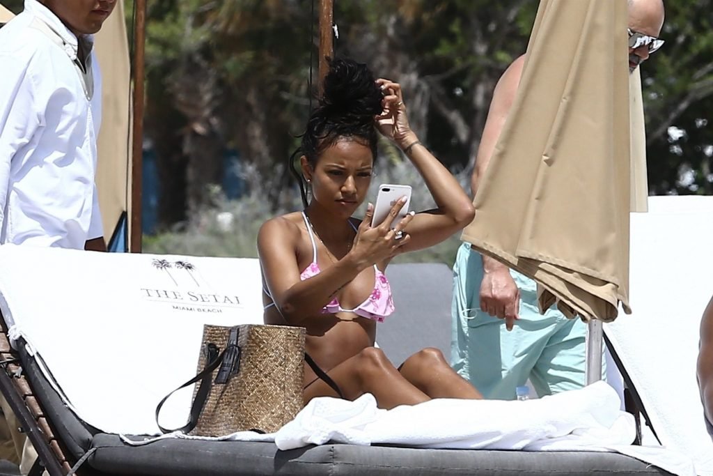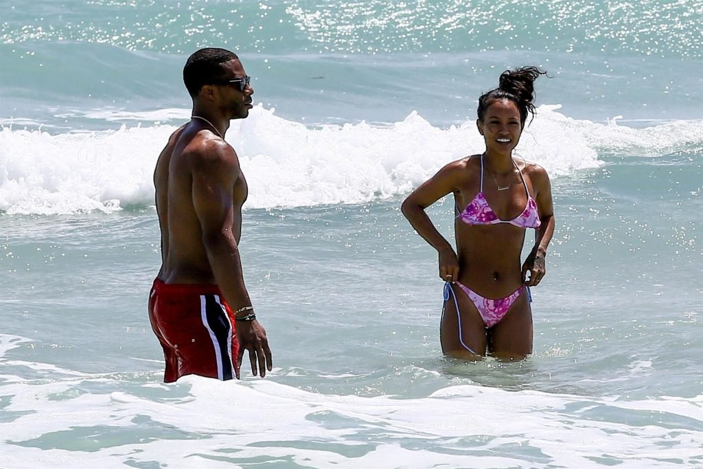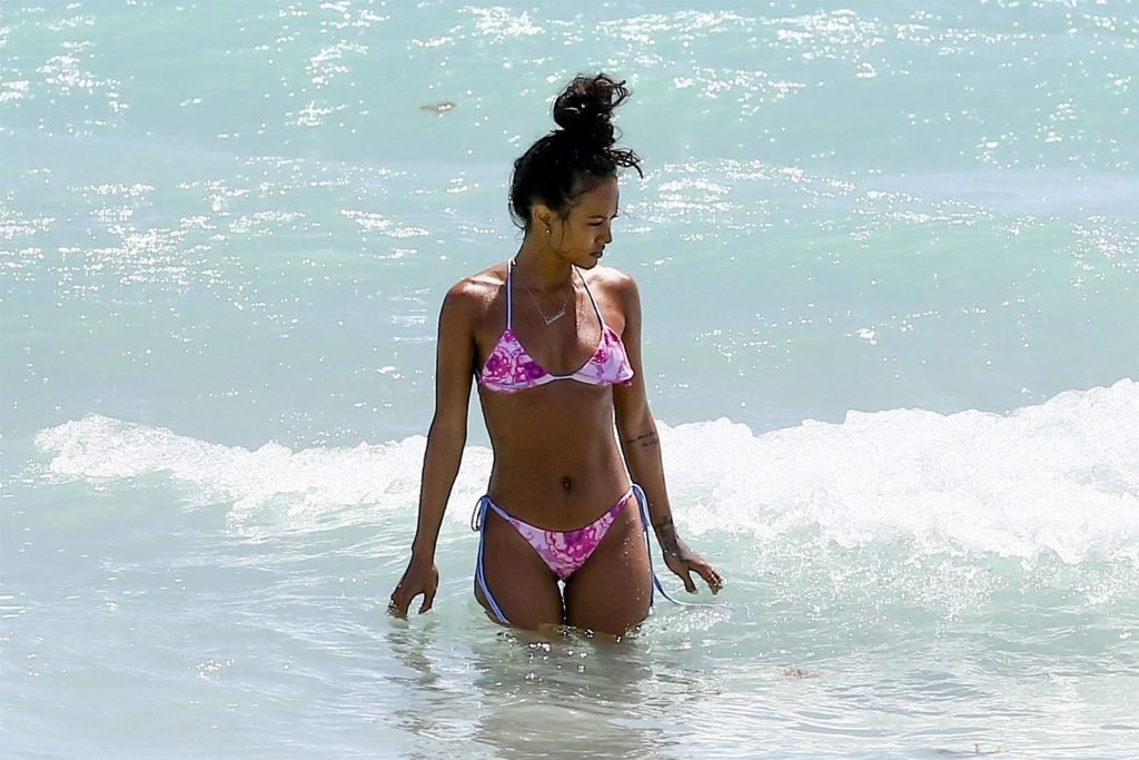 Модель и актриса Каррюч Тран, 29 лет, демонстрирует свою подтянутую фигуру в откровенном розовом бикини, наслаждаясь днем на пляже в Майами вместе со своим бойфрендом, звездой НФЛ Виктором Крузом, 12.04.2018.