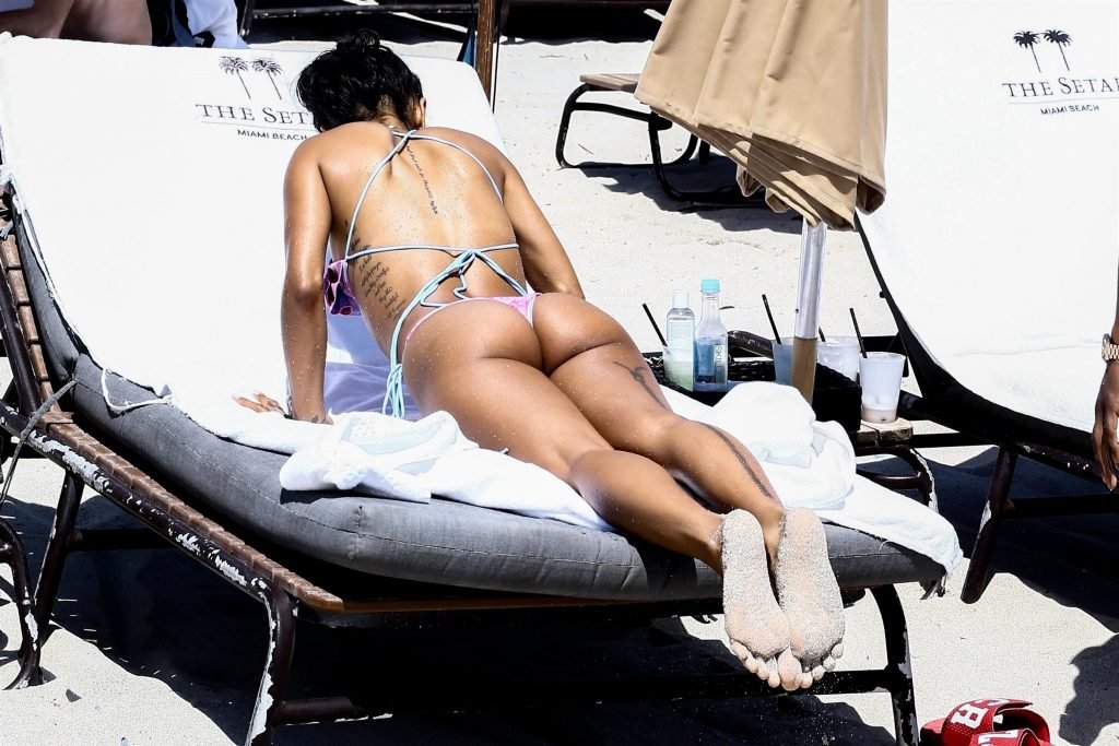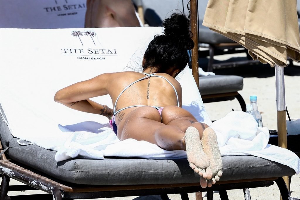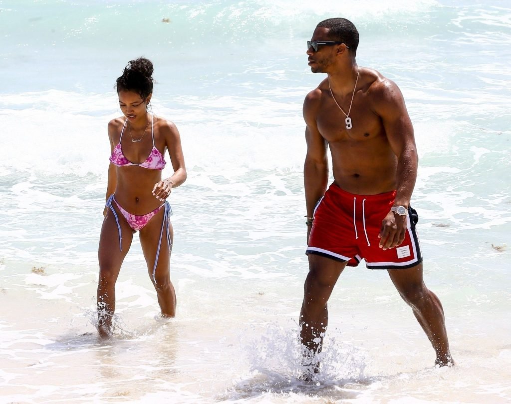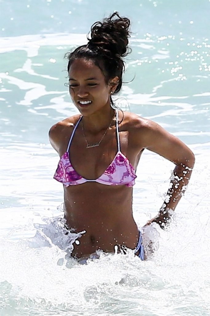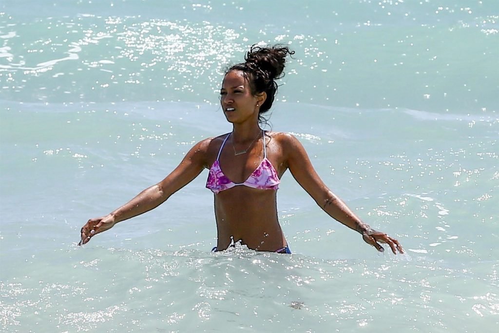 Модель и актриса Каррюч Тран, 29 лет, демонстрирует свою подтянутую фигуру в откровенном розовом бикини, наслаждаясь днем на пляже в Майами вместе со своим бойфрендом, звездой НФЛ Виктором Крузом, 12.04.2018.