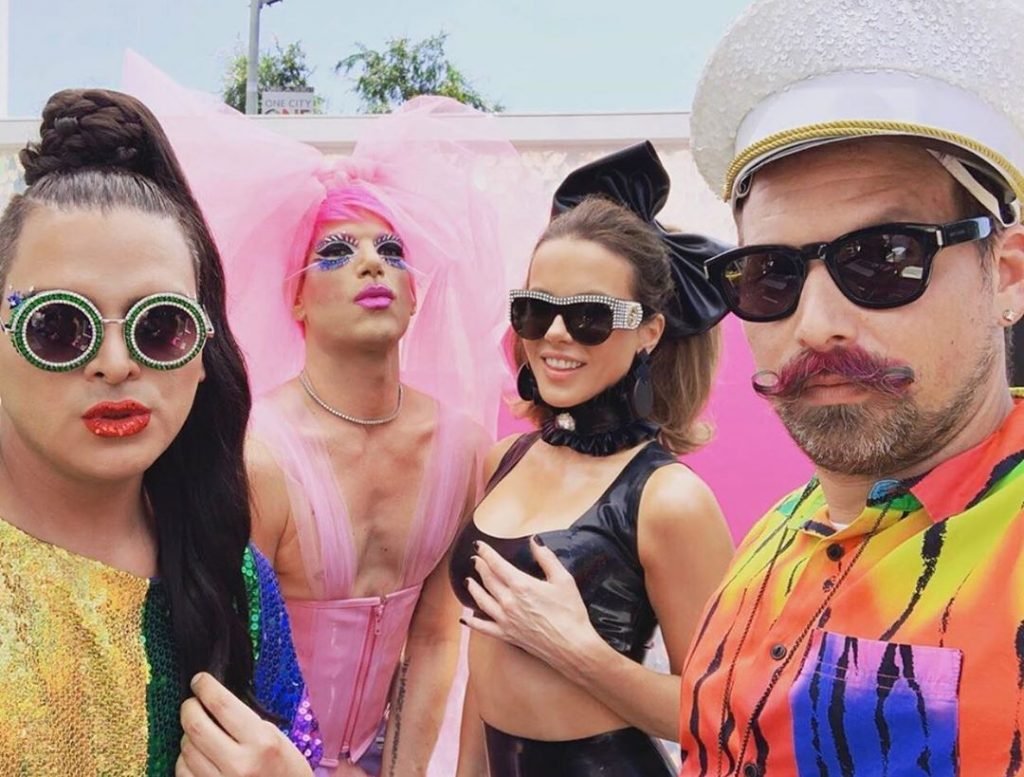 Кейт Бекинсейл была сфотографирована в черном латексном наряде на мероприятии в честь ЛГБТ-прайда в Лос-Анджелесе, 10.06.2019. Кейт вместе с Хайди Клум стала активисткой мероприятия ЛГБТ-сообщества. Она была одета как хозяйка в красивом костюме из черного латекса. Актриса выбрала кроп-топ, а облегающая юбка подчеркивала ее сексуальную фигуру. 45-летняя женщина добавила к своему образу большой бант.