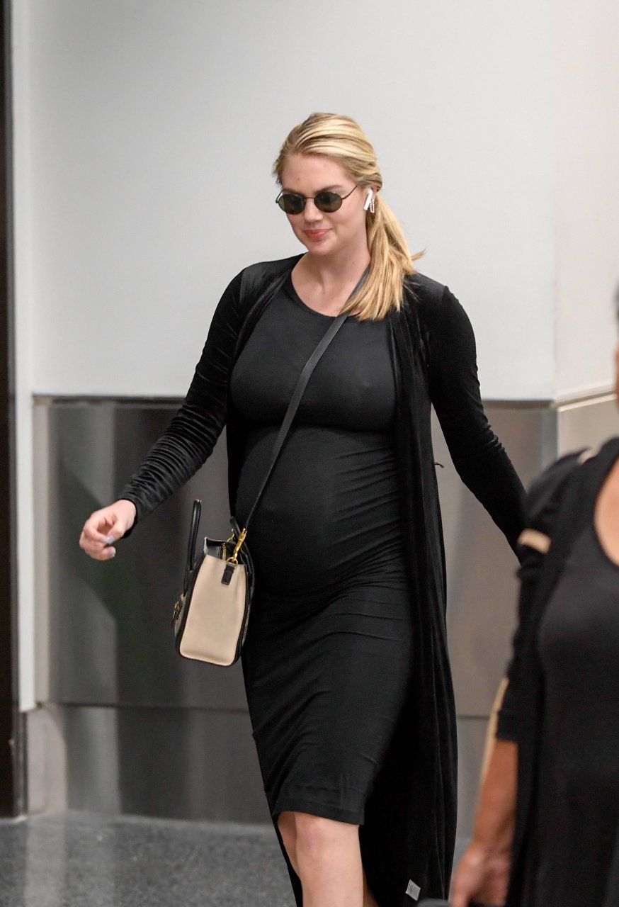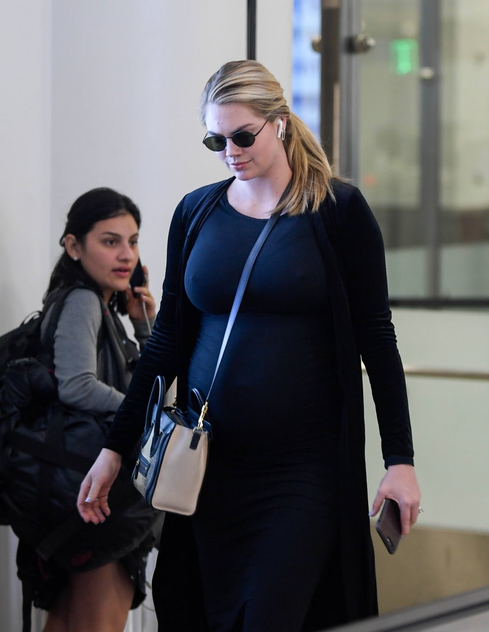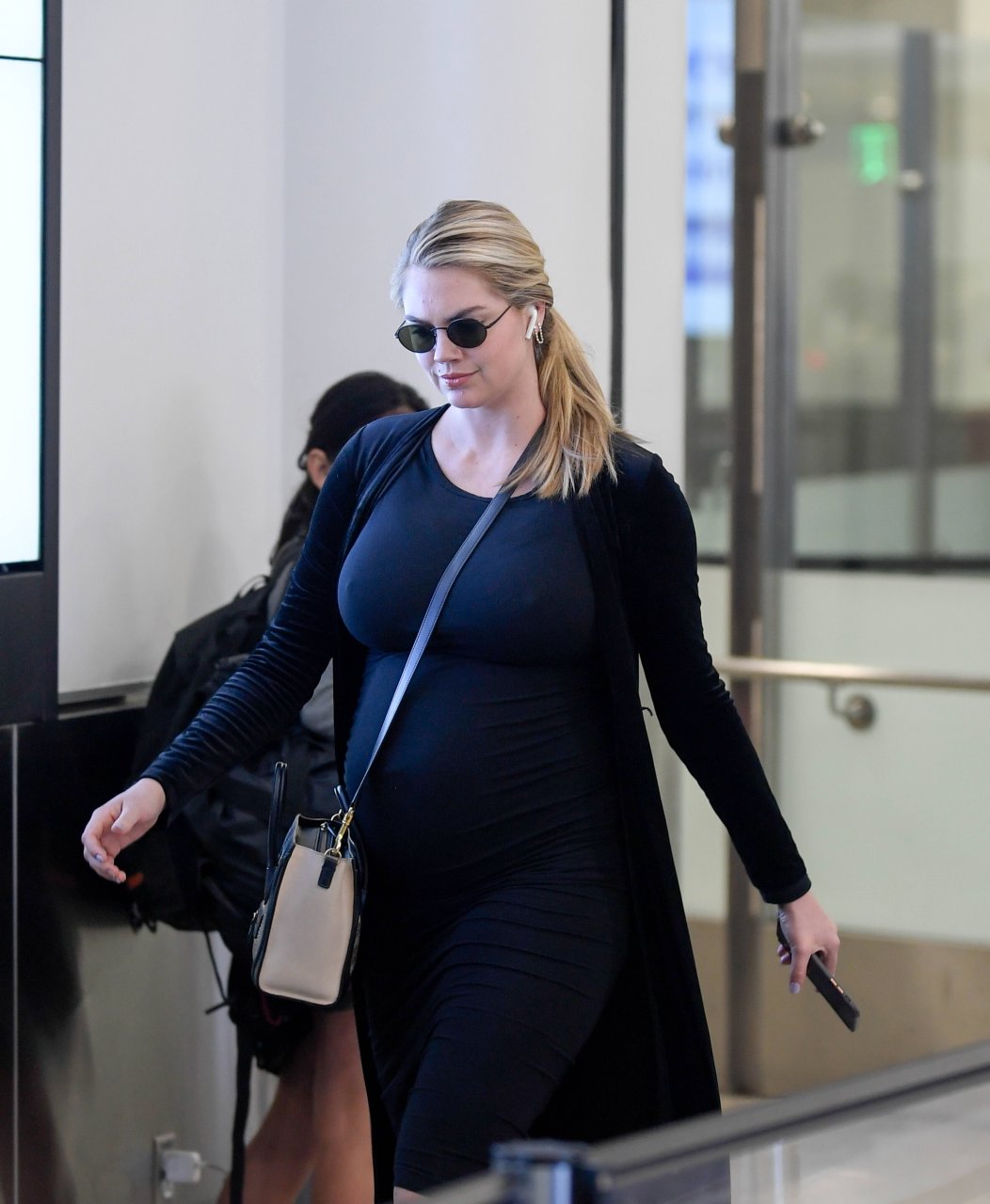 Модель и актриса Кейт Аптон демонстрирует свой животик беременной, прибывая в аэропорт LAX, 27.09.2018. Она готовится стать матерью впервые, как стало известно в середине июля. Аптон объявила об этом своим подписчикам в Instagram, а её муж Джастин Верландер поддержал её в сети, сказав, что она станет хорошей мамой.