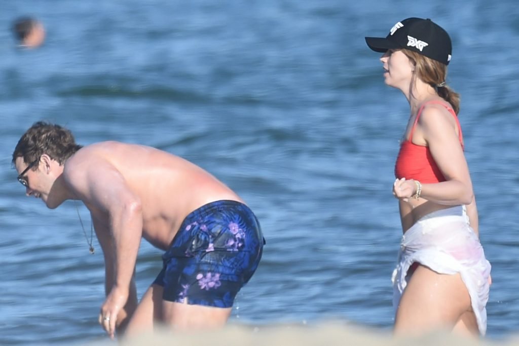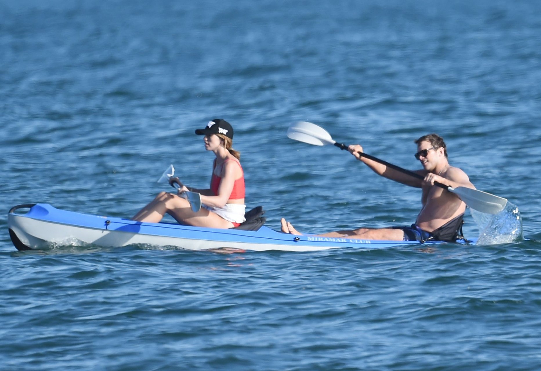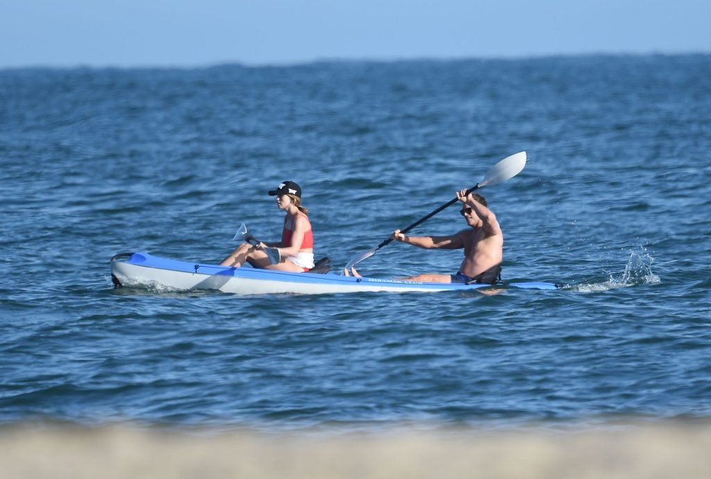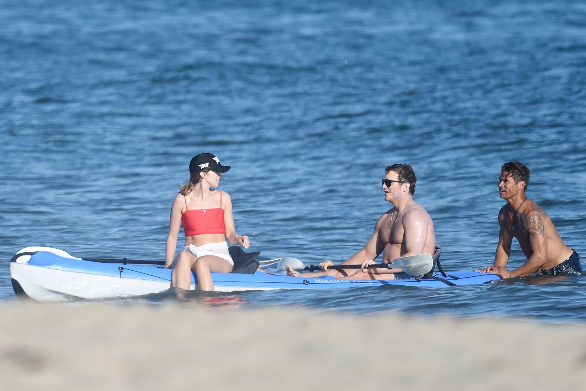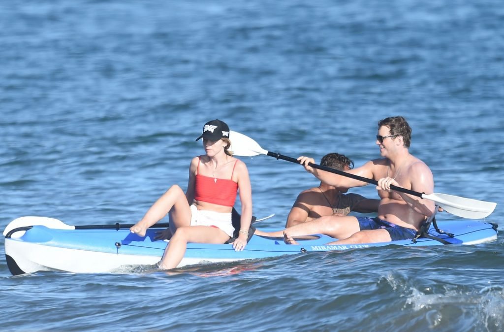 Крис Пратт и Роб Лоу без рубашек, в то время как Кэтрин Шварценеггер надевает красный купальник во время дня морского каякинга и падлбординга на пляже в Санта-Барбаре, 10.08.2019.
