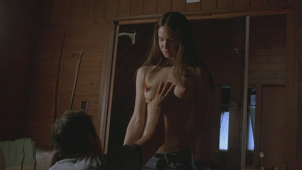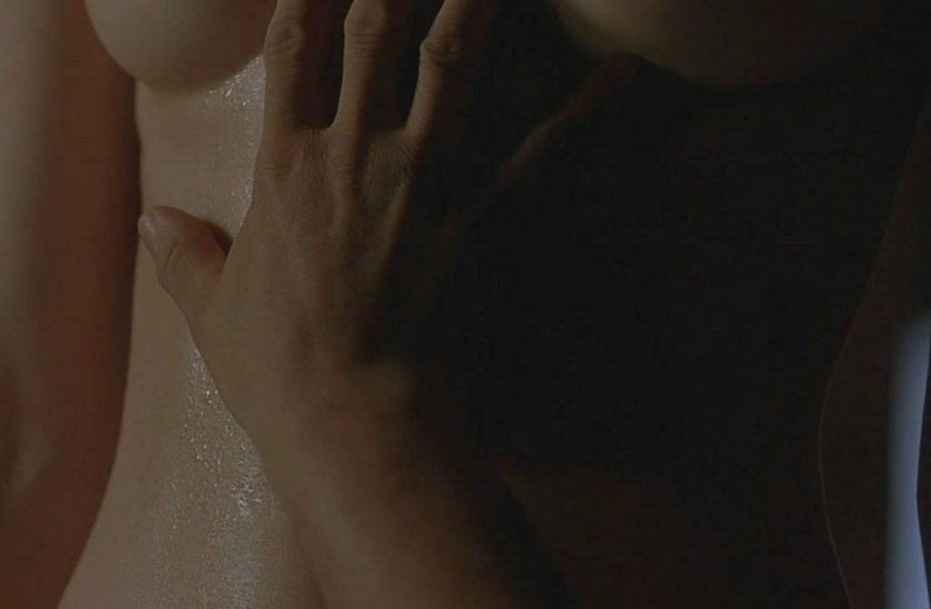 В первой сцене мы видим, как Кэтрин Уотерстон поднимается по лестнице в очень обтягивающей рубашке, которая чётко показывает её выступающие соски. Затем она стоит перед мужчиной и снимает рубашку через голову, открывая свои красивые голые груди.