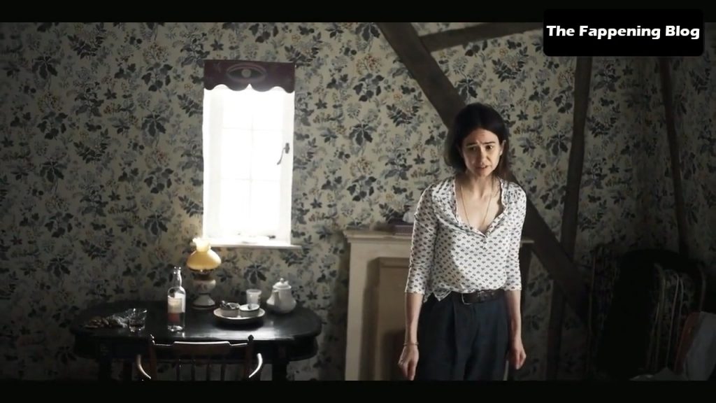Waterston flashes her nice cleavage in this sexy scene.