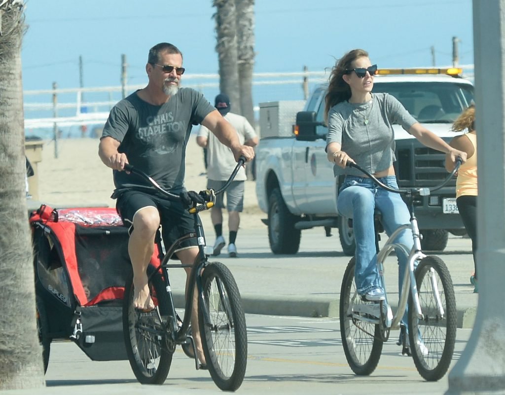 Бролин, 51 год, был без рубашки и в чёрных шортах, везя за собой ребёнка на велосипеде. Бойд, 31 год, была в сером укороченном топе, джинсах и белых кедах Converse.