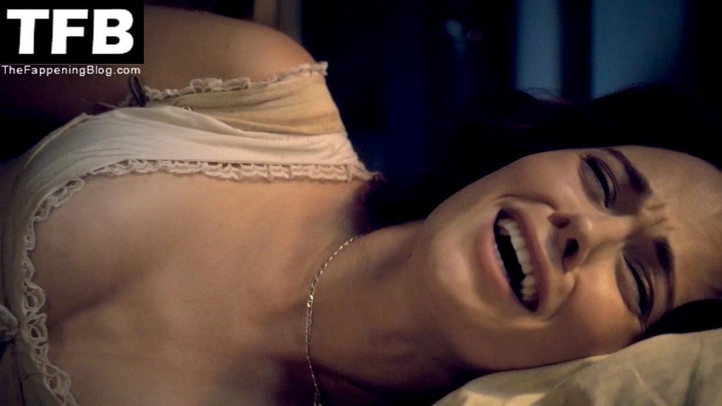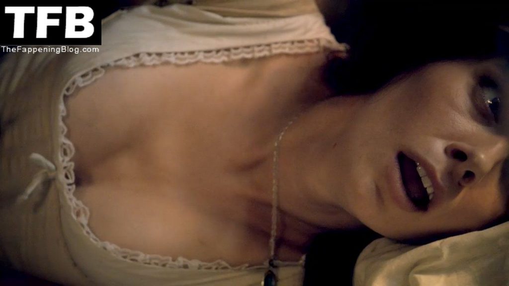 Катиа Винтер, известная по сериалу “Декстер“, спит на боку в белом топе с глубоким вырезом, который показывает декольте, пока паук ползет ей в рот, и она просыпается в панике.