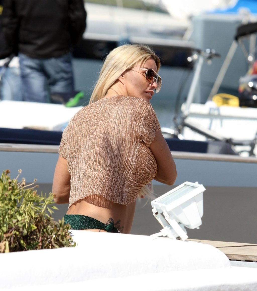 Кэти продемонстрировала свою фантастическую фигуру, надев коричневый топ с завязками и зелёные бикини с завязками по бокам, а также платформы, и выглядела стильно в своих золотисто-тёмных солнцезащитных очках.