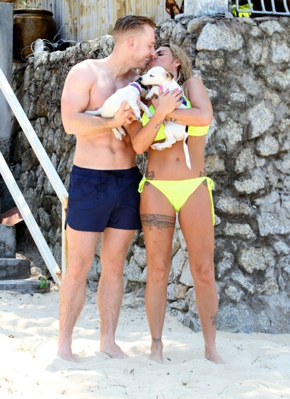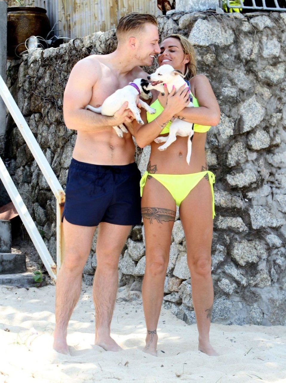 Любовь витала в воздухе: объятия и поцелуи повсюду, пара крепко держала своих милых собак, наслаждаясь быстрым, интимным моментом на пляже. Кэти выглядела великолепно в сексуальном желтом бикини, а Крис демонстрировал свое подтянутое тело в палящую жару Таиланда.