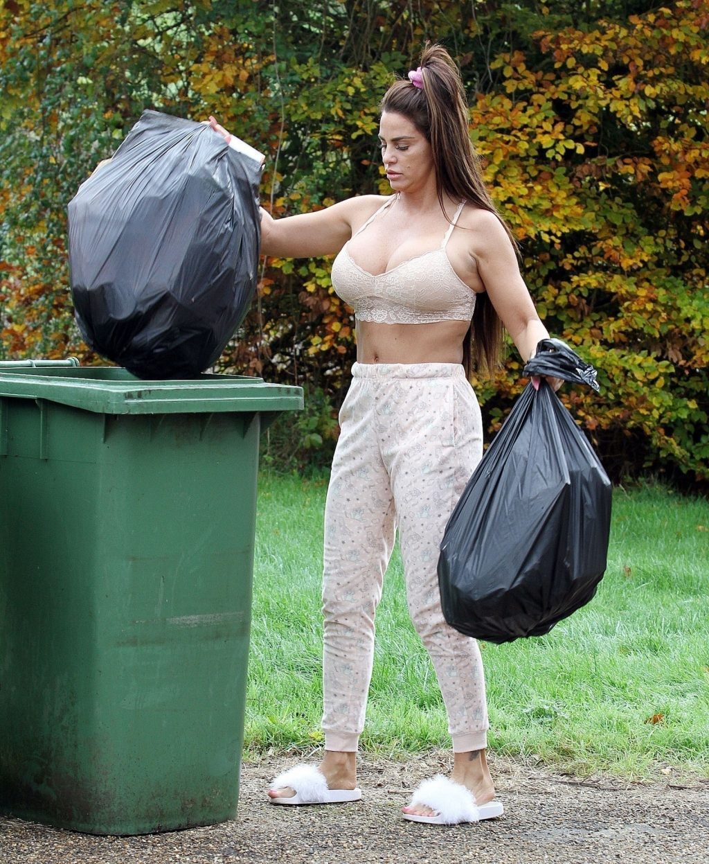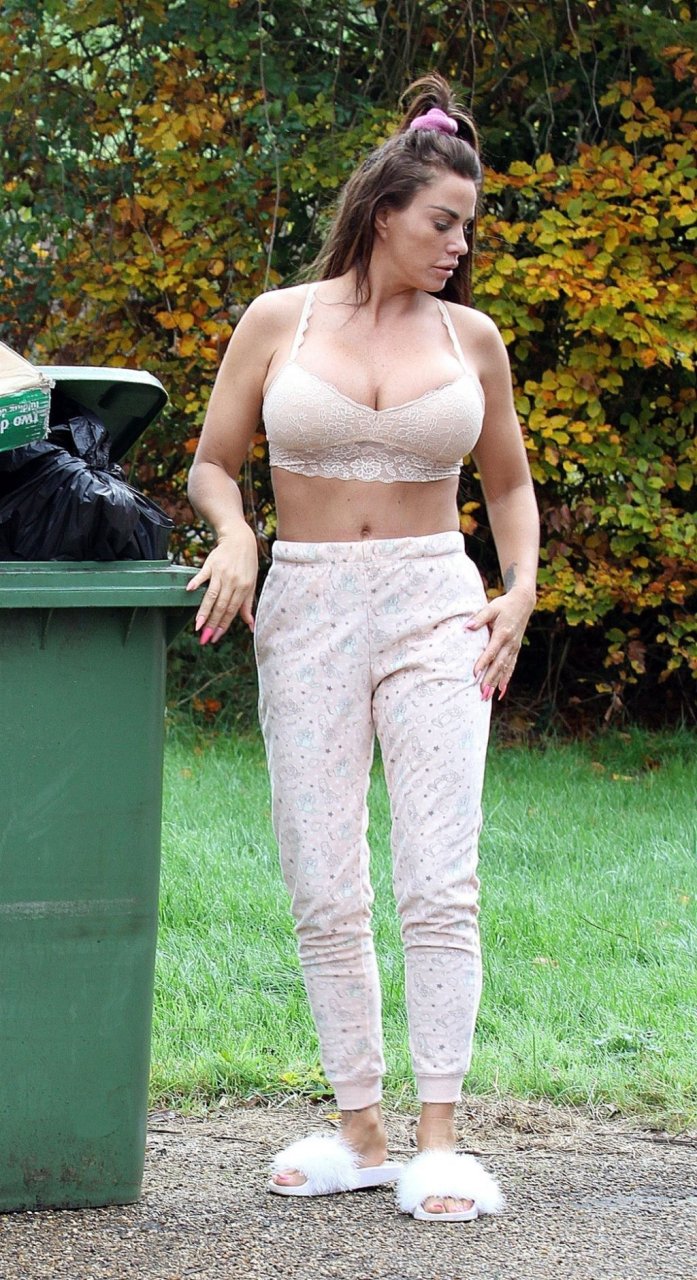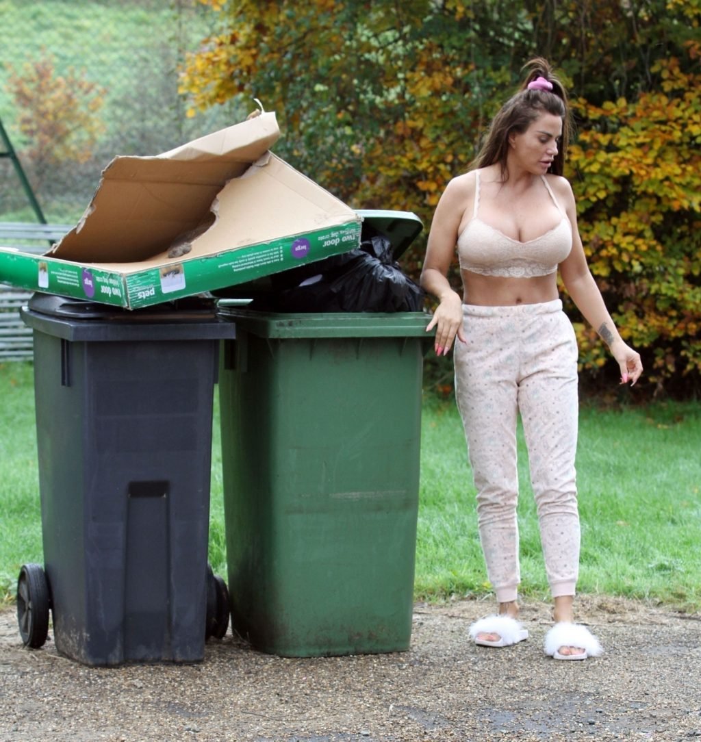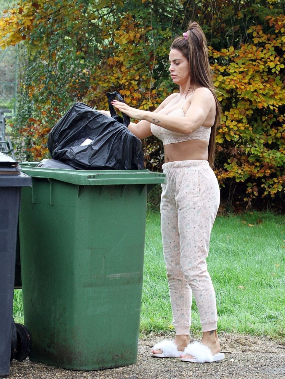 Бывшая гламурная модель Кэти Прайс (Джордан) замечена, когда выносит мусор, стоя рядом с пословицей: “Если хочешь что-то сделать, сделай это сам.” Кэти без макияжа выглядит немного серьезной в своих домашних спортивных штанах и бюстгальтере, демонстрируя выпирающее декольте – Лондон, 11/11/2018. Все это происходит в то время, когда модель переживает некоторые текущие финансовые трудности.