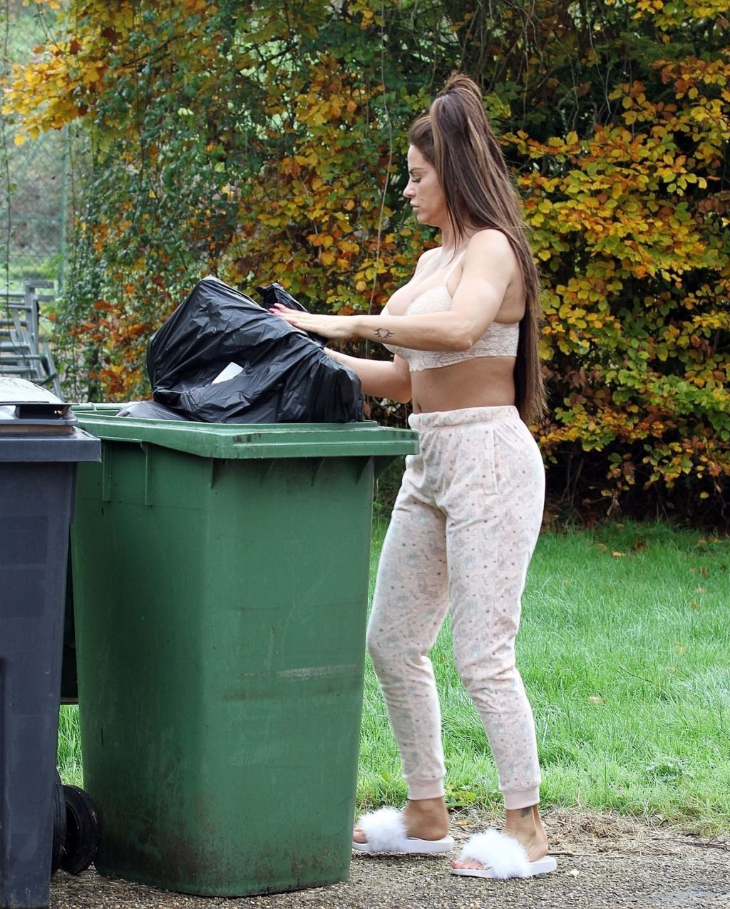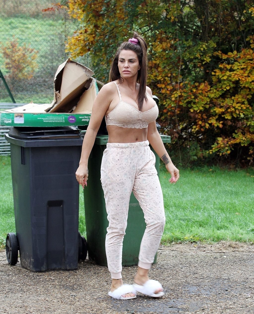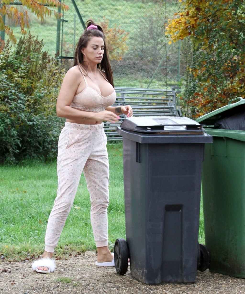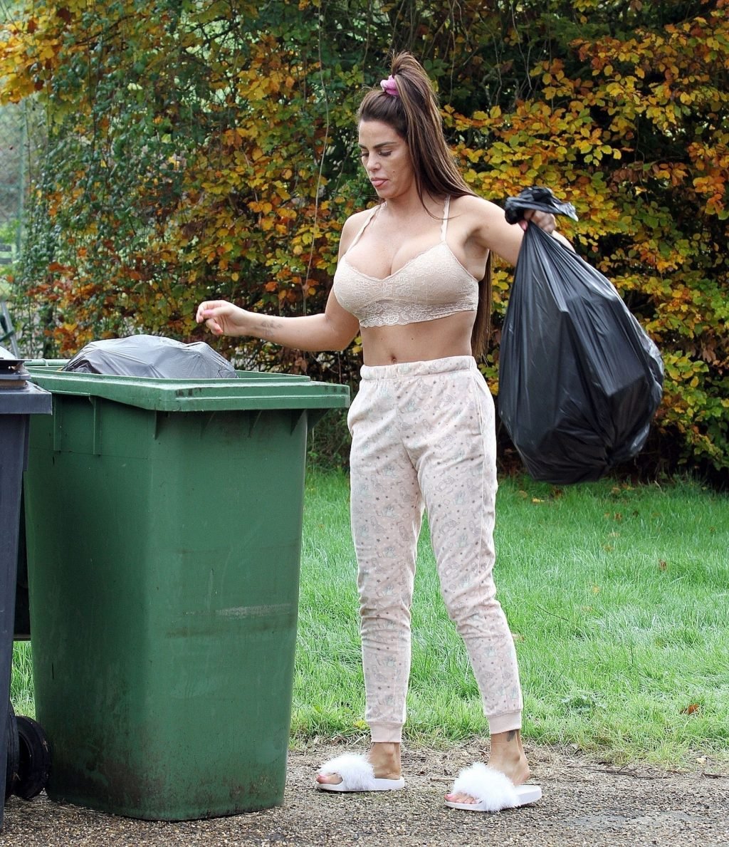 Бывшая гламурная модель Кэти Прайс (Джордан) замечена, когда выносит мусор, стоя рядом с пословицей: “Если хочешь что-то сделать, сделай это сам.” Кэти без макияжа выглядит немного серьезной в своих домашних спортивных штанах и бюстгальтере, демонстрируя выпирающее декольте – Лондон, 11/11/2018. Все это происходит в то время, когда модель переживает некоторые текущие финансовые трудности.