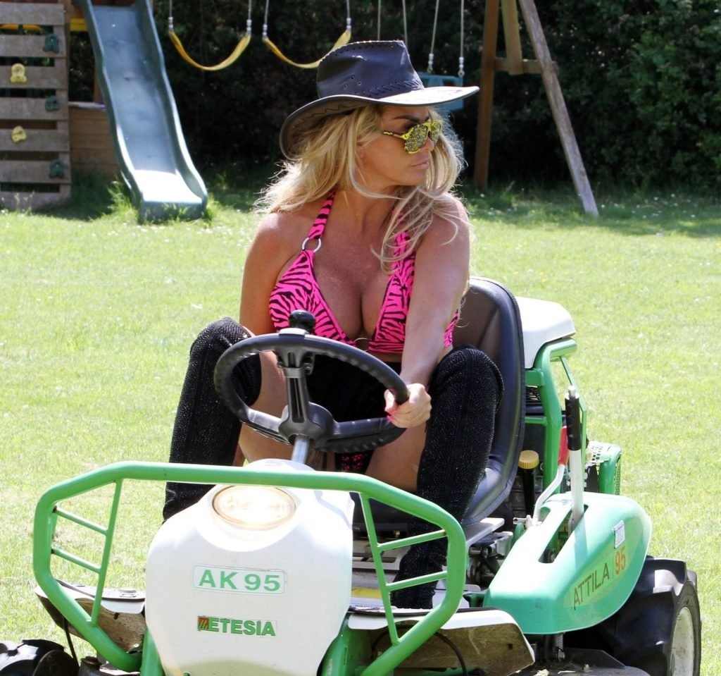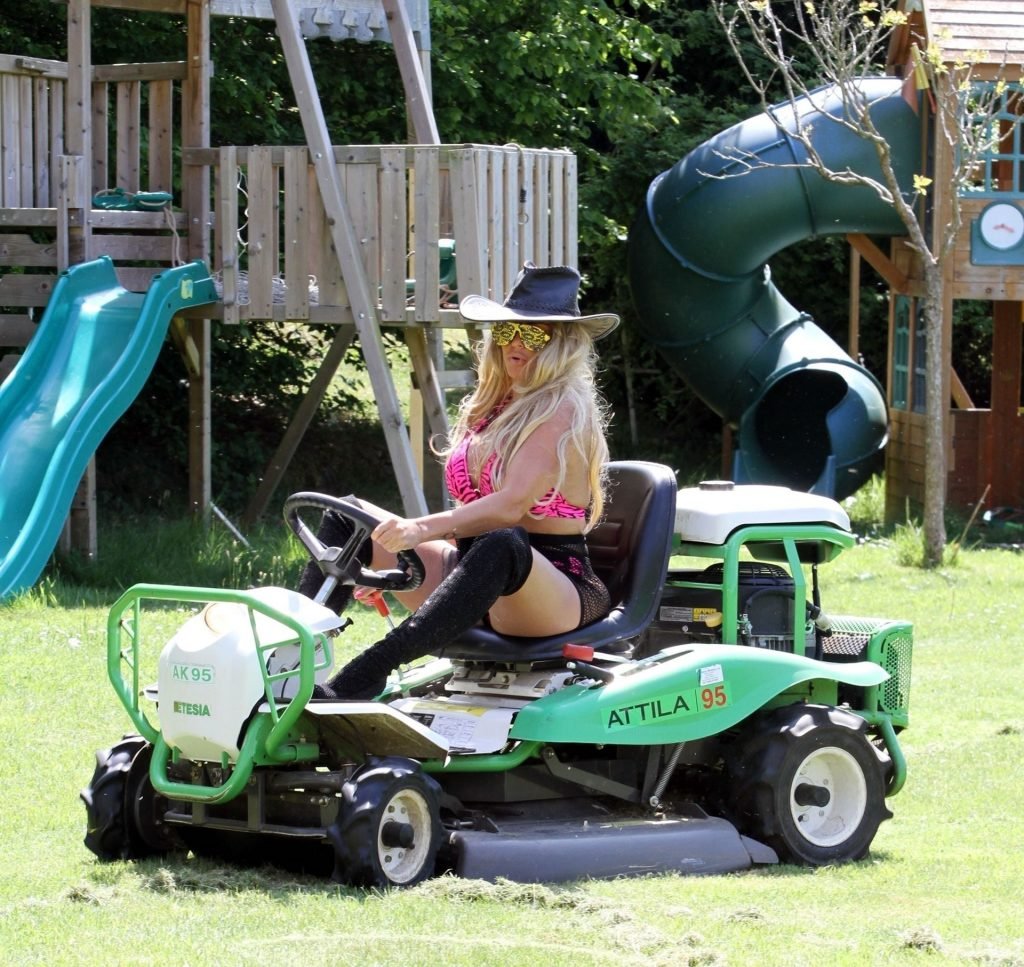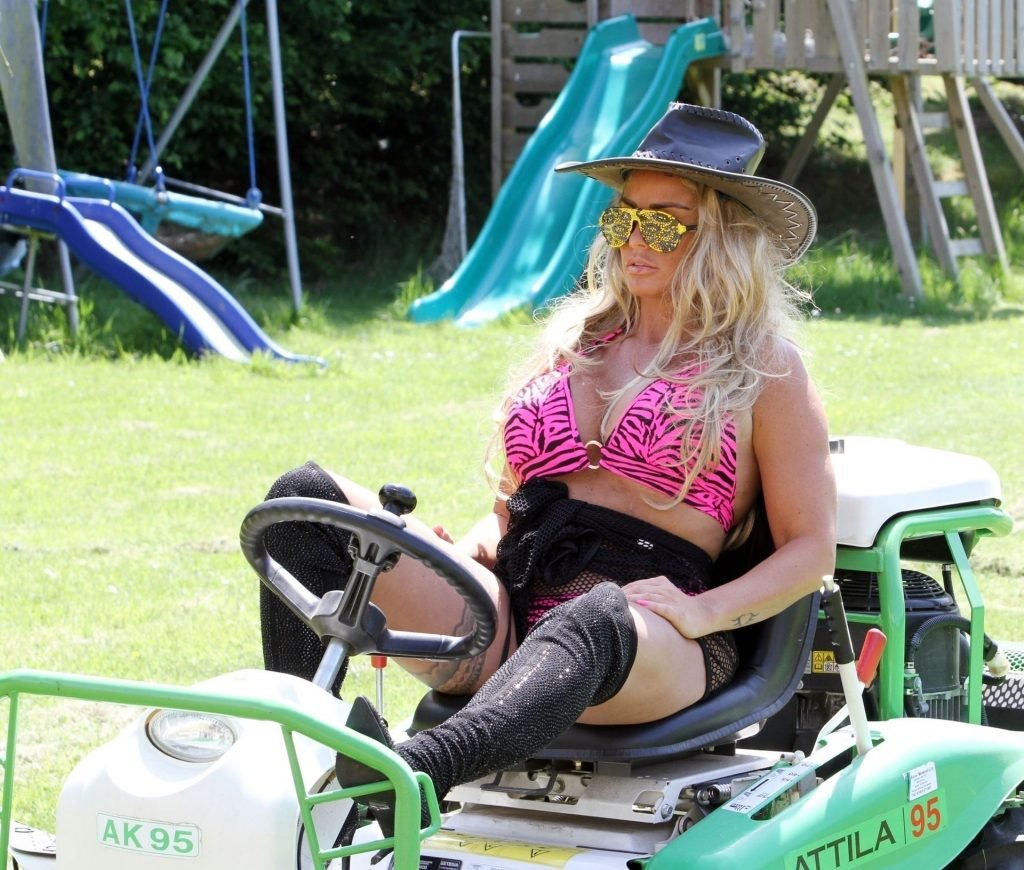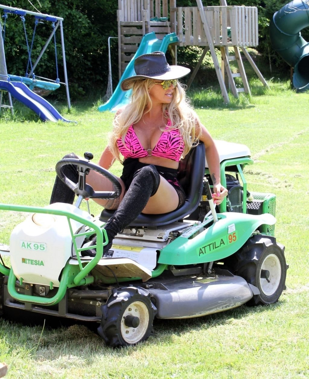 Кэти Прайс (Джордан) была сфотографирована, когда косила газон в Лондоне 24.05.2019, одетая в бикини с животным принтом, ботфорты и ковбойскую шляпу.