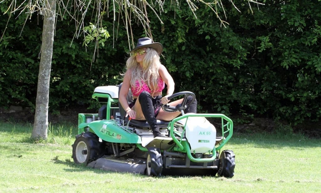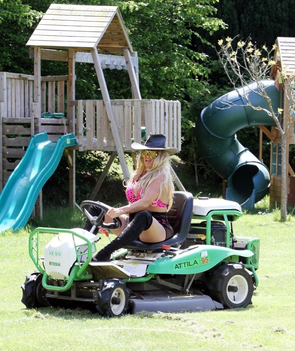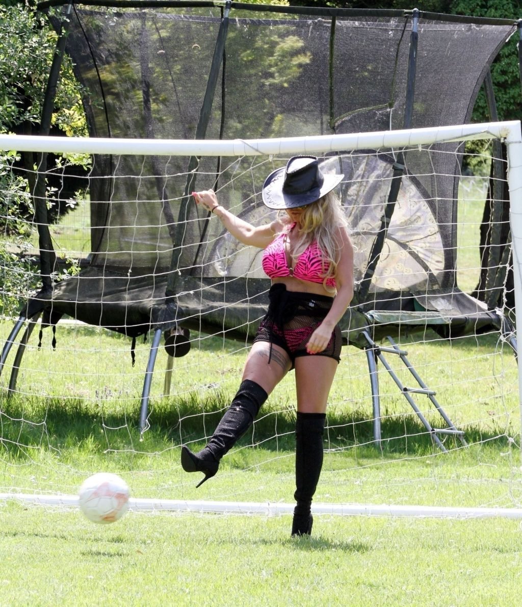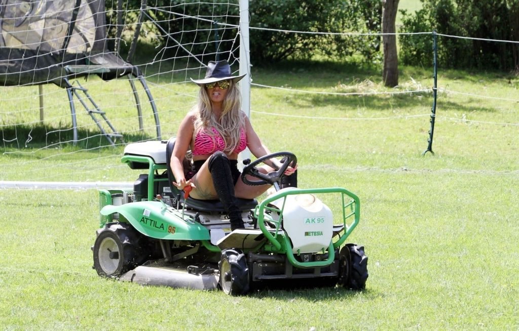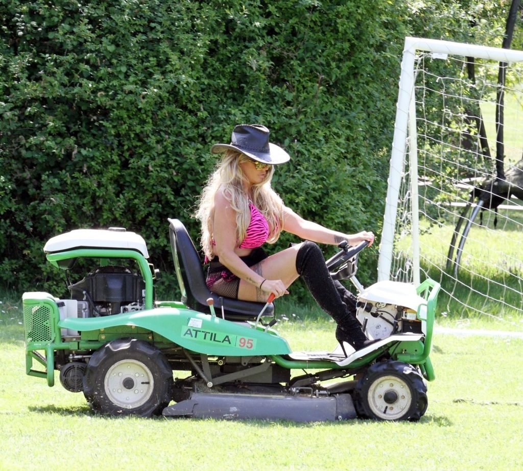 Кэти Прайс (Джордан) была сфотографирована, когда косила газон в Лондоне 24.05.2019, одетая в бикини с животным принтом, ботфорты и ковбойскую шляпу.