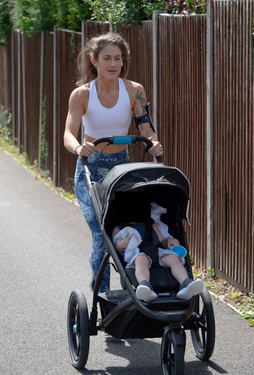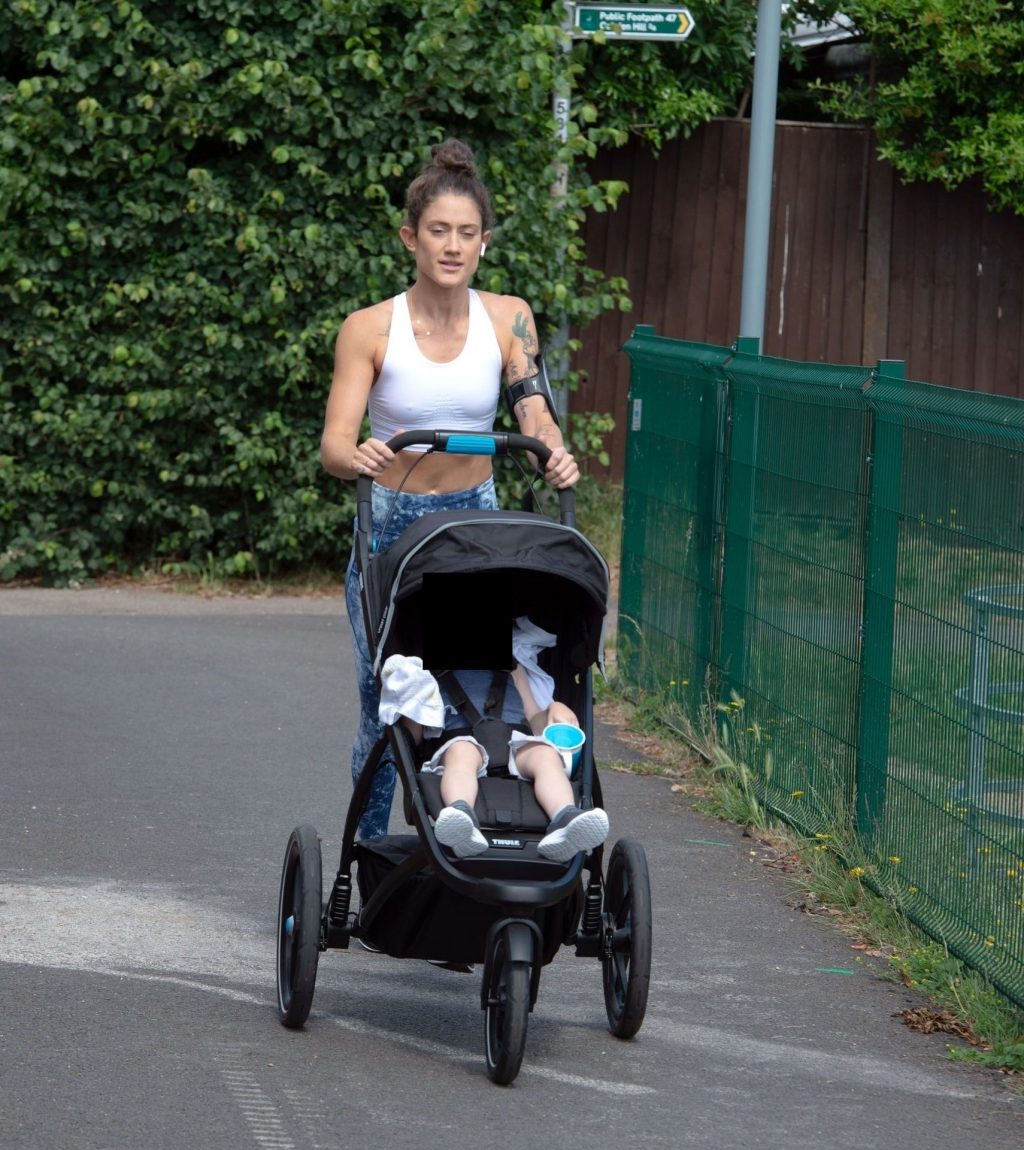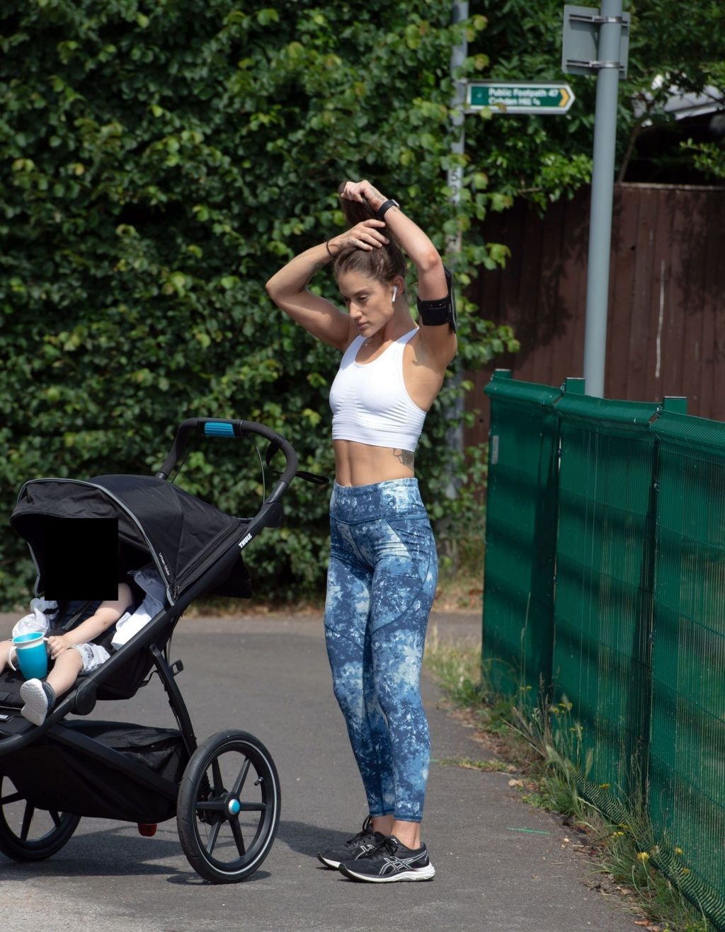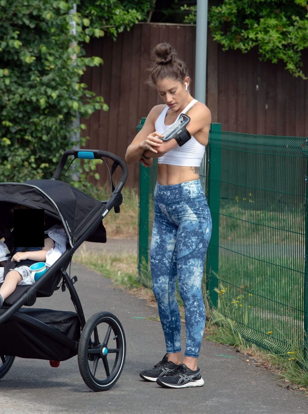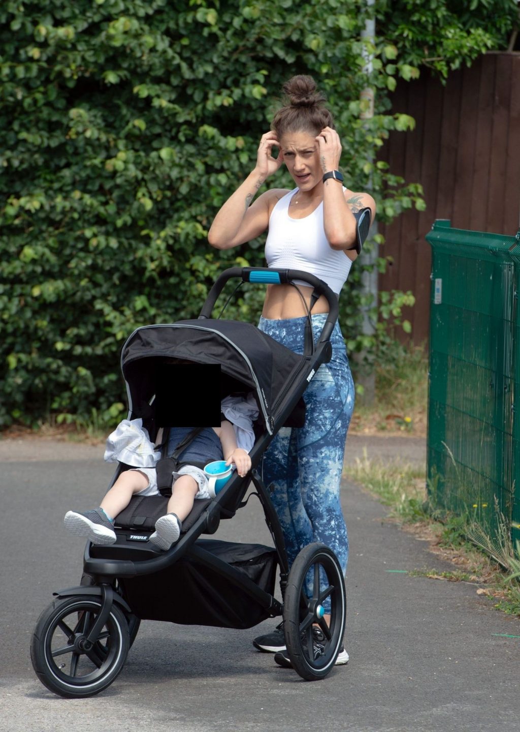 “Звезда “X-Factor” Кэти Уайсел демонстрирует свою мускулистую фигуру, прогуливаясь с сыном Хадсоном по Северному Лондону, 16.06.2020. Одинокая мама показывает свои потрясающие мышцы пресса в синих спортивных штанах и белом топе, когда ее замечают неподалеку от дома.