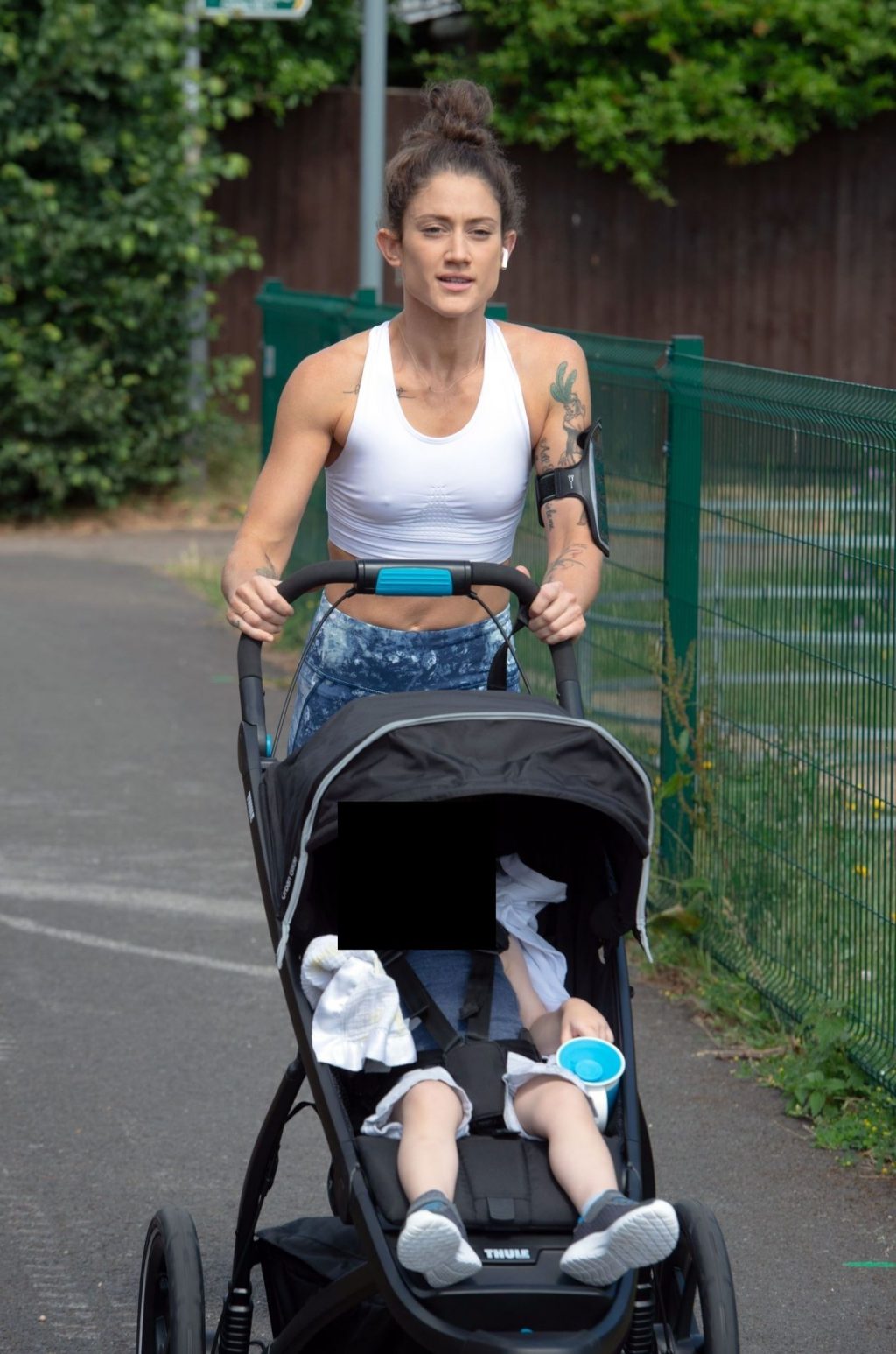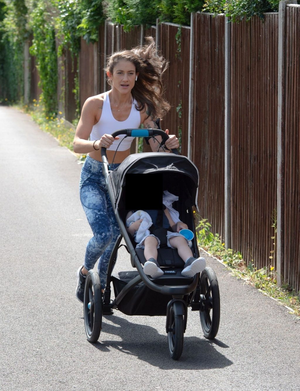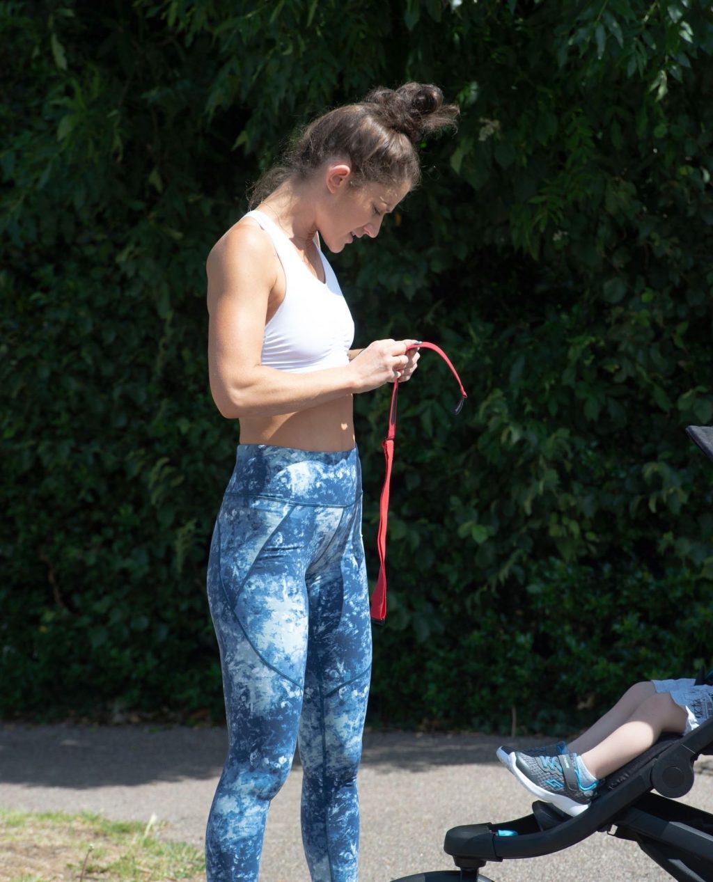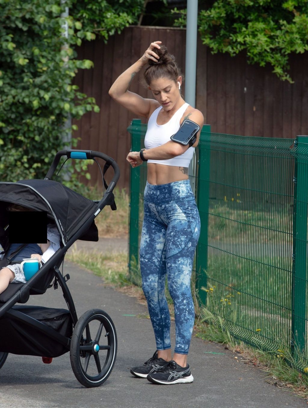 “Звезда “X-Factor” Кэти Уайсел демонстрирует свою мускулистую фигуру, прогуливаясь с сыном Хадсоном по Северному Лондону, 16.06.2020. Одинокая мама показывает свои потрясающие мышцы пресса в синих спортивных штанах и белом топе, когда ее замечают неподалеку от дома.