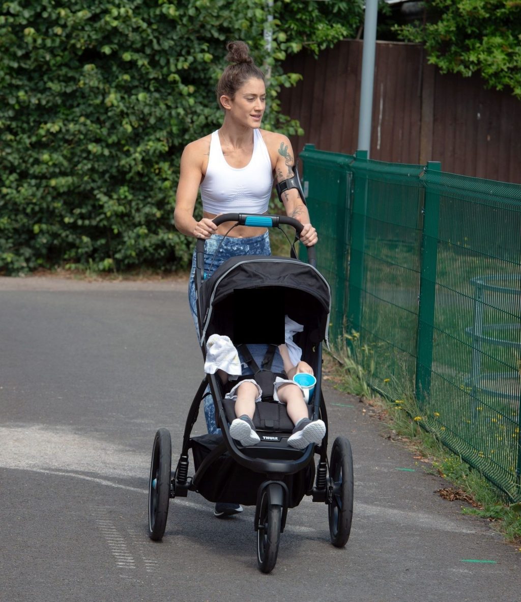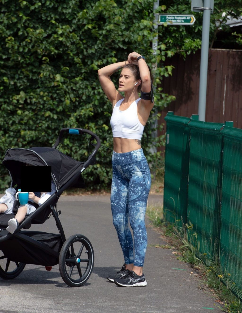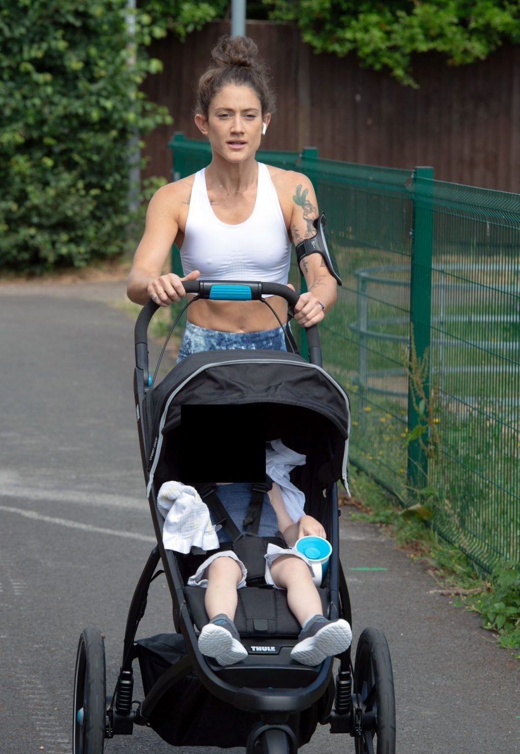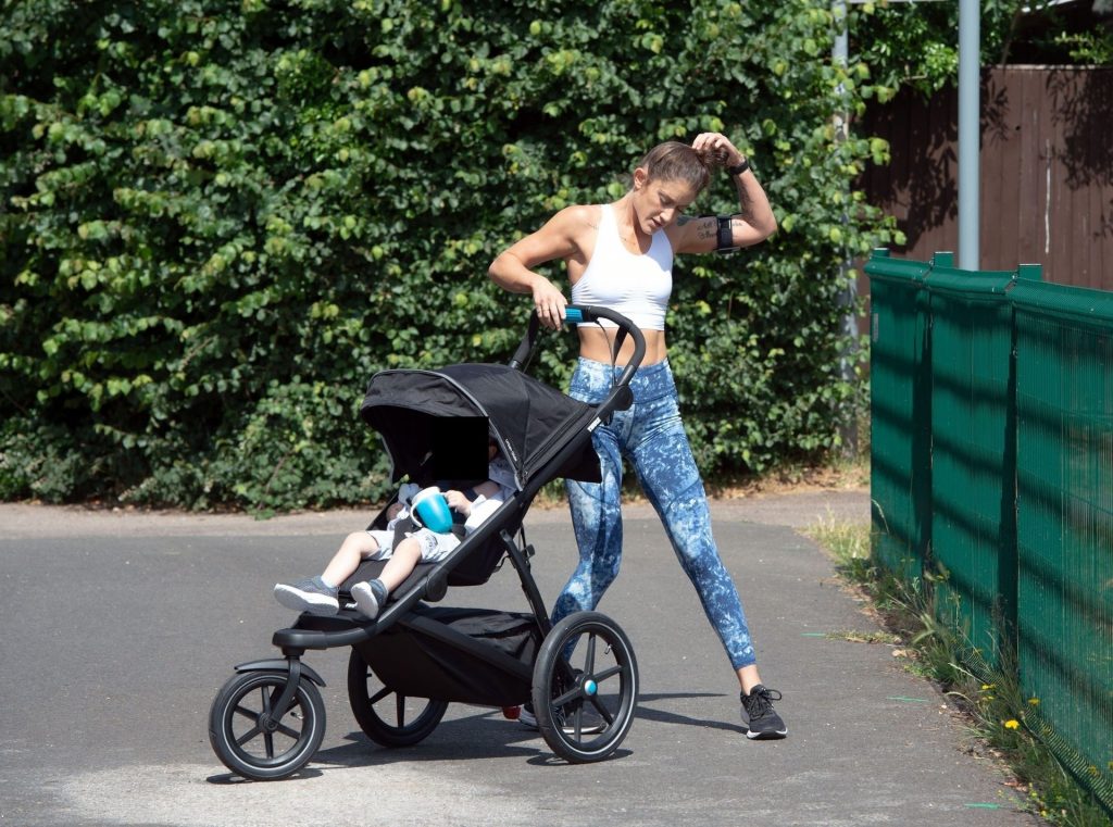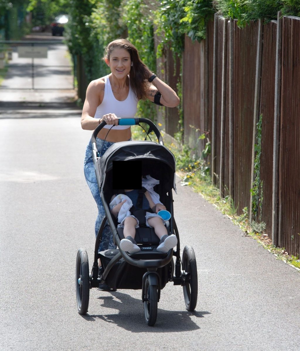 “Звезда “X-Factor” Кэти Уайсел демонстрирует свою мускулистую фигуру, прогуливаясь с сыном Хадсоном по Северному Лондону, 16.06.2020. Одинокая мама показывает свои потрясающие мышцы пресса в синих спортивных штанах и белом топе, когда ее замечают неподалеку от дома.