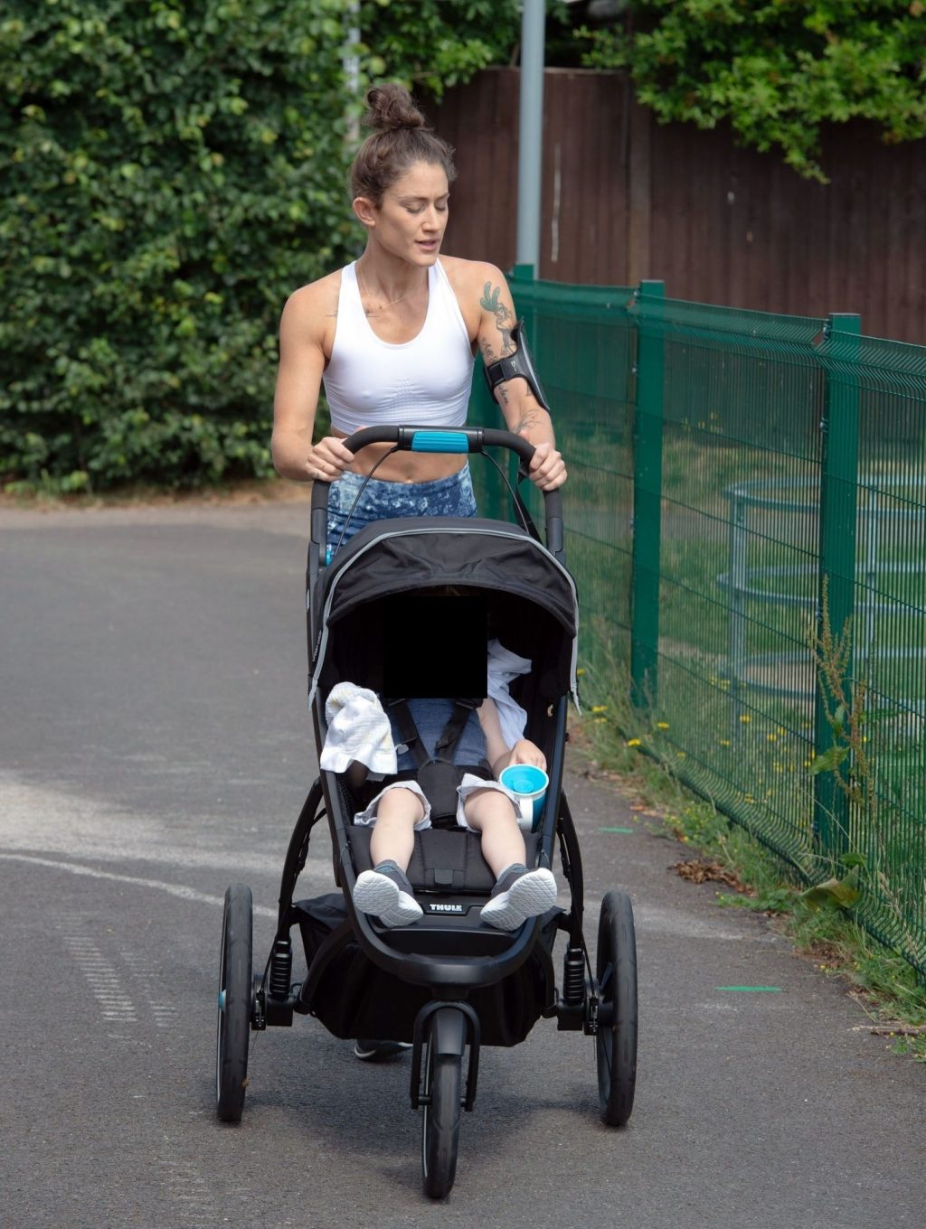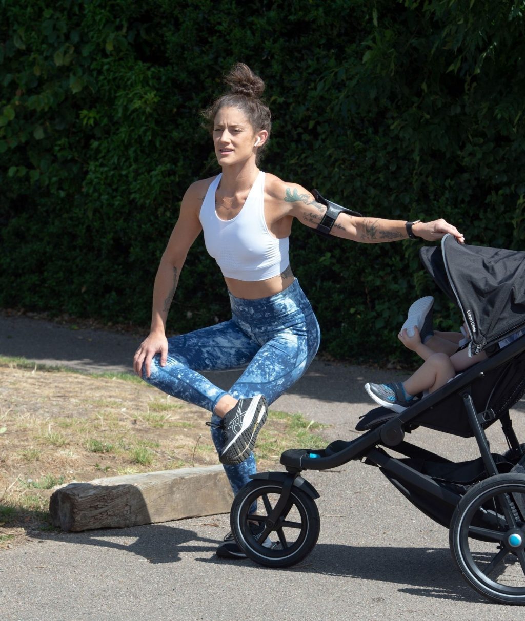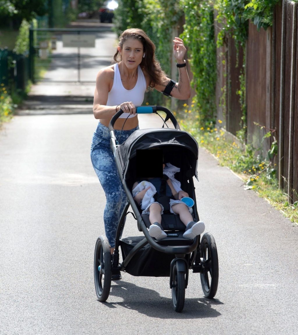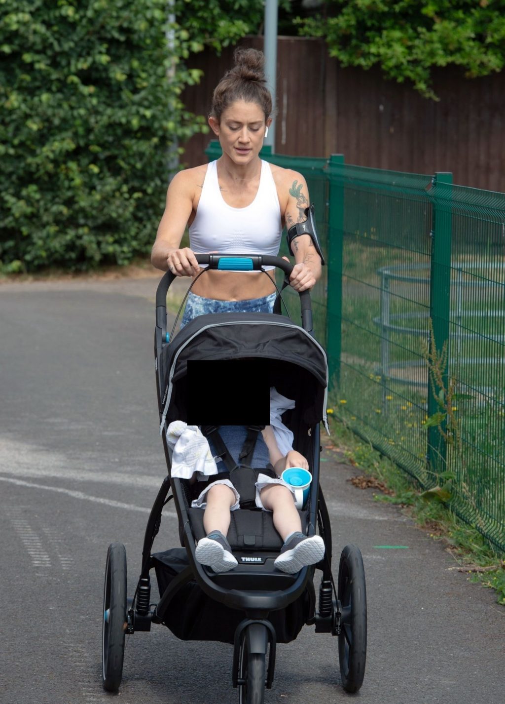 “Звезда “X-Factor” Кэти Уайсел демонстрирует свою мускулистую фигуру, прогуливаясь с сыном Хадсоном по Северному Лондону, 16.06.2020. Одинокая мама показывает свои потрясающие мышцы пресса в синих спортивных штанах и белом топе, когда ее замечают неподалеку от дома.