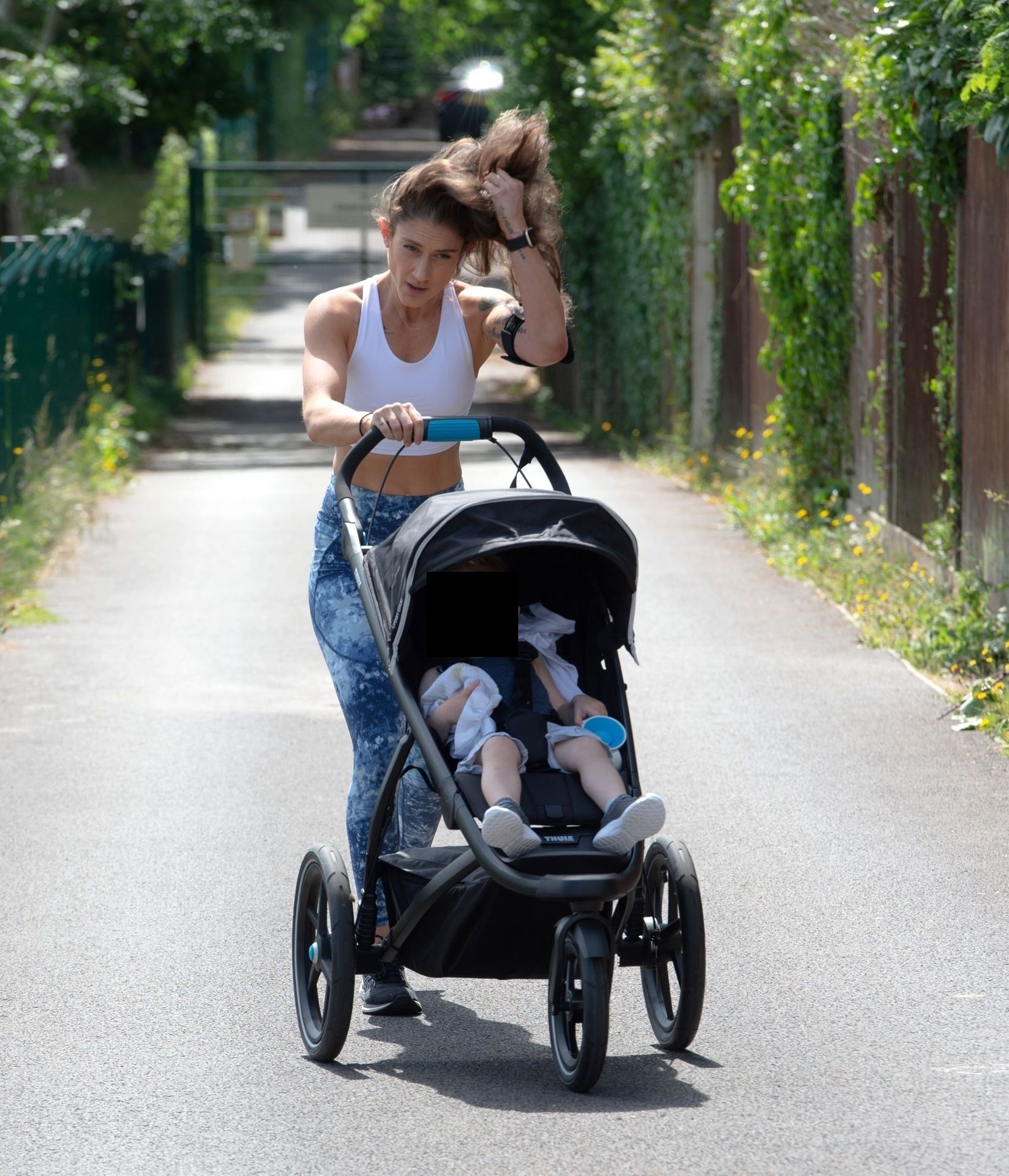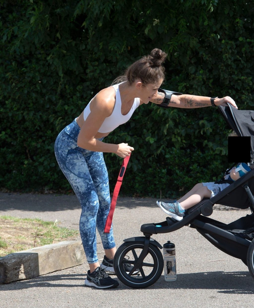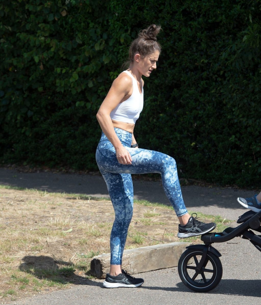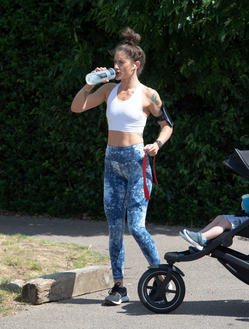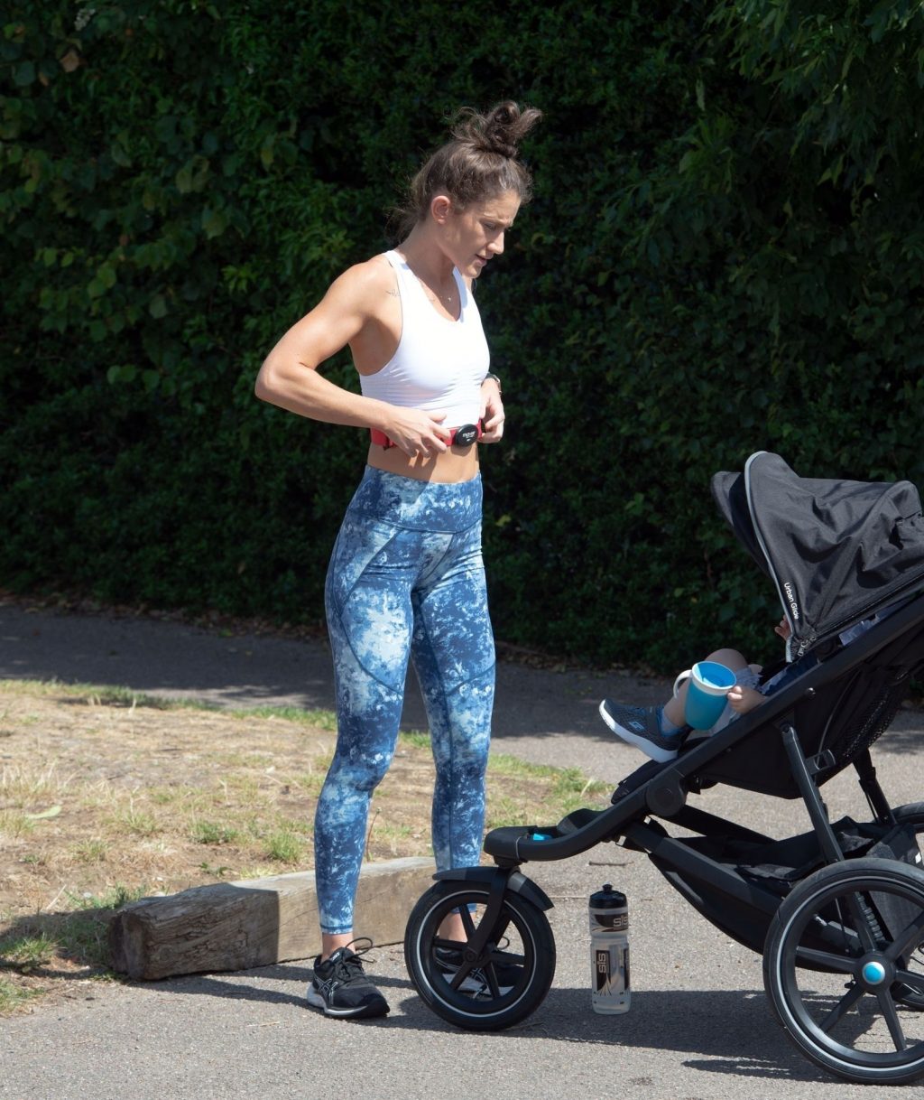 “Звезда “X-Factor” Кэти Уайсел демонстрирует свою мускулистую фигуру, прогуливаясь с сыном Хадсоном по Северному Лондону, 16.06.2020. Одинокая мама показывает свои потрясающие мышцы пресса в синих спортивных штанах и белом топе, когда ее замечают неподалеку от дома.