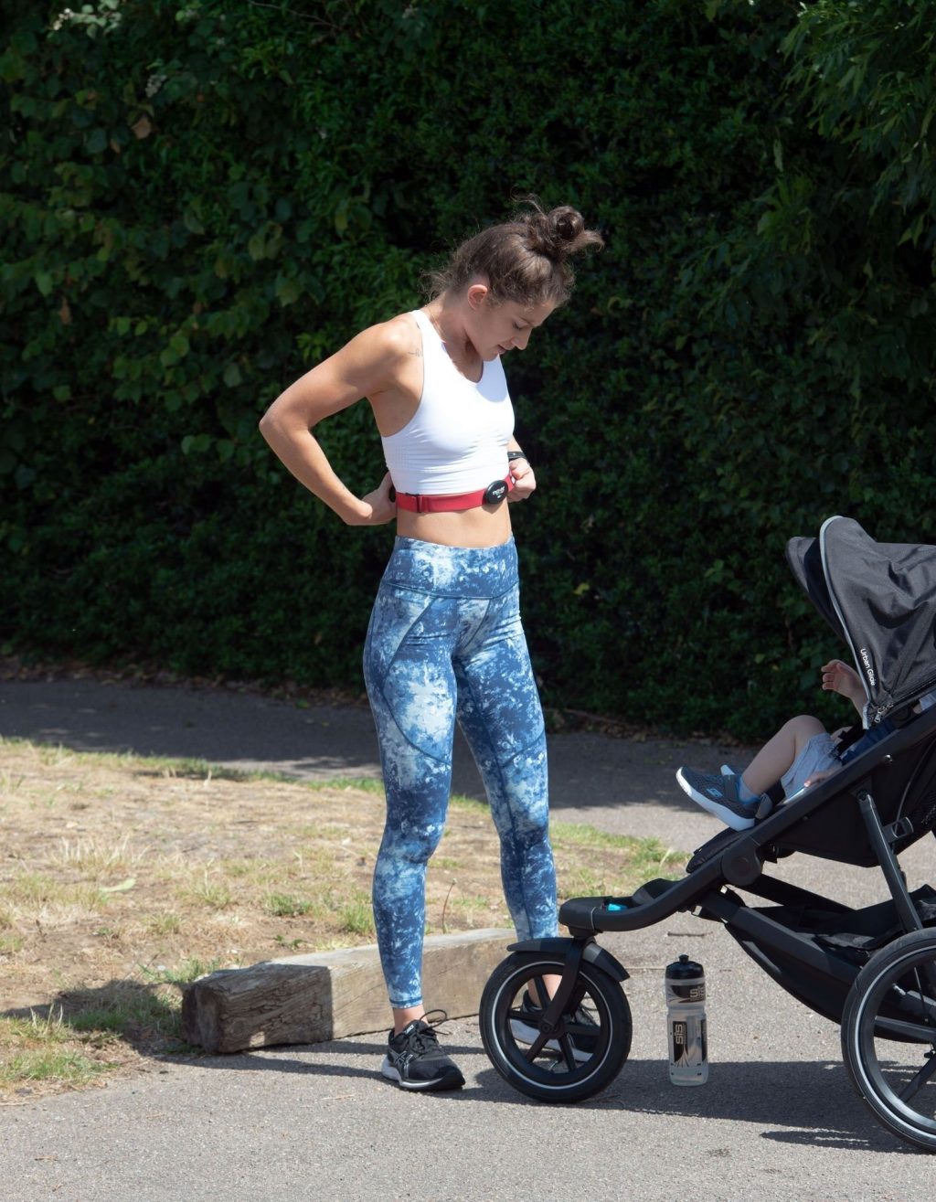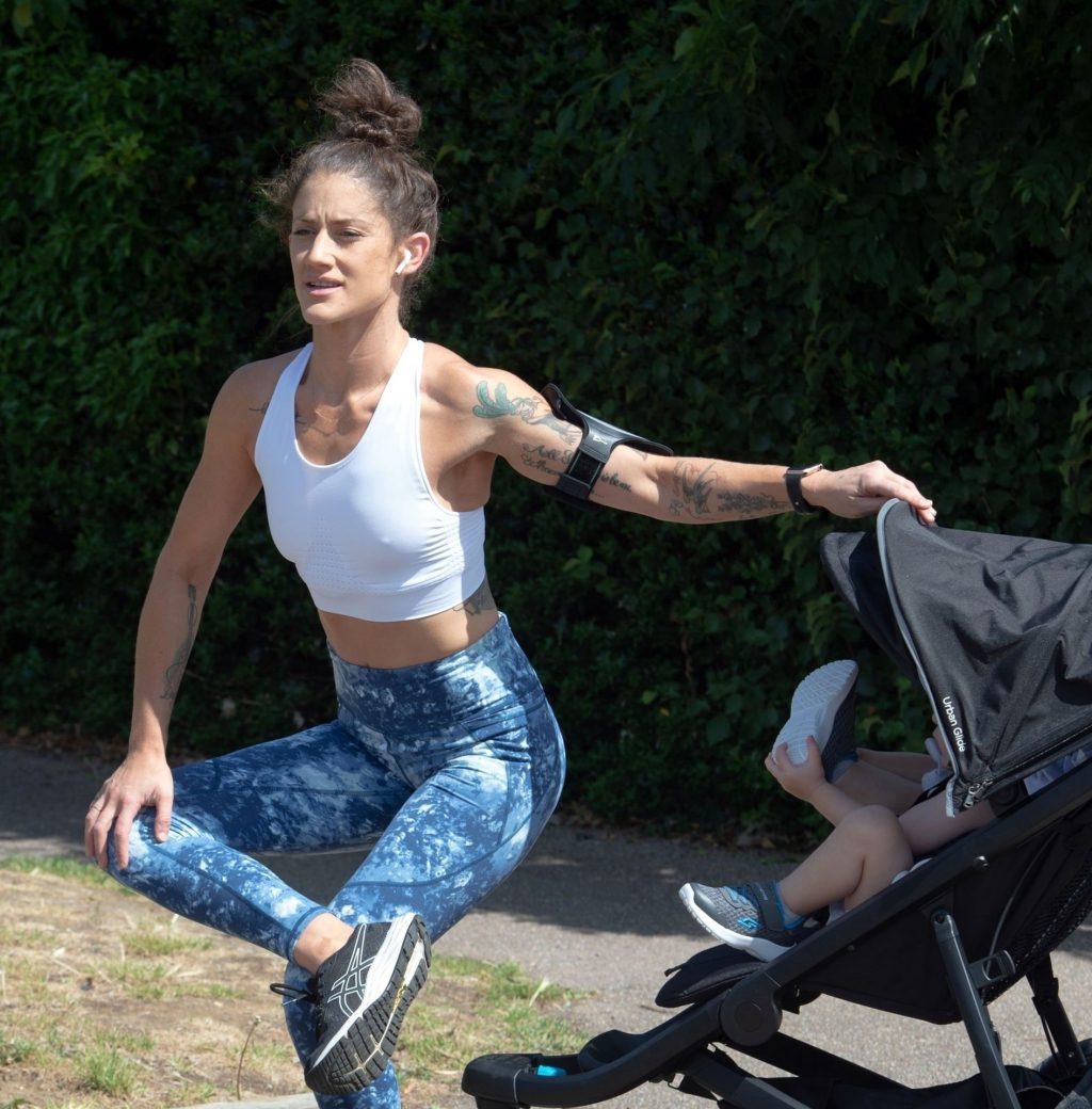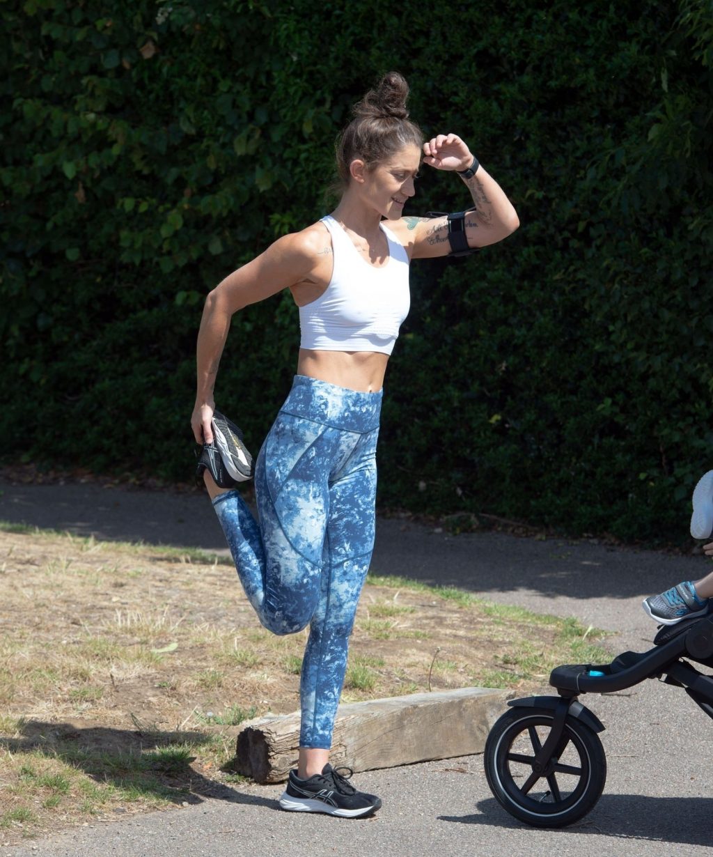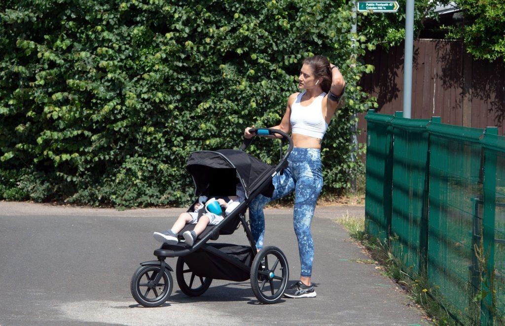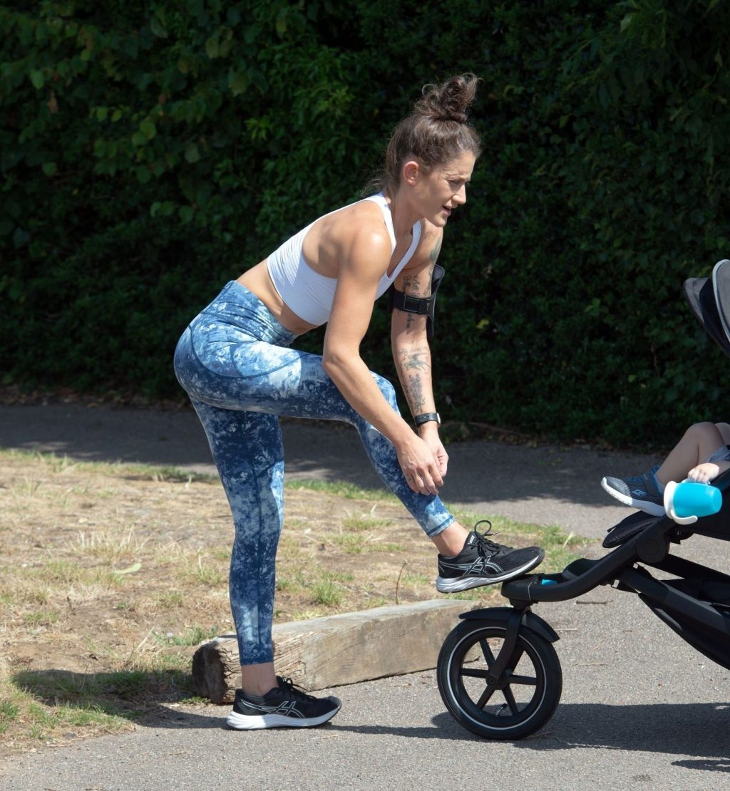 “Звезда “X-Factor” Кэти Уайсел демонстрирует свою мускулистую фигуру, прогуливаясь с сыном Хадсоном по Северному Лондону, 16.06.2020. Одинокая мама показывает свои потрясающие мышцы пресса в синих спортивных штанах и белом топе, когда ее замечают неподалеку от дома.