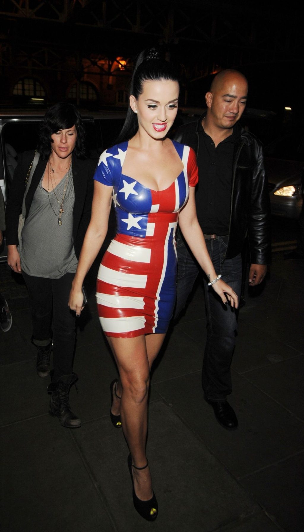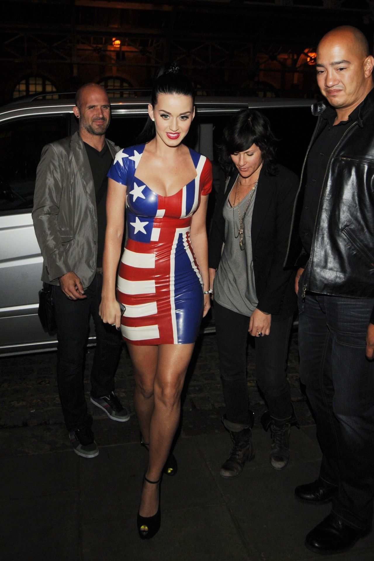 Певица Кэти Перри была замечена в Nobu Berkley в платье из ПВХ, на котором наполовину изображен американский флаг, а наполовину — Юнион Джек, в Лондоне, 12.06.2010.
