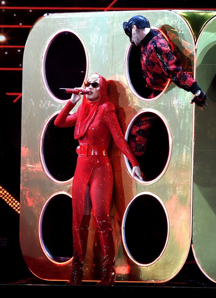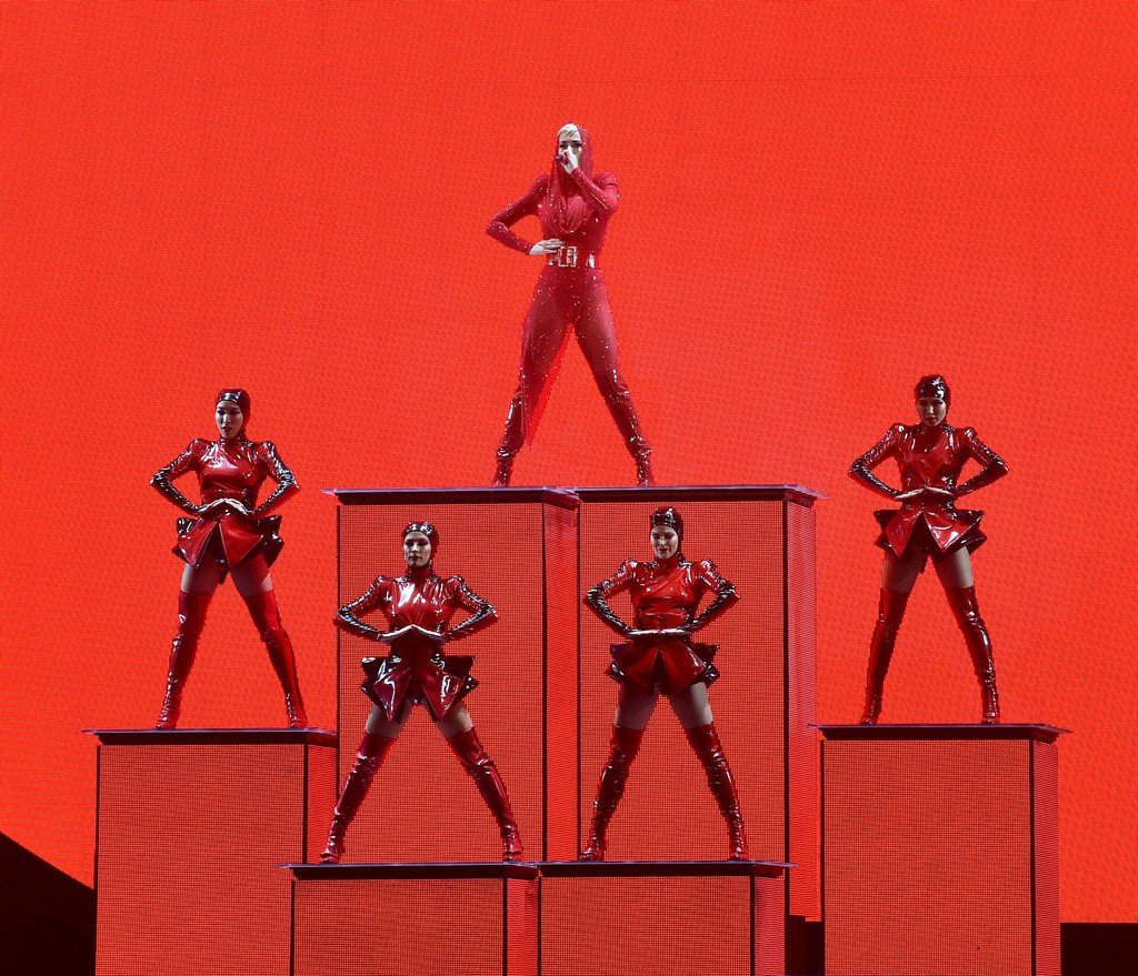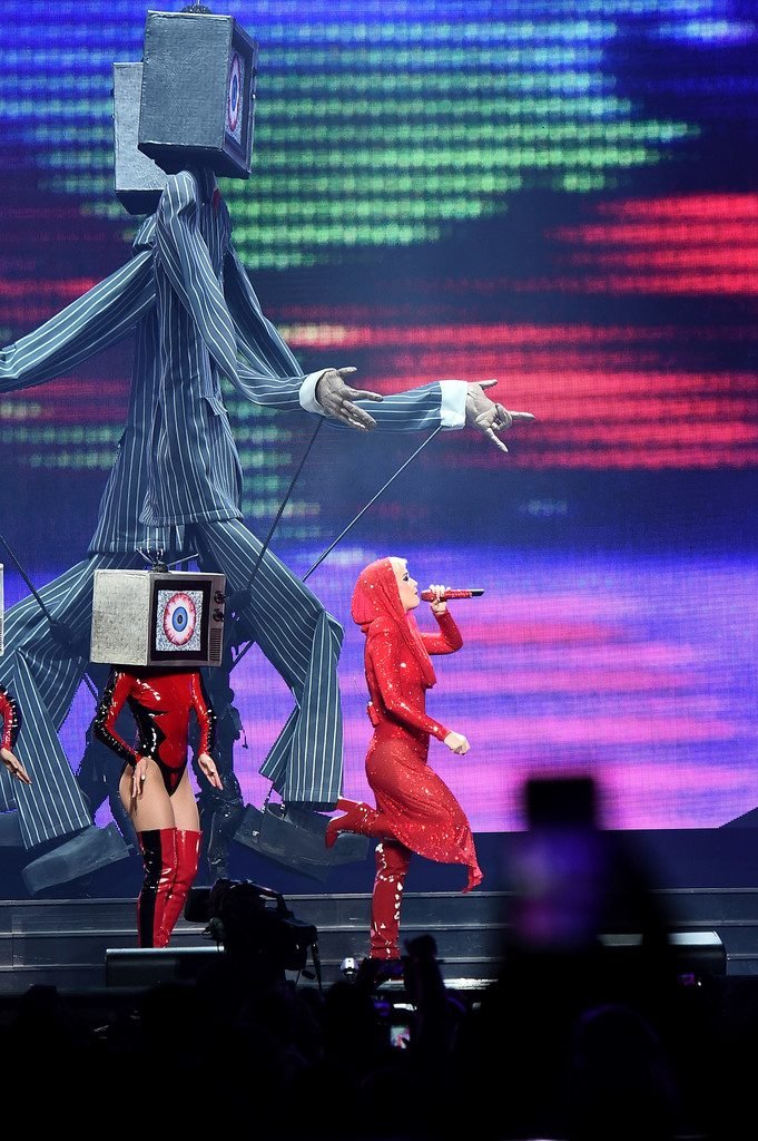 Красный наряд меня просто пугает до ужаса. KP пытается быть мусульманином или что-то в этом роде, с чем-то вроде хиджаба? И что за танцоры с телевизионными головами? И что за гигантские куклы Слендермена на заднем плане? Как будто что-то из детского кошмара.