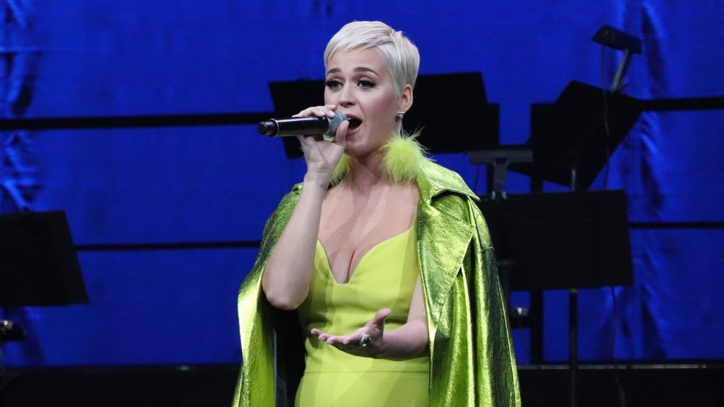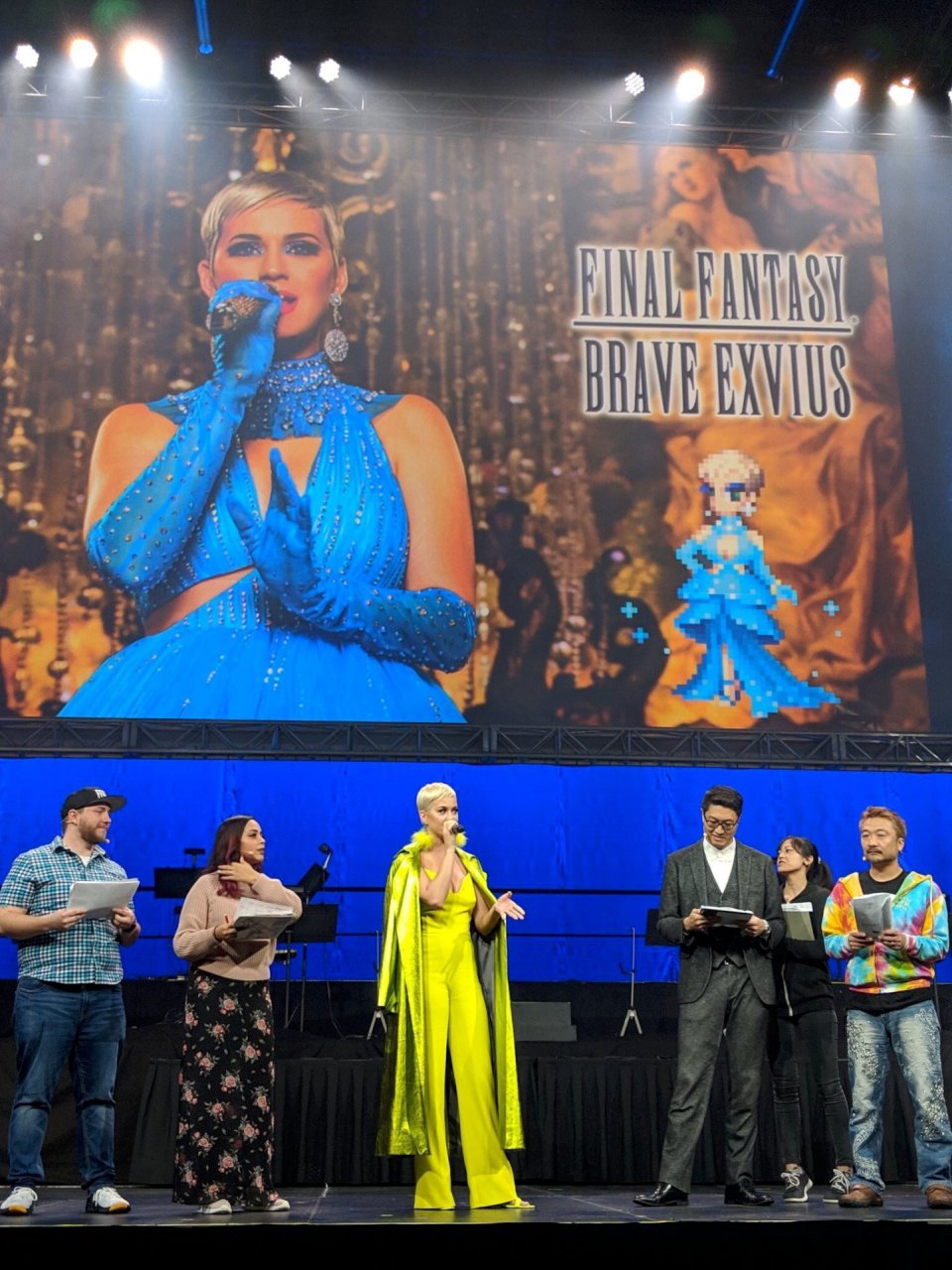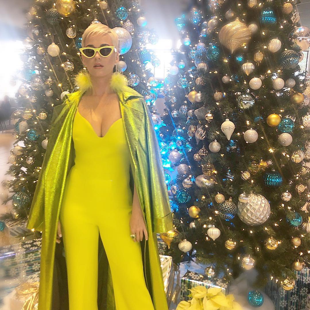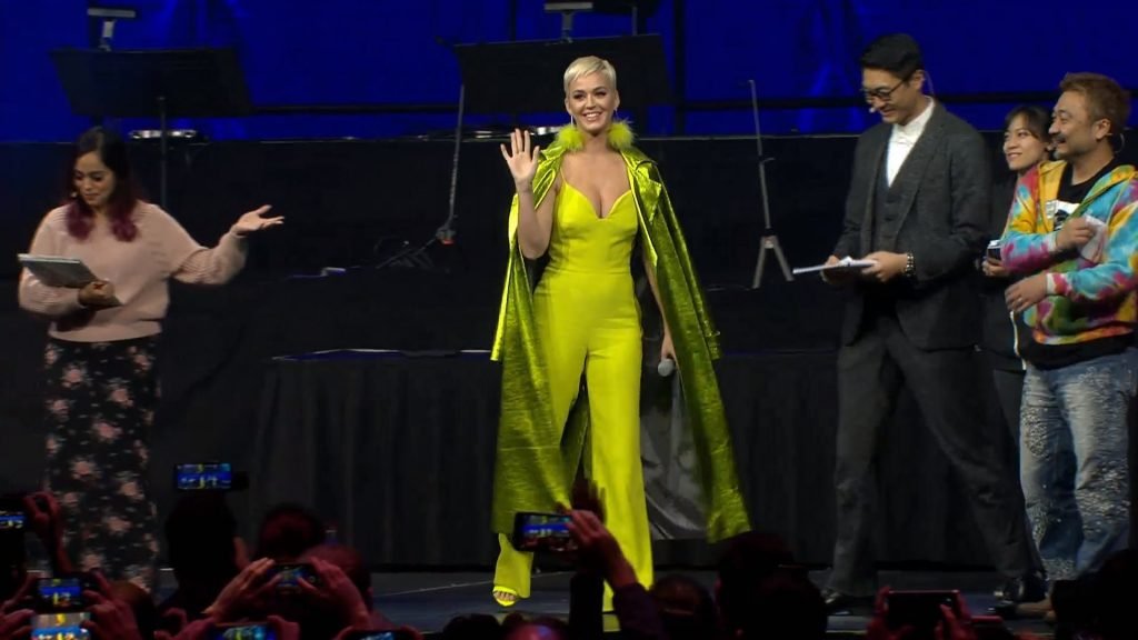 Певица Кэти Перри демонстрирует свое декольте в желтом наряде на FFBE Fan Festa 2018 в Лонг-Бич, 12.09.2018.
