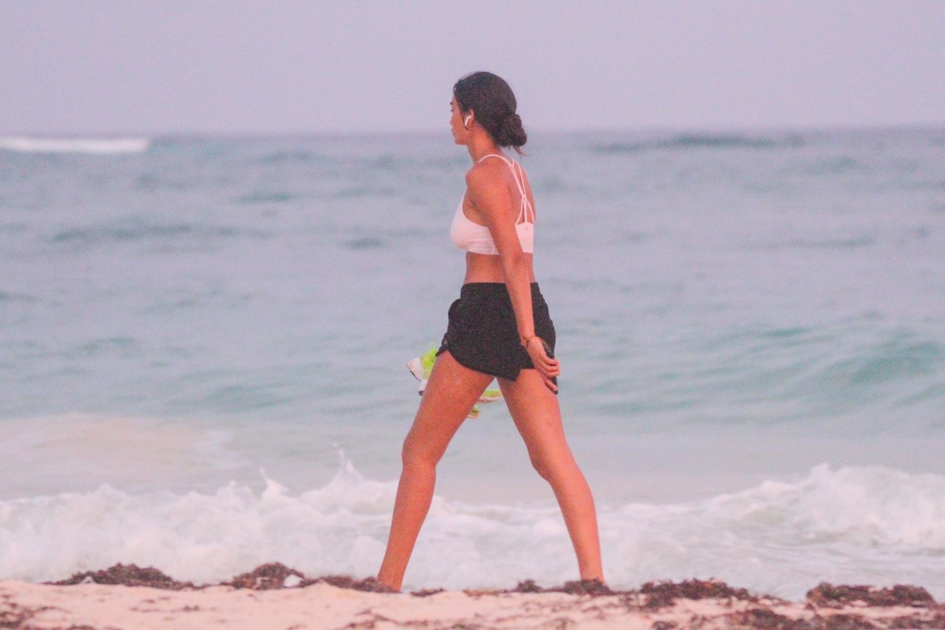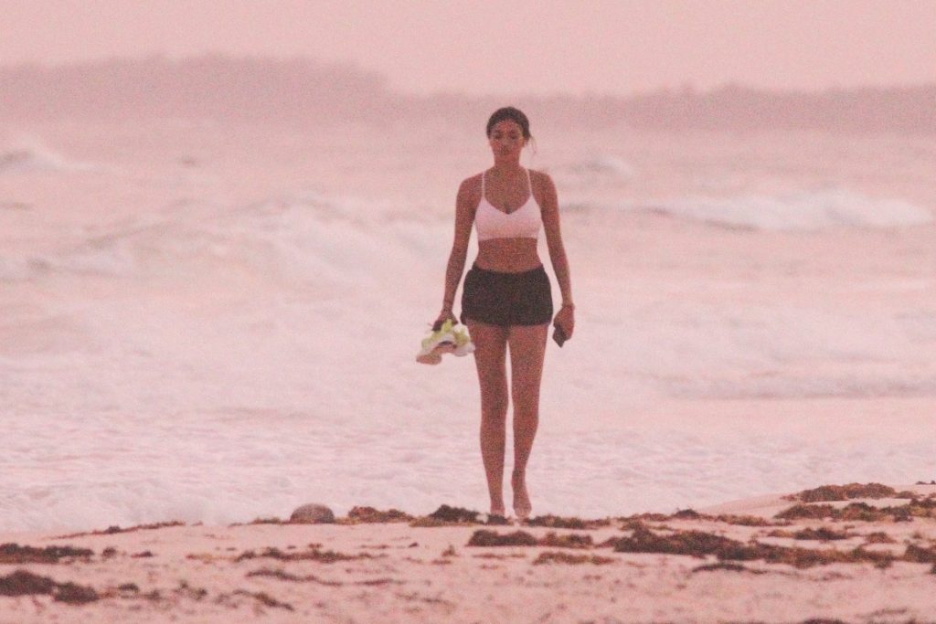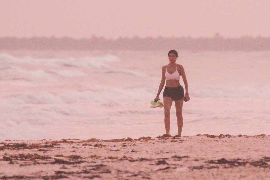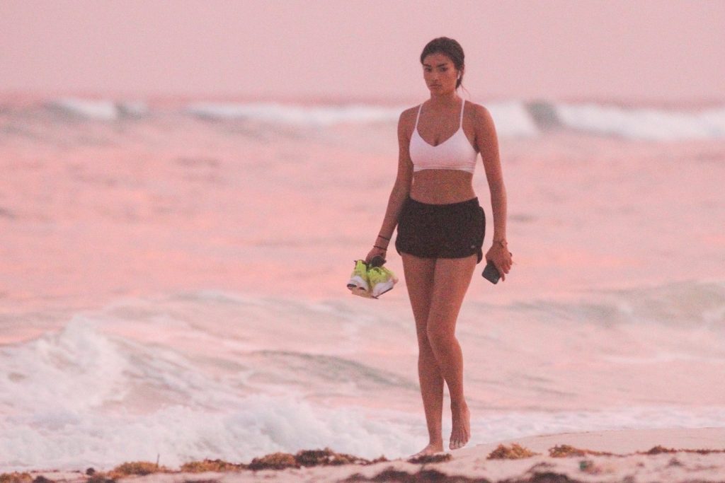 Модель Victoria’s Secret Келли Гейл наслаждается расслабляющей прогулкой в одиночестве по пляжу в Тулуме, Мексика, 13.12.2019. Шведско-австралийская модель несет обувь в руках, прогуливаясь по песку после вечерней пробежки во время отпуска на юге от границы.